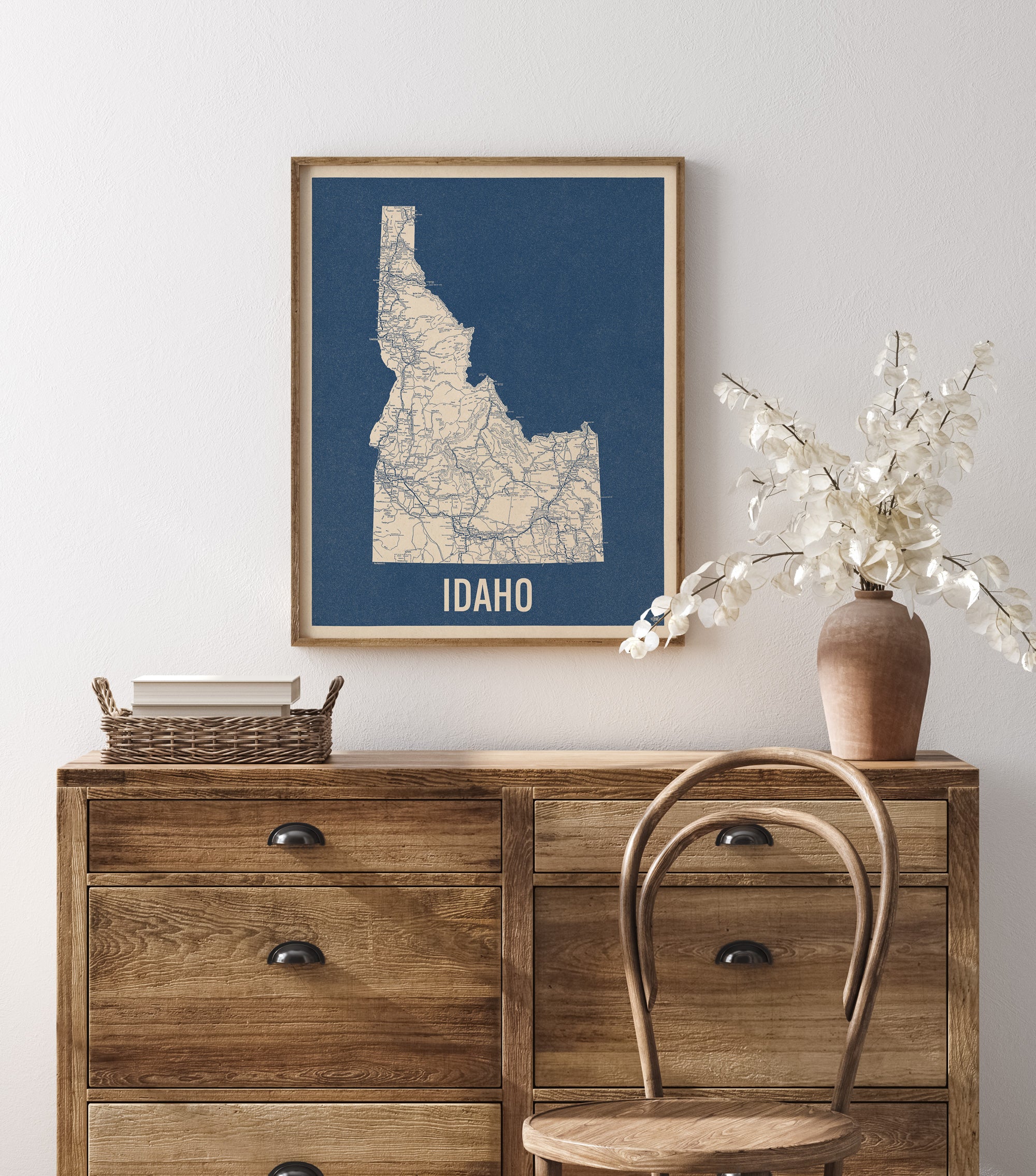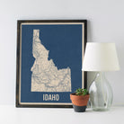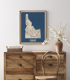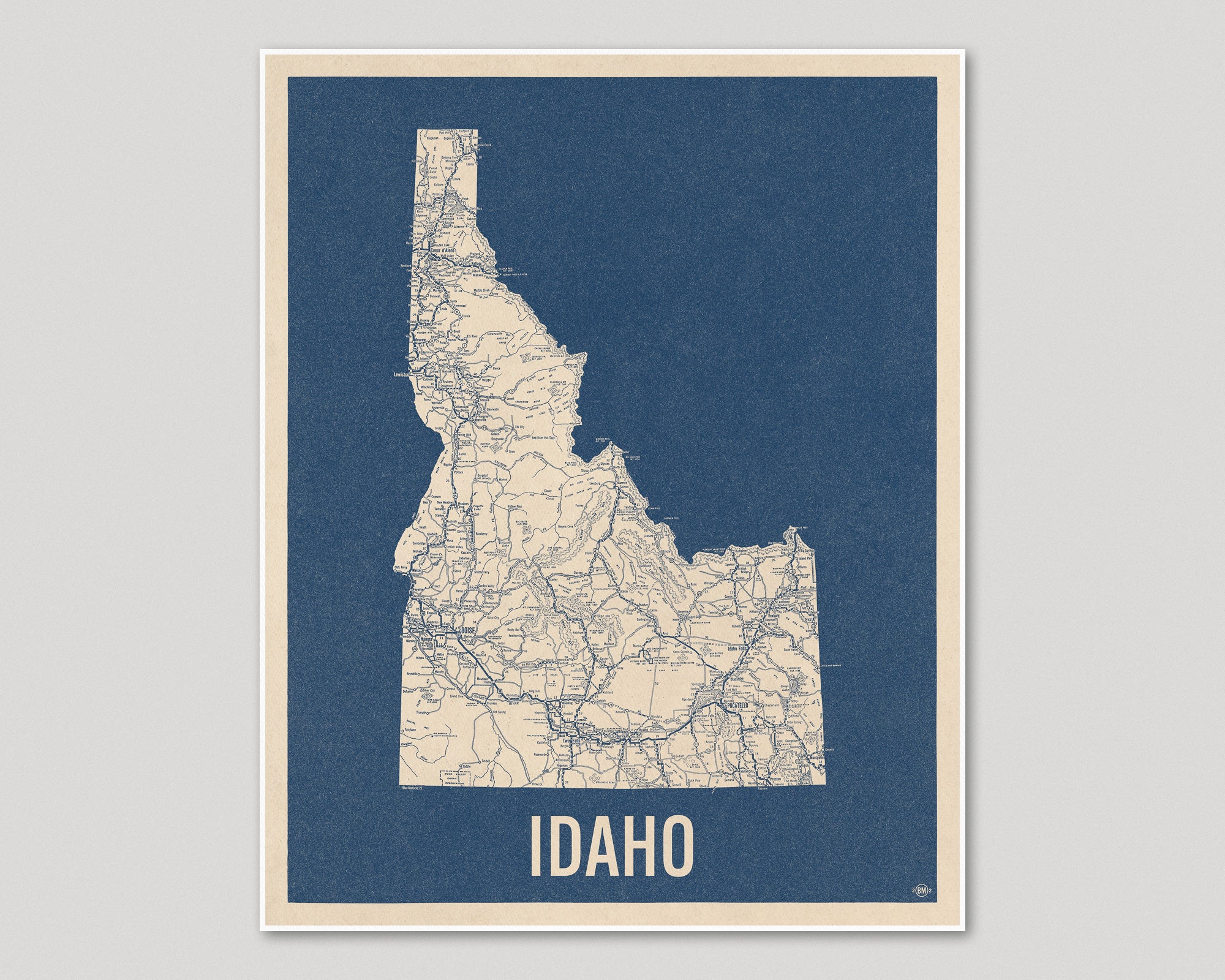Archival art print based on a vintage 1930s highway map of Idaho, blue on beige.