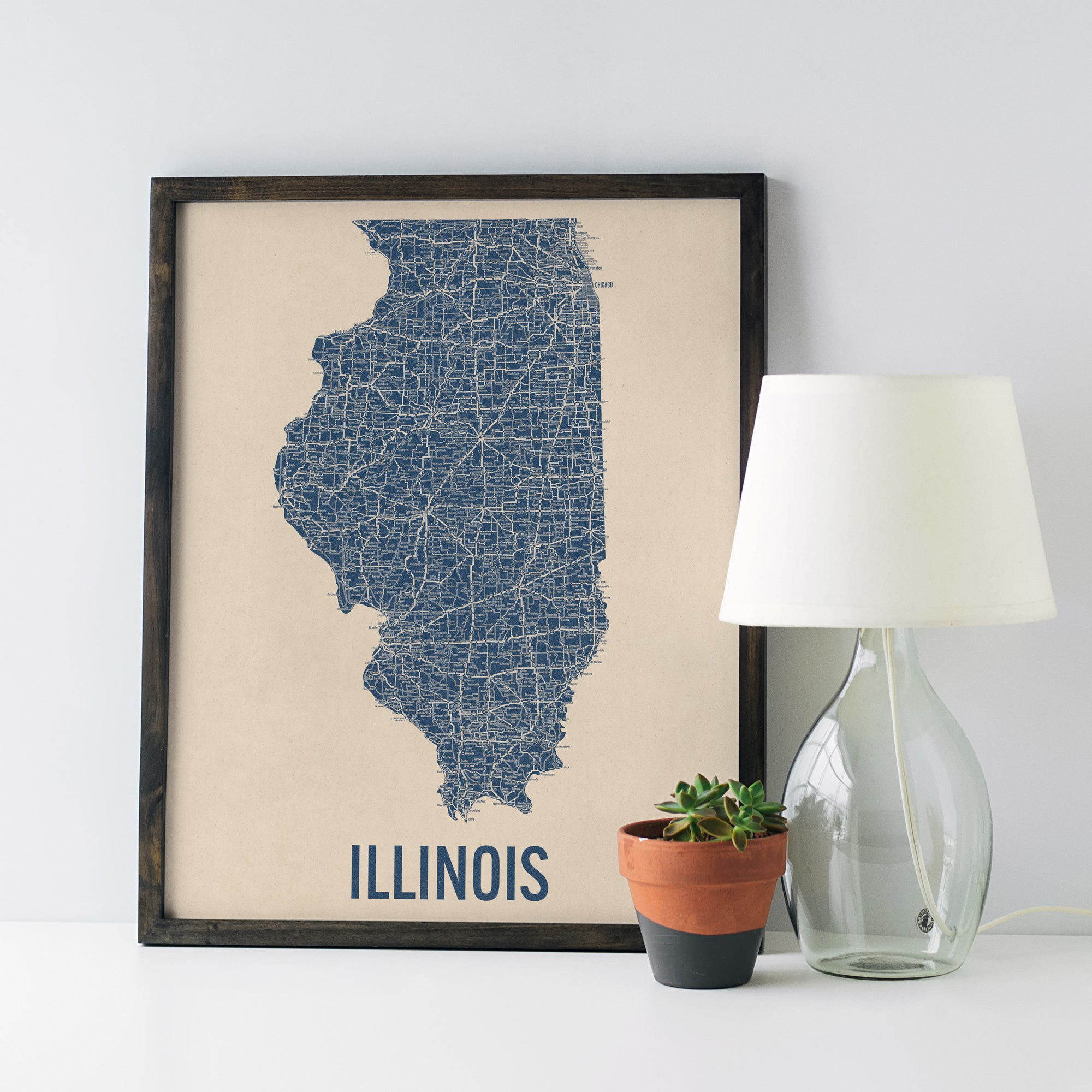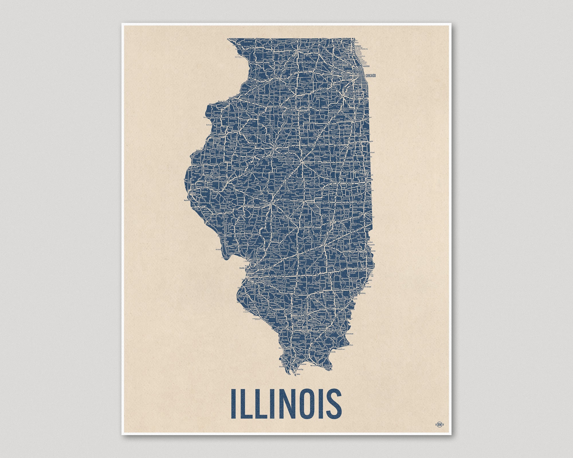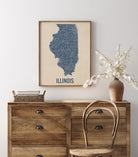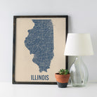 Archival art print based on a vintage 1930s highway map of Illinois, blue on beige.