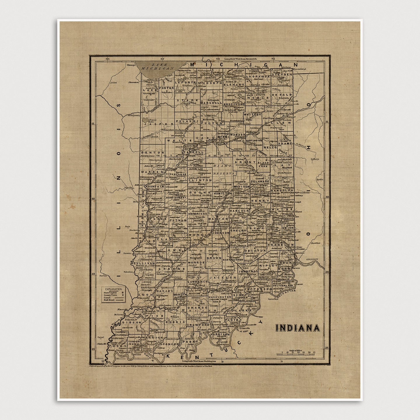 Archival print reproduction of an antique map of Indiana from 1842 by Sidney Morse and Samuel Breese.