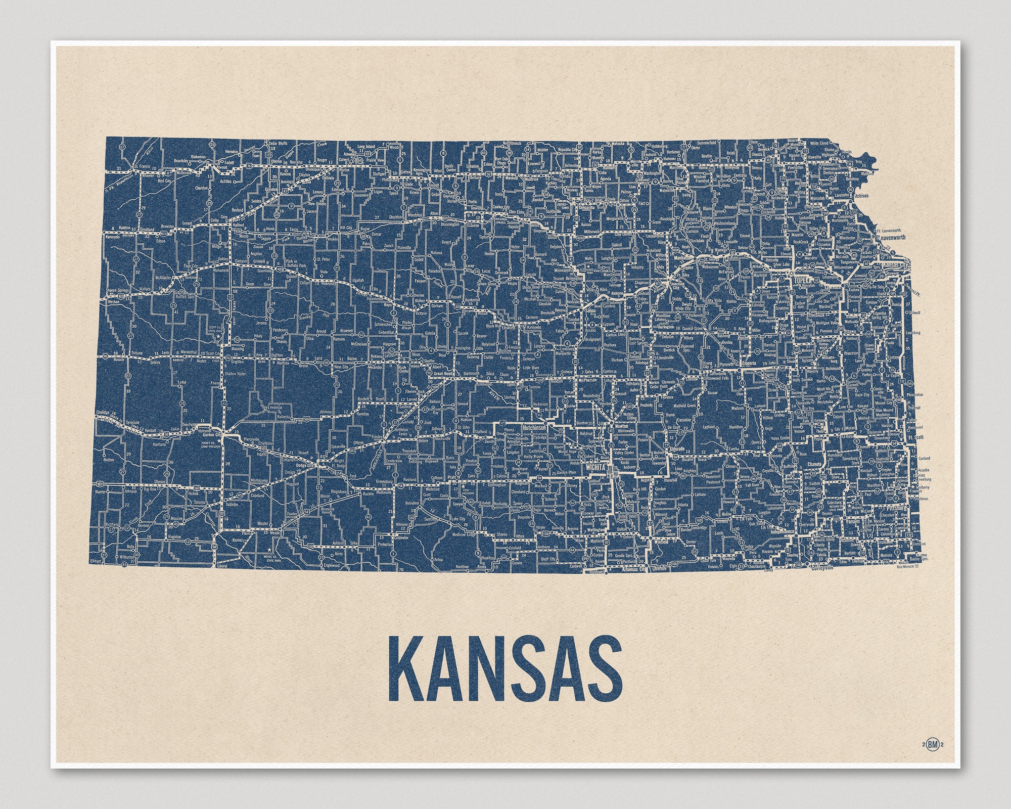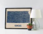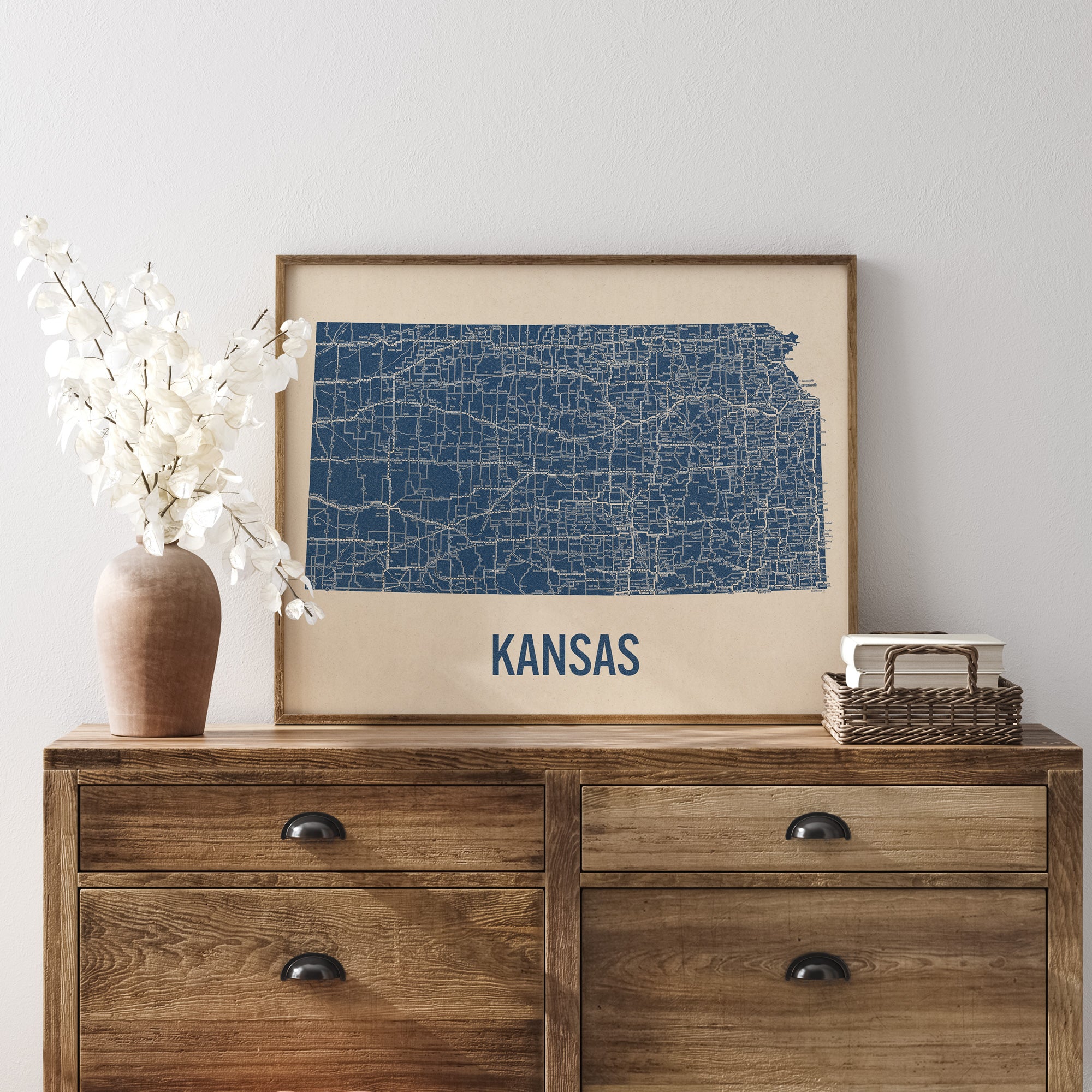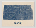 Archival art print based on a vintage 1930s highway map of Kansas, blue on beige.