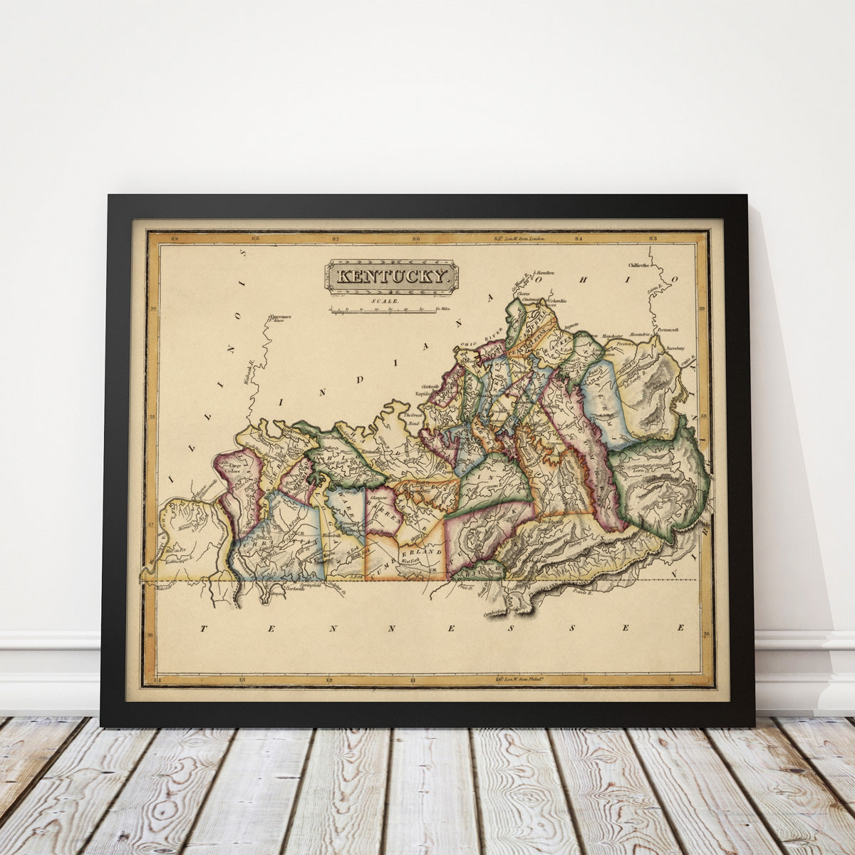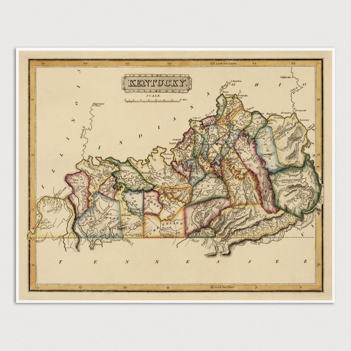 Archival print reproduction of an antique map of Kentucky from c1817 by Fielding Lucas.