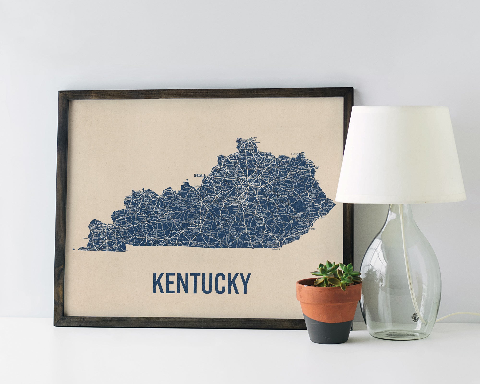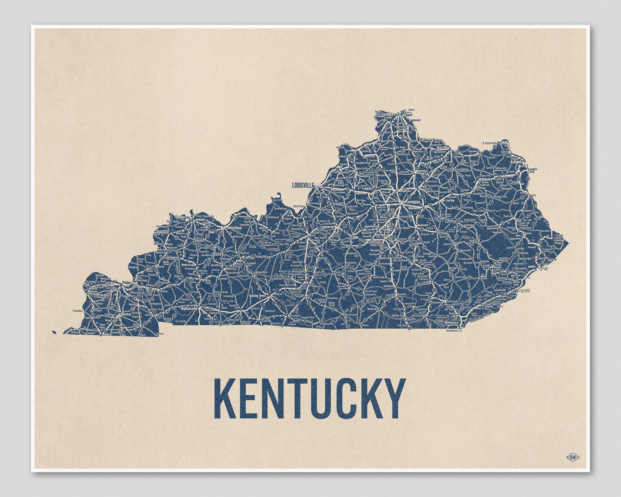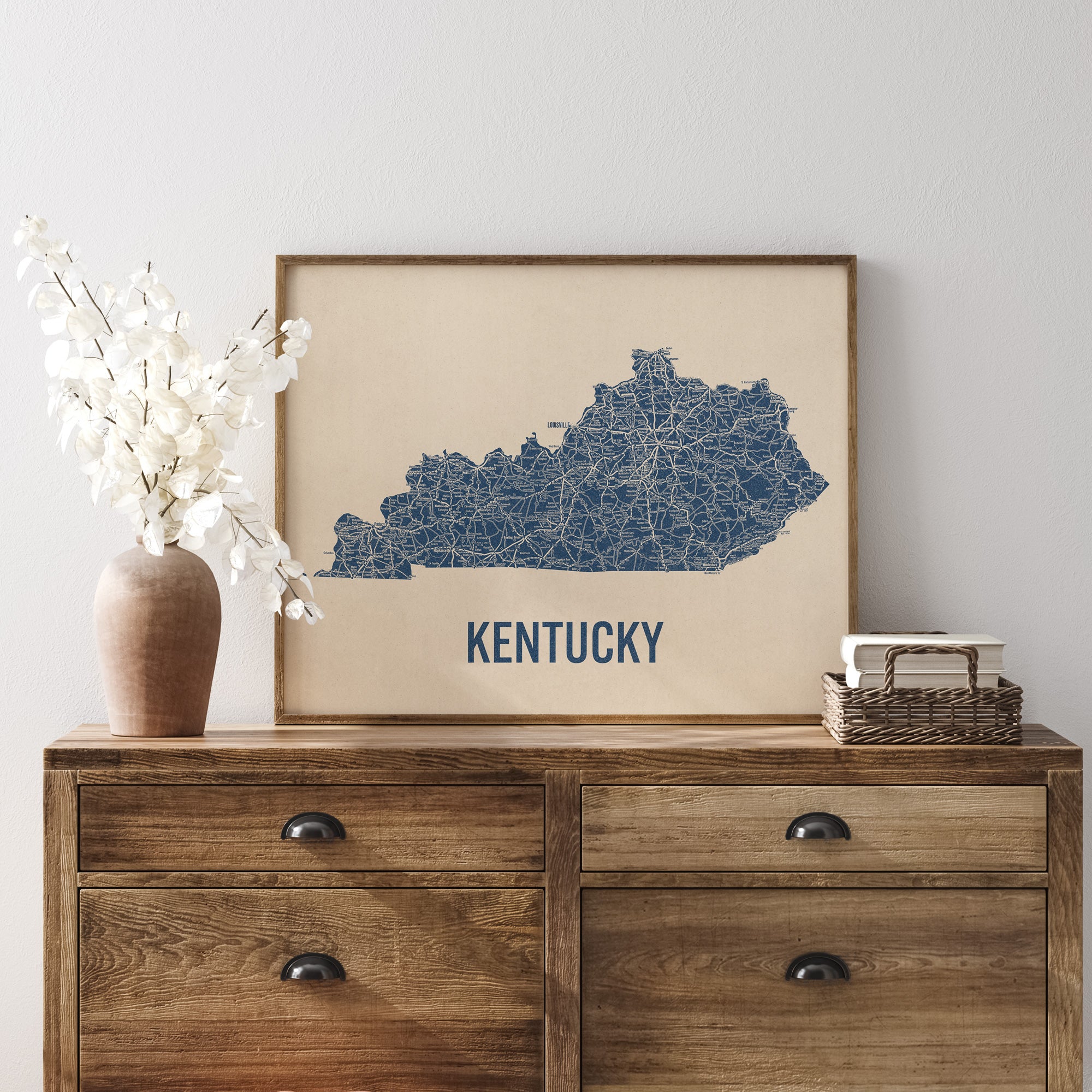Archival art print based on a vintage 1930s highway map of Kentucky, blue on beige.