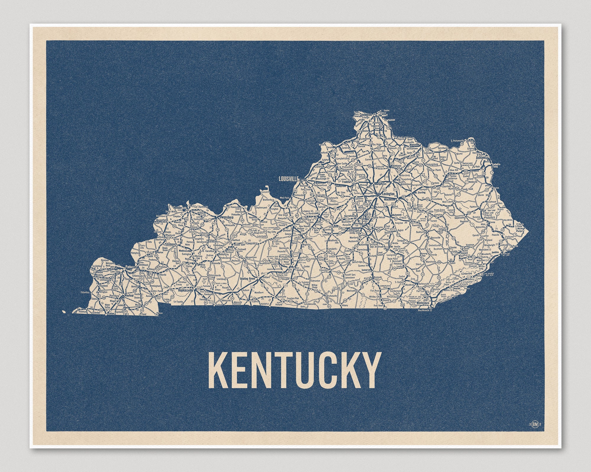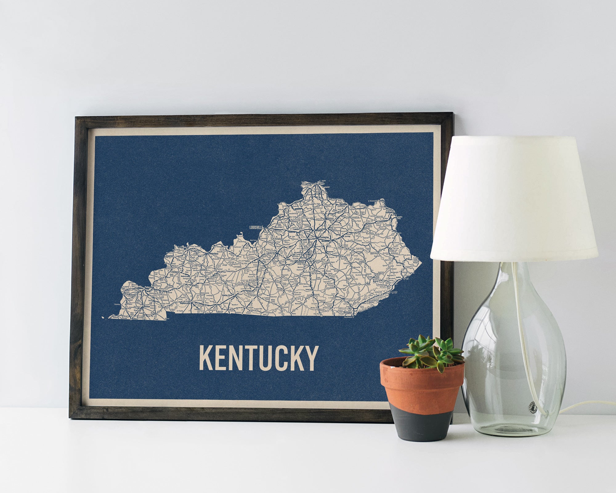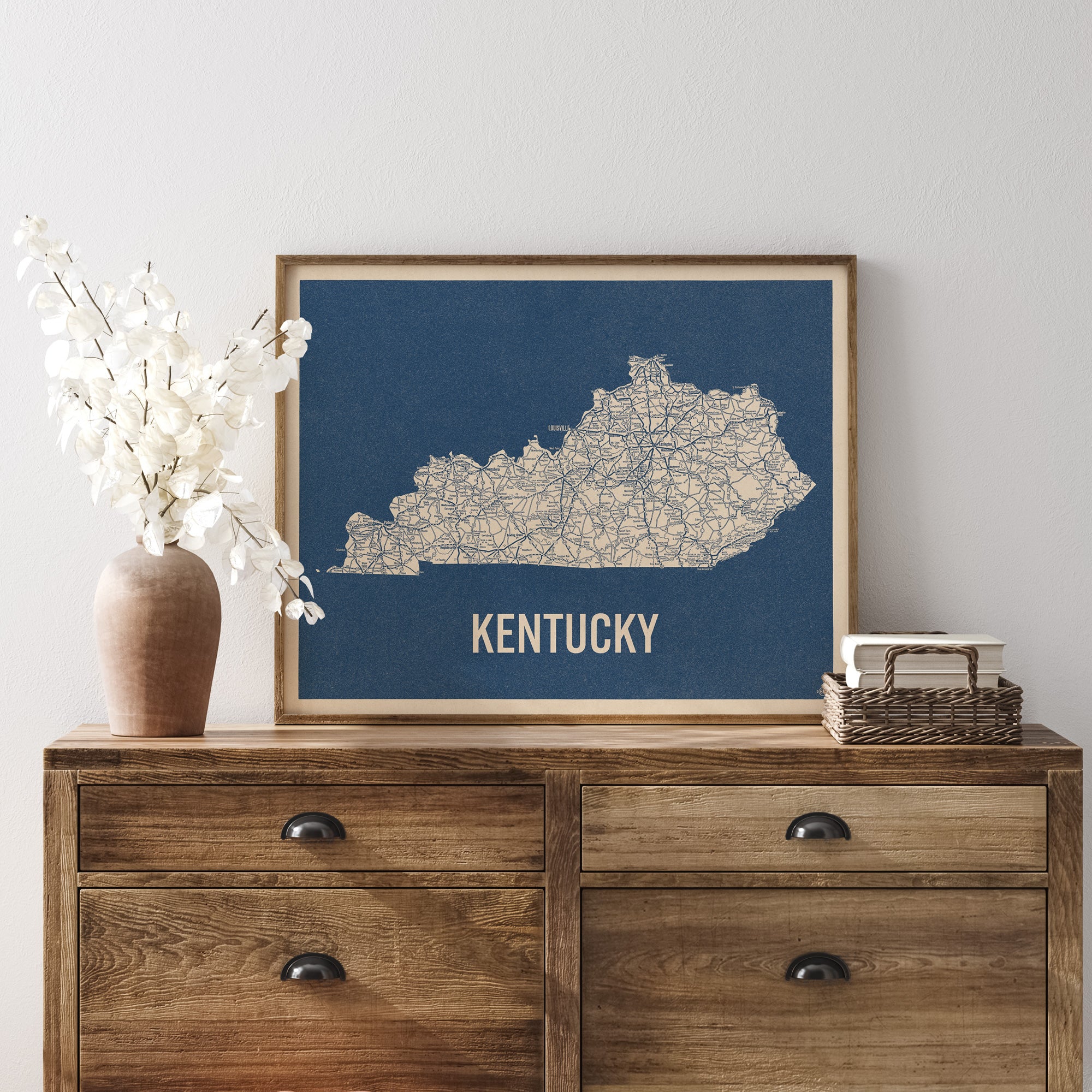Archival art print based on a vintage 1930s highway map of Kentucky, blue on beige.