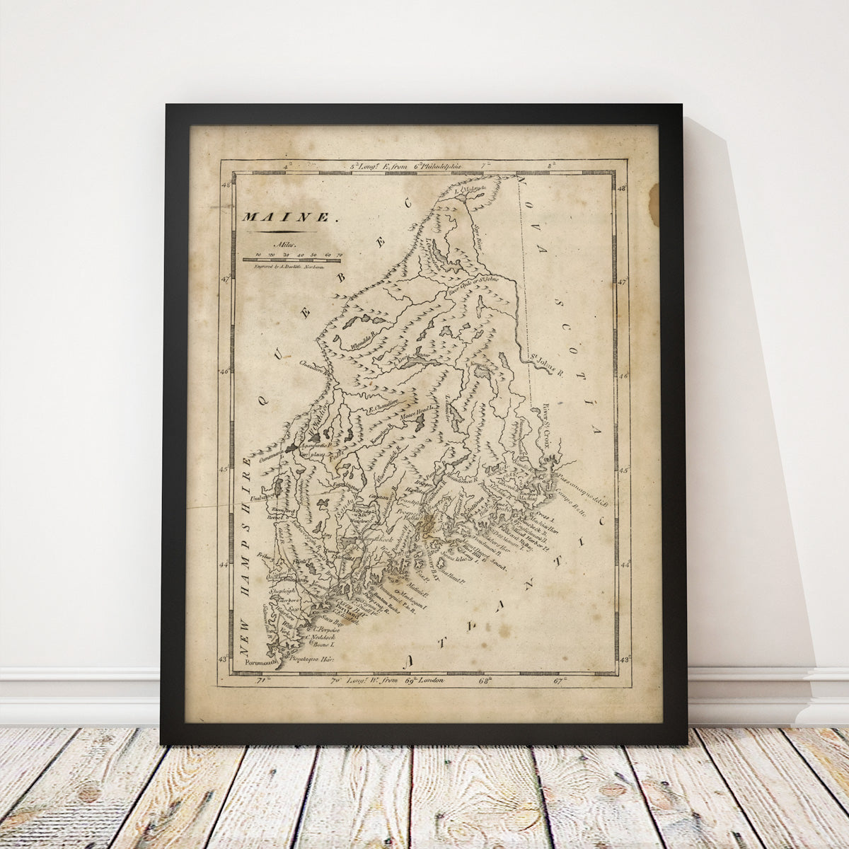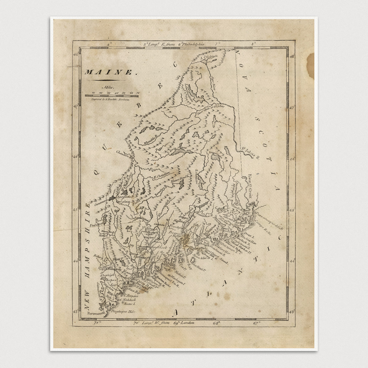 Archival print reproduction of an antique map of Maine from 1816 by Mathew Carey.