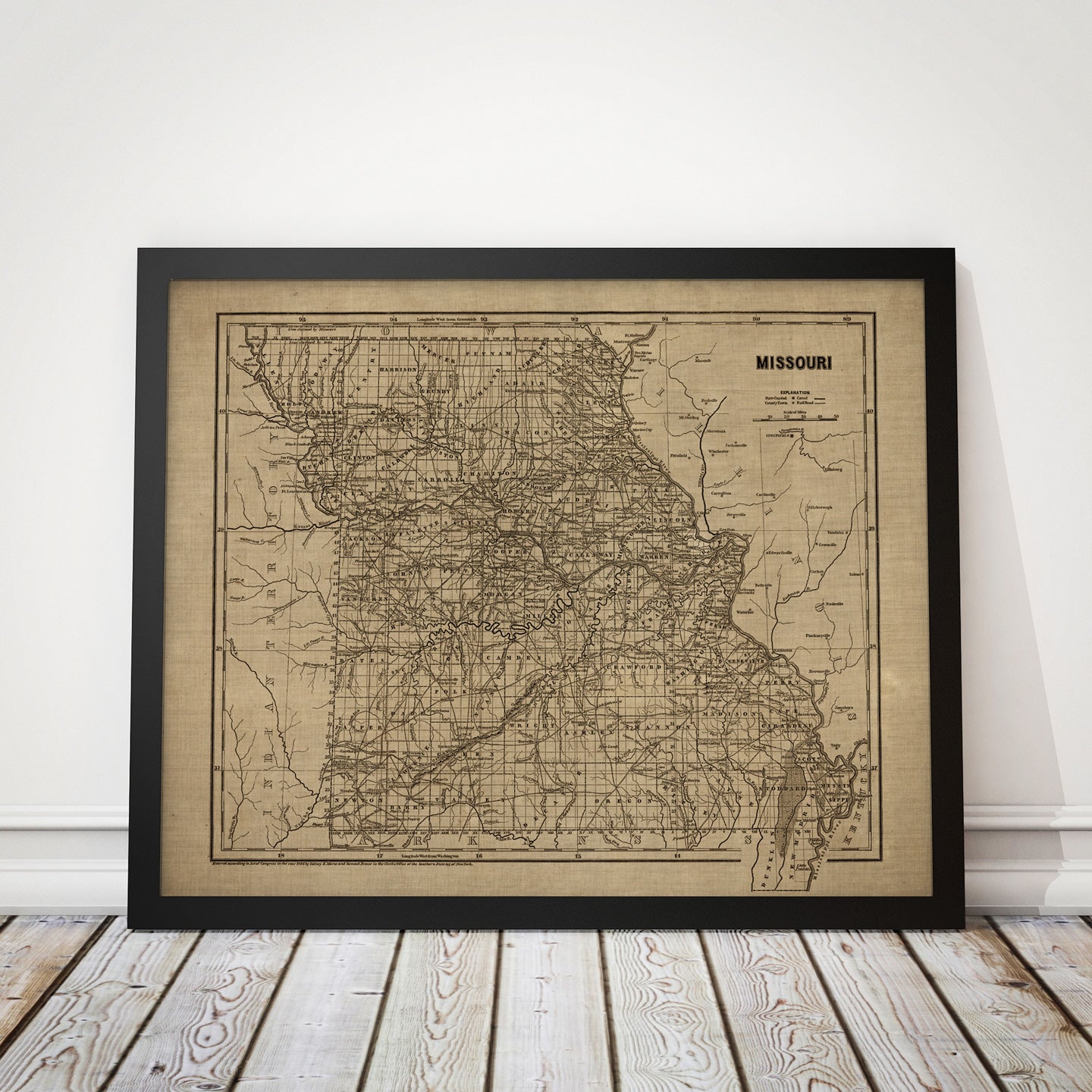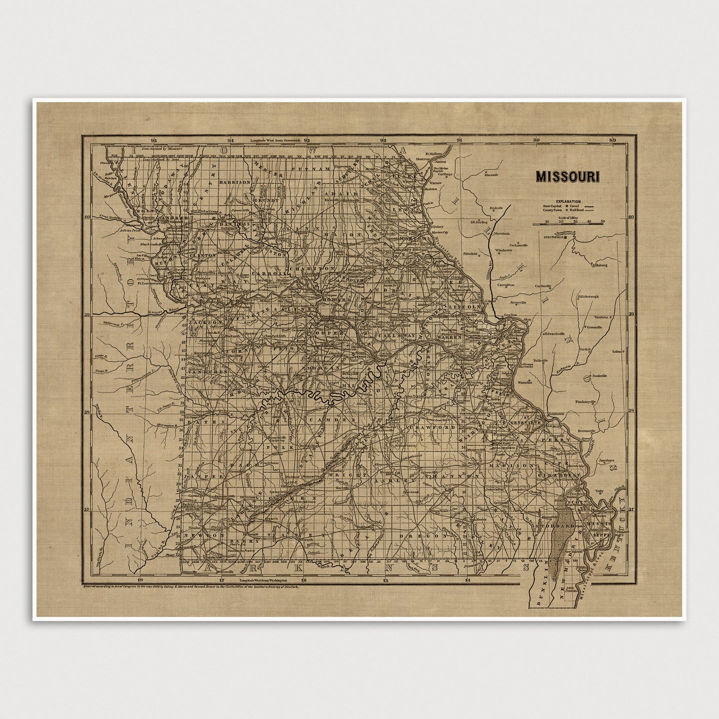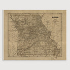 Archival print reproduction of an antique map of Missouri from 1842 by Sidney Morse and Samuel Breese.