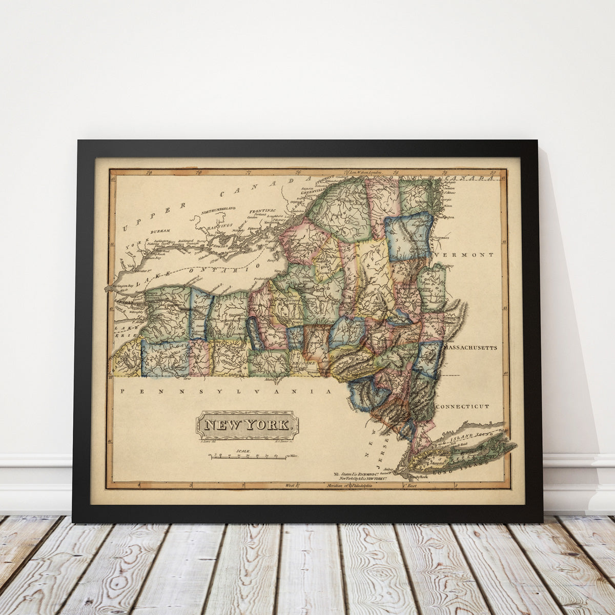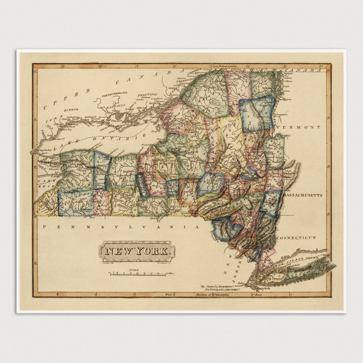 Archival print reproduction of an antique map of New York State from c1817 by Fielding Lucas.