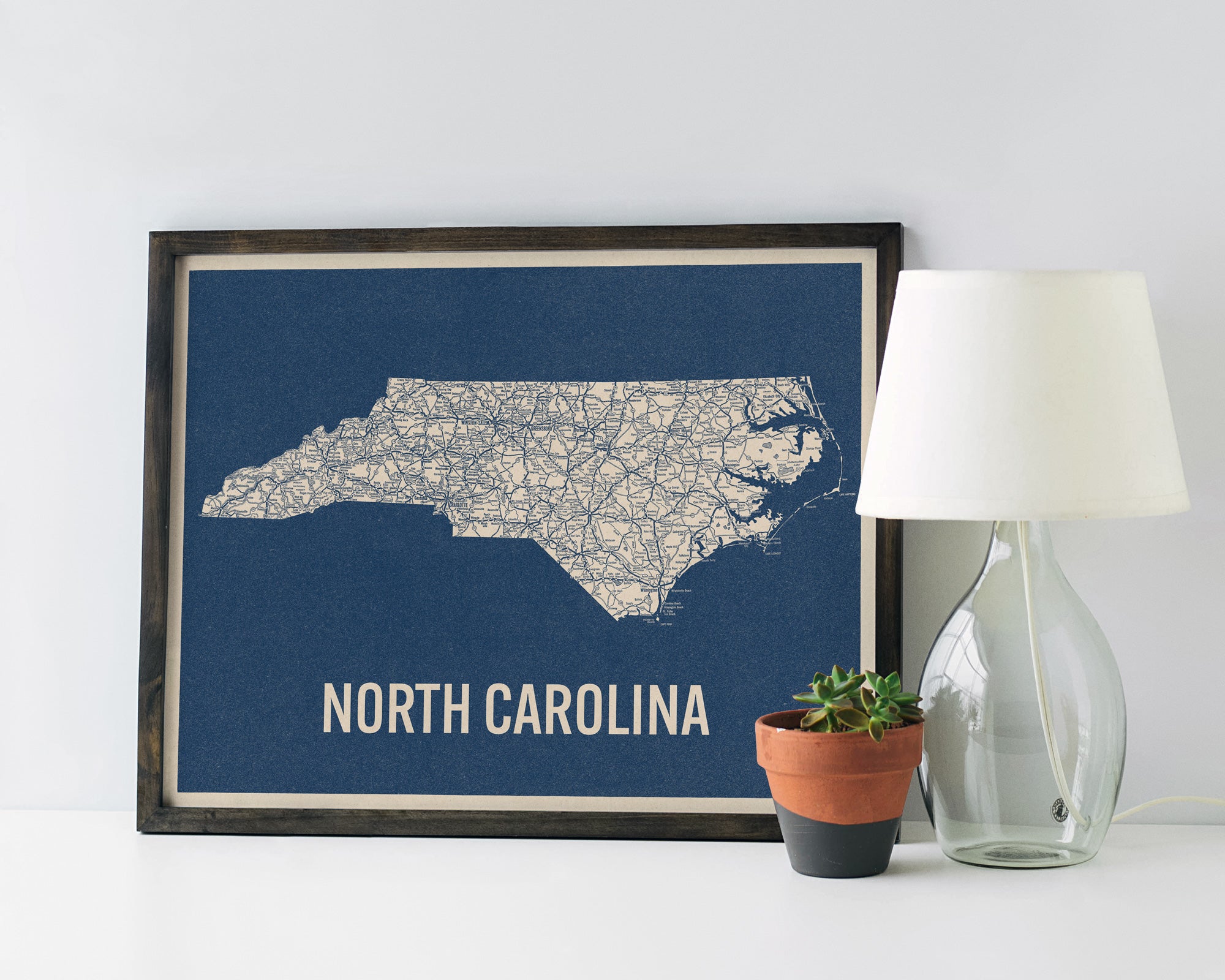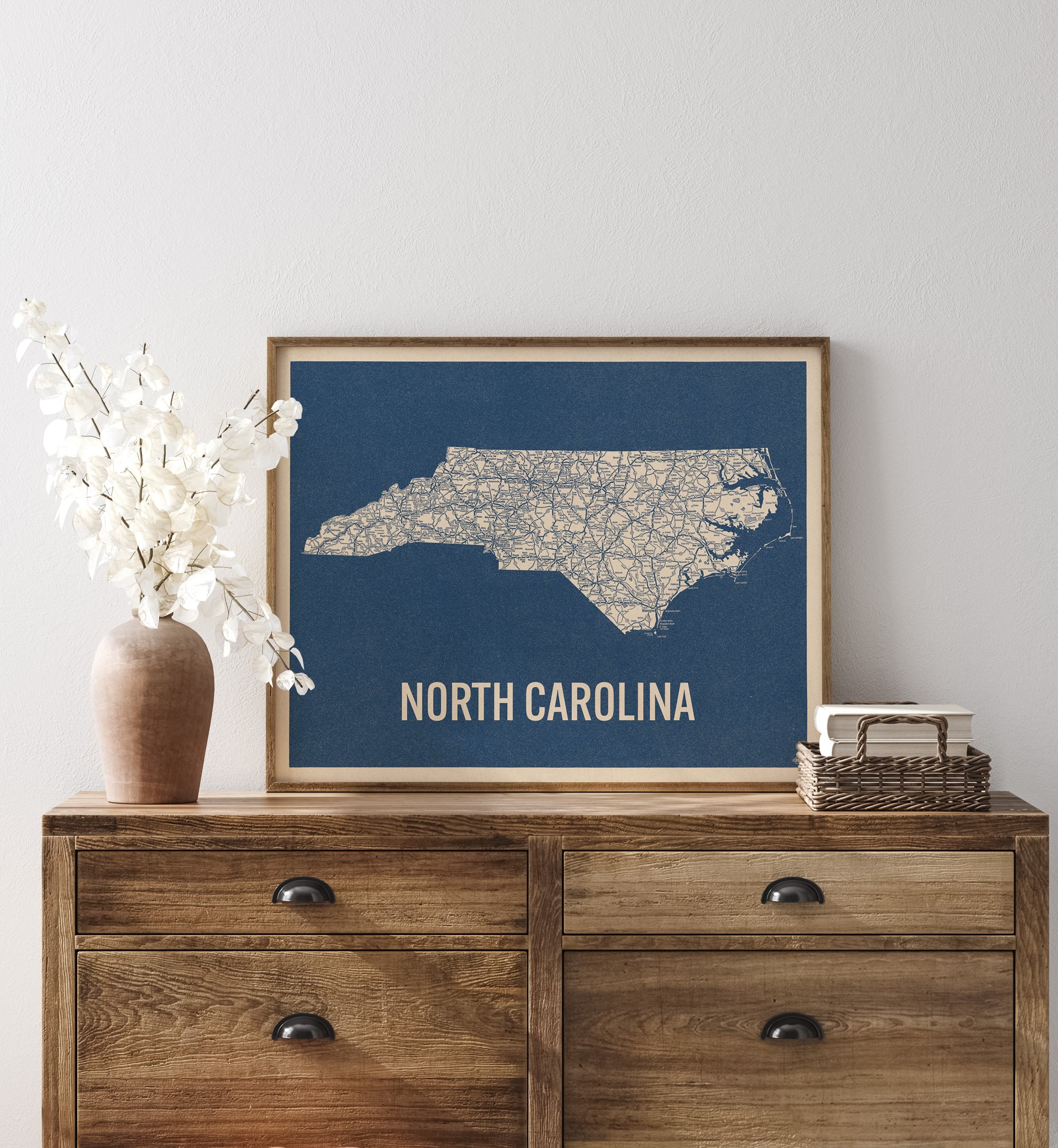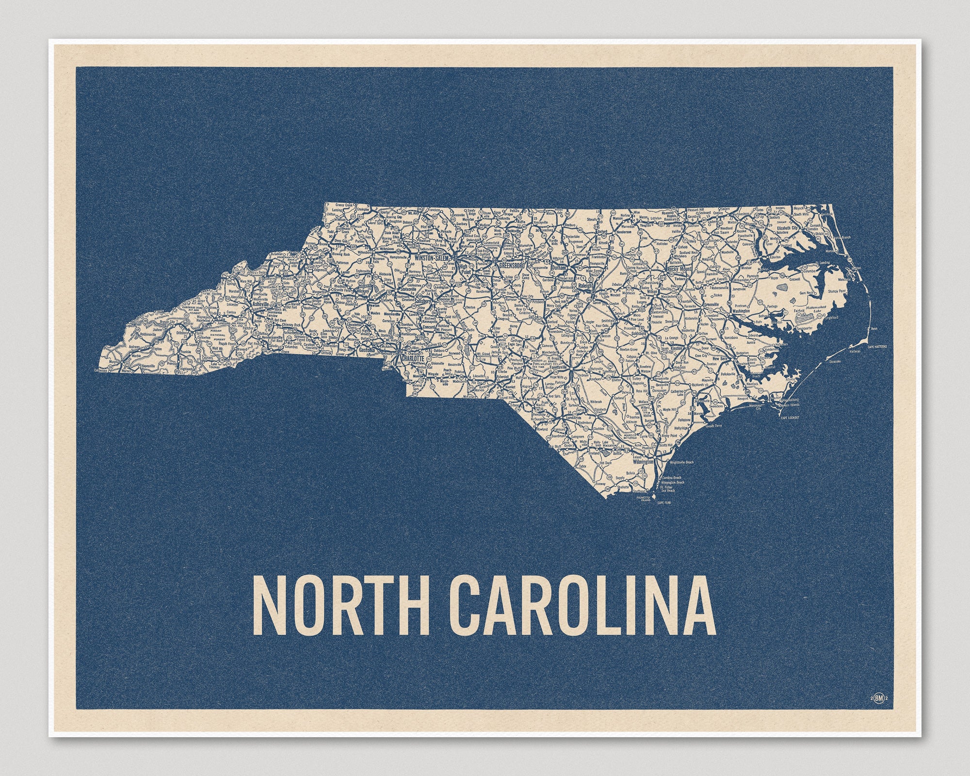 Archival art print based on a vintage 1930s highway map of North Carolina, blue on beige.