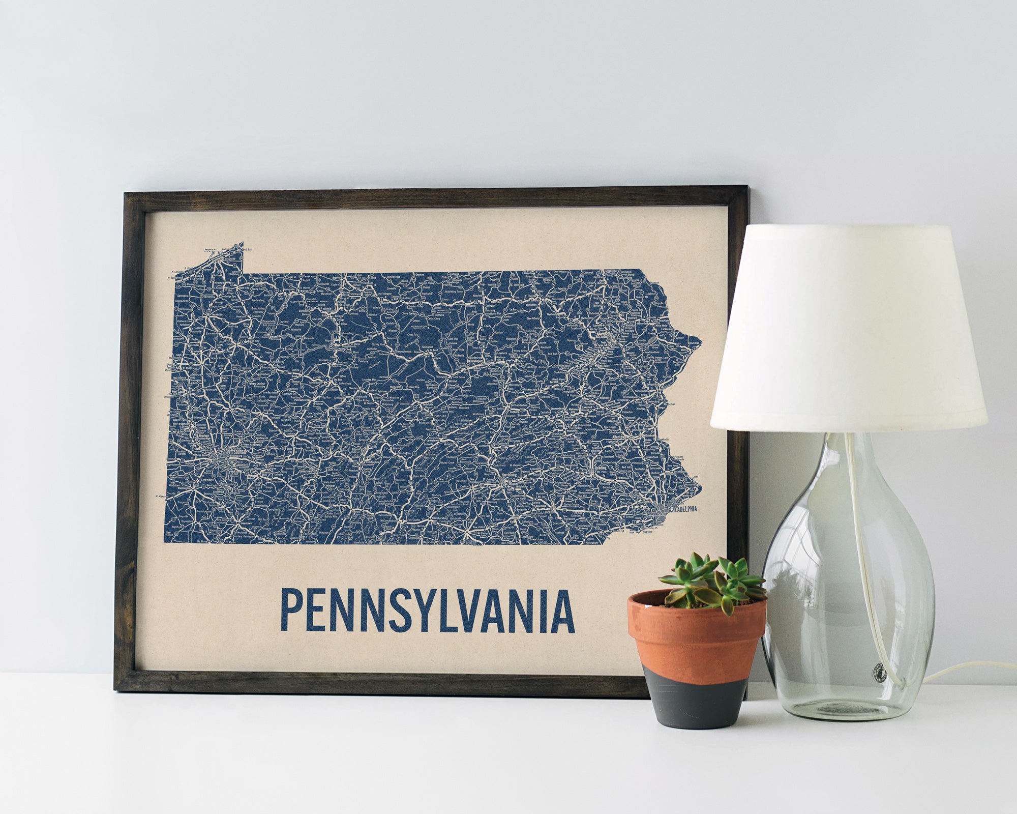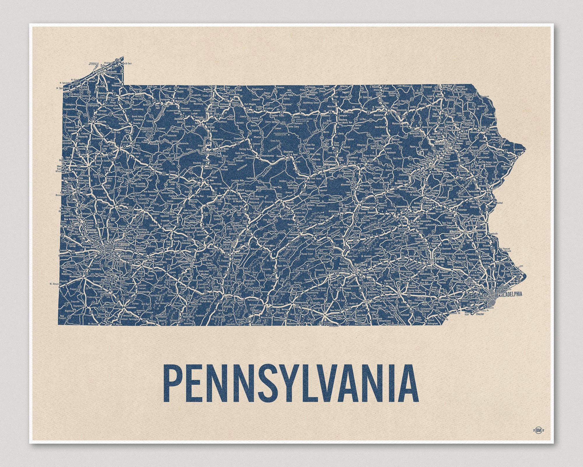 Archival art print based on a vintage 1930s highway map of Pennsylvania, blue on beige.