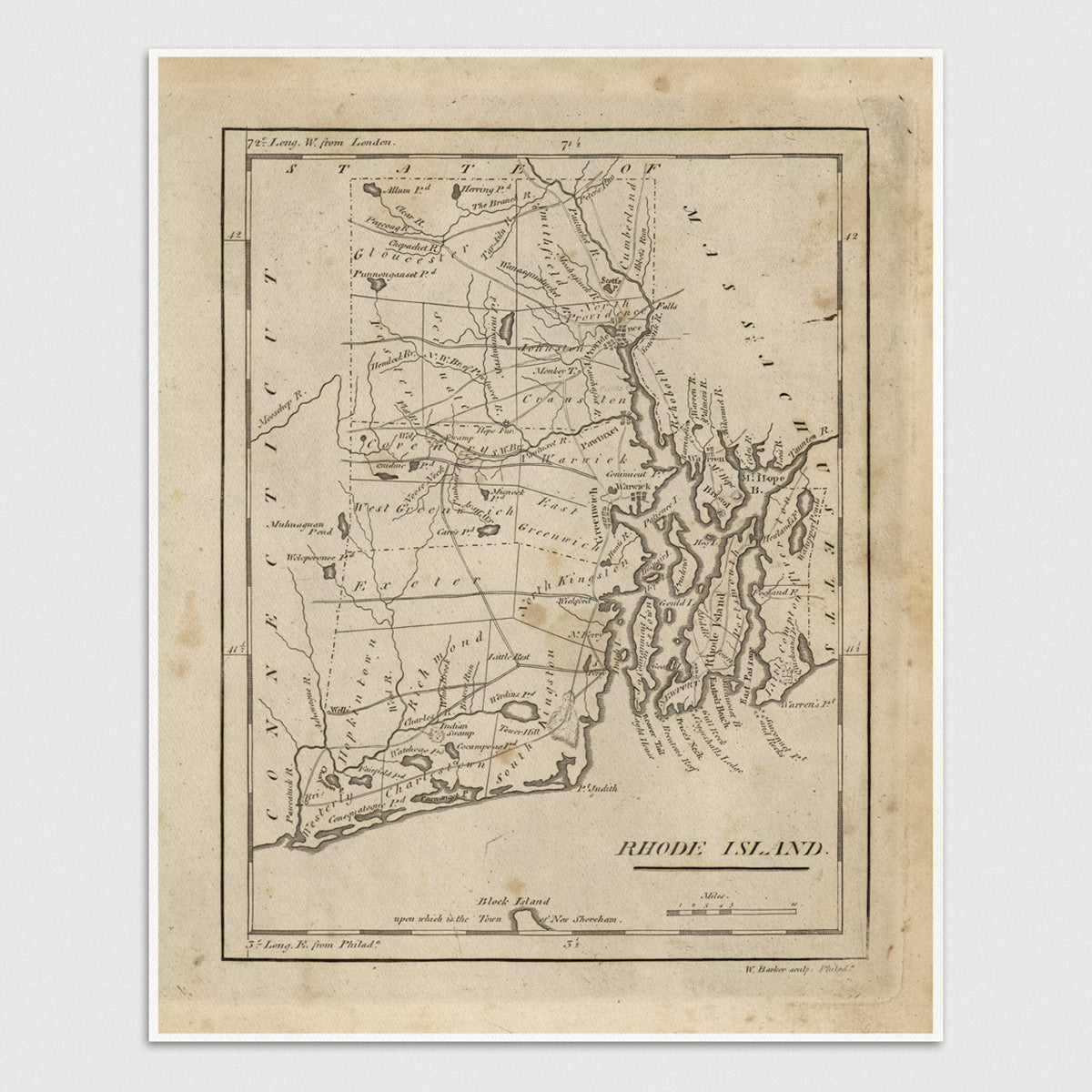 Archival print reproduction of an antique map of Rhode Island from 1816 by Mathew Carey.