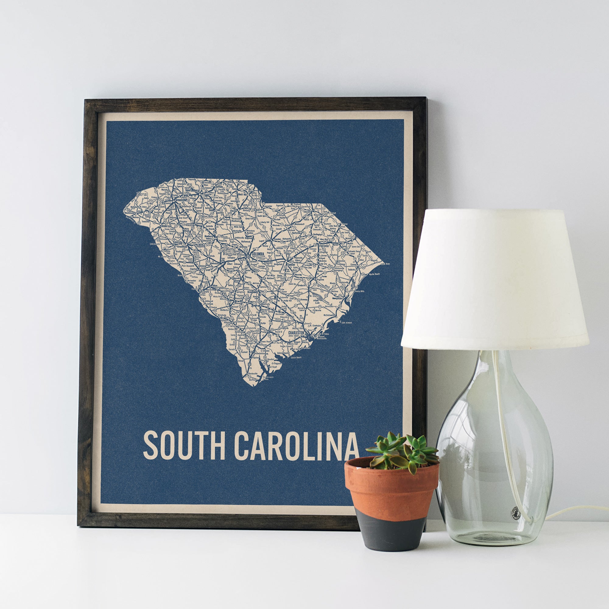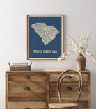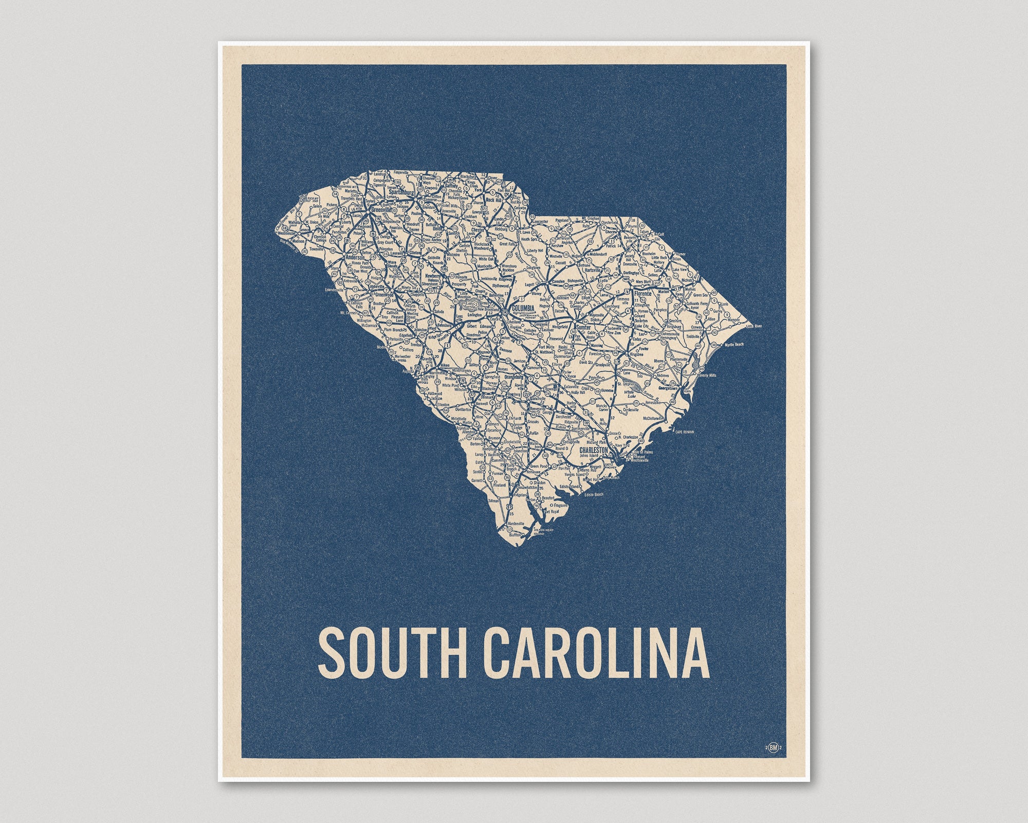 Archival art print based on a vintage 1930s highway map of South Carolina, blue on beige.