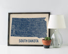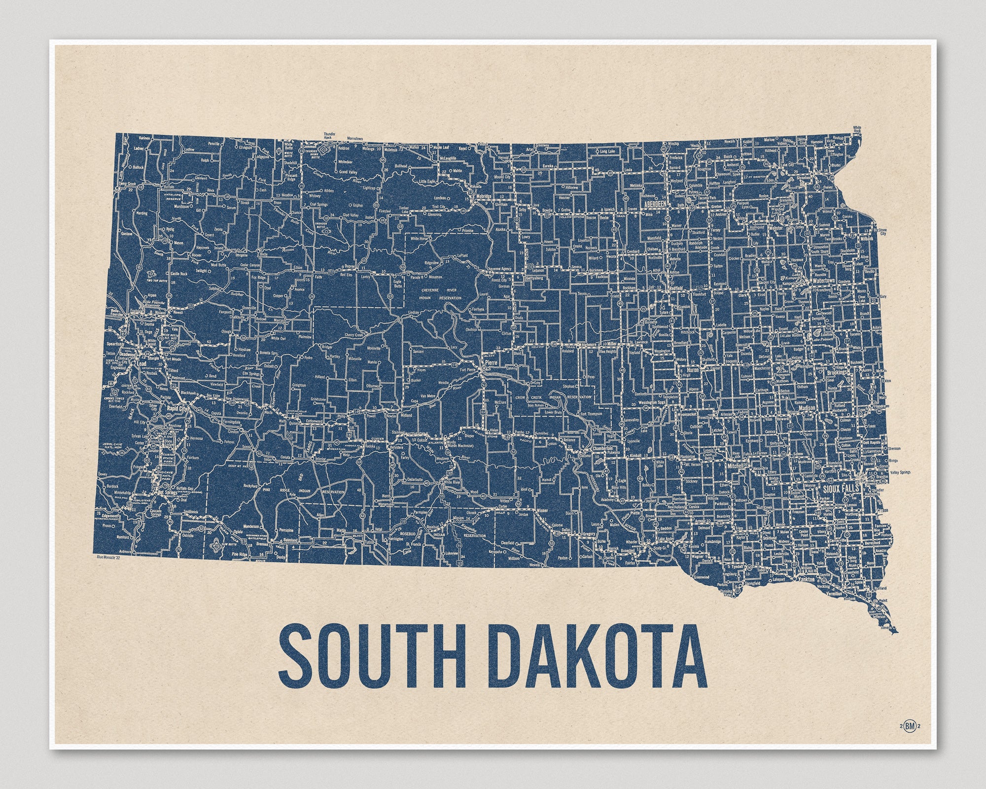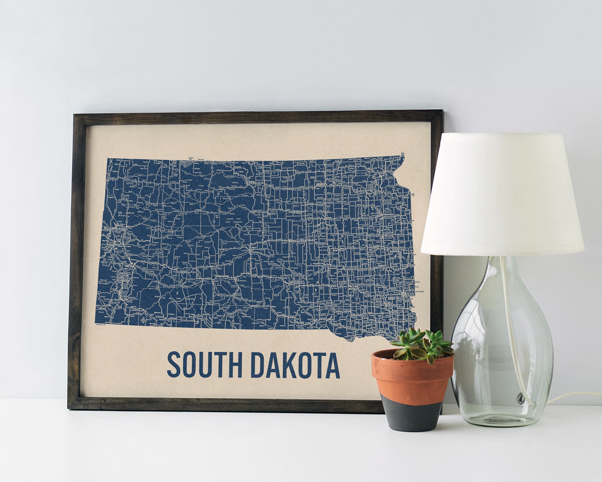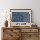 Archival art print based on a vintage 1930s highway map of South Dakota, blue on beige.