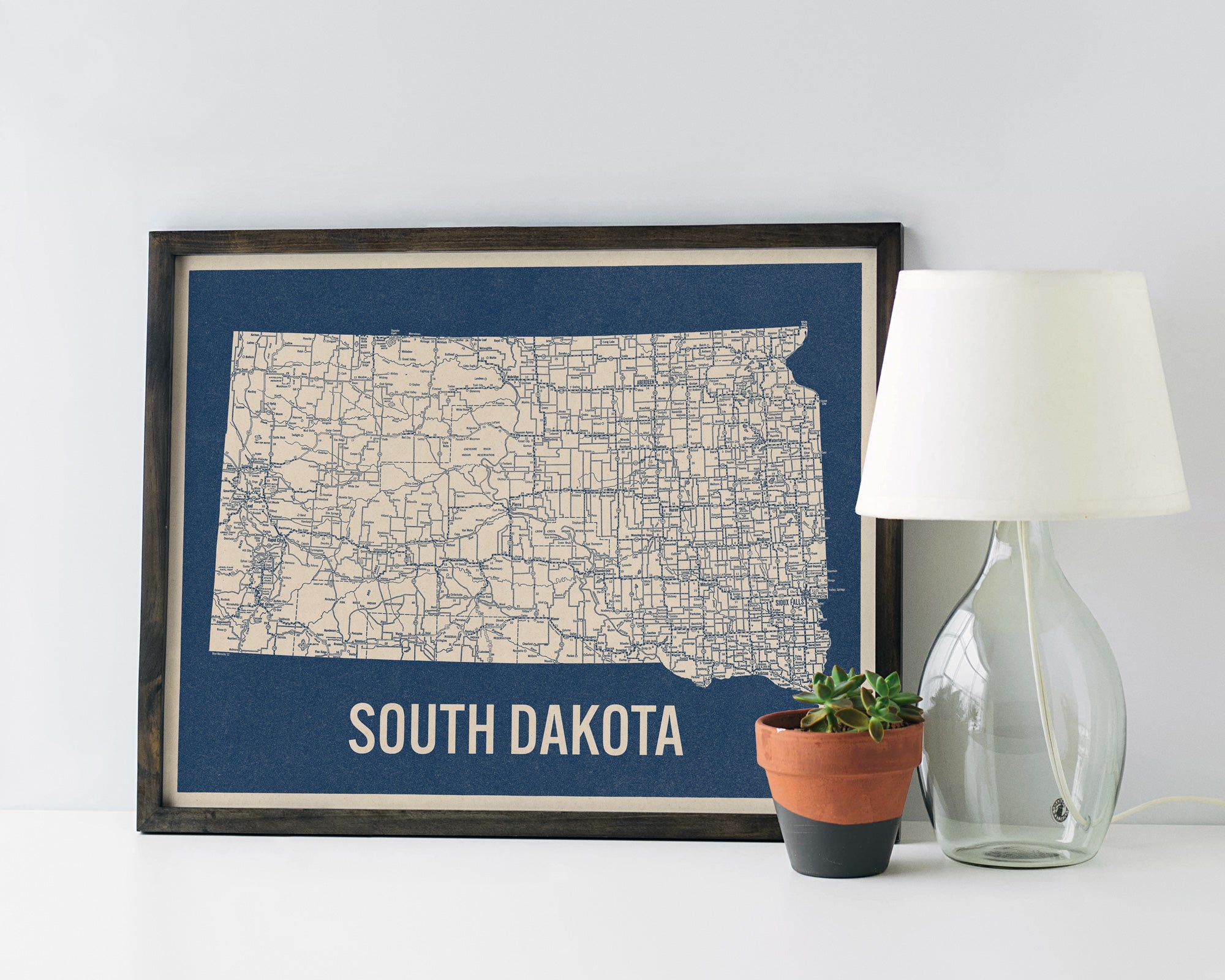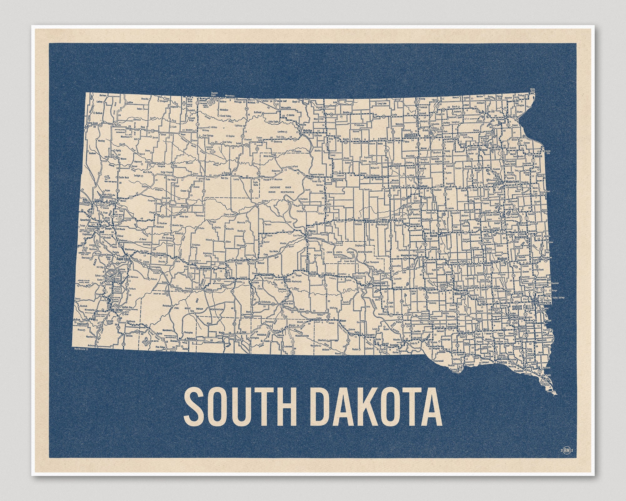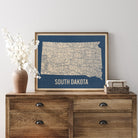 Archival art print based on a vintage 1930s highway map of South Dakota, blue on beige.