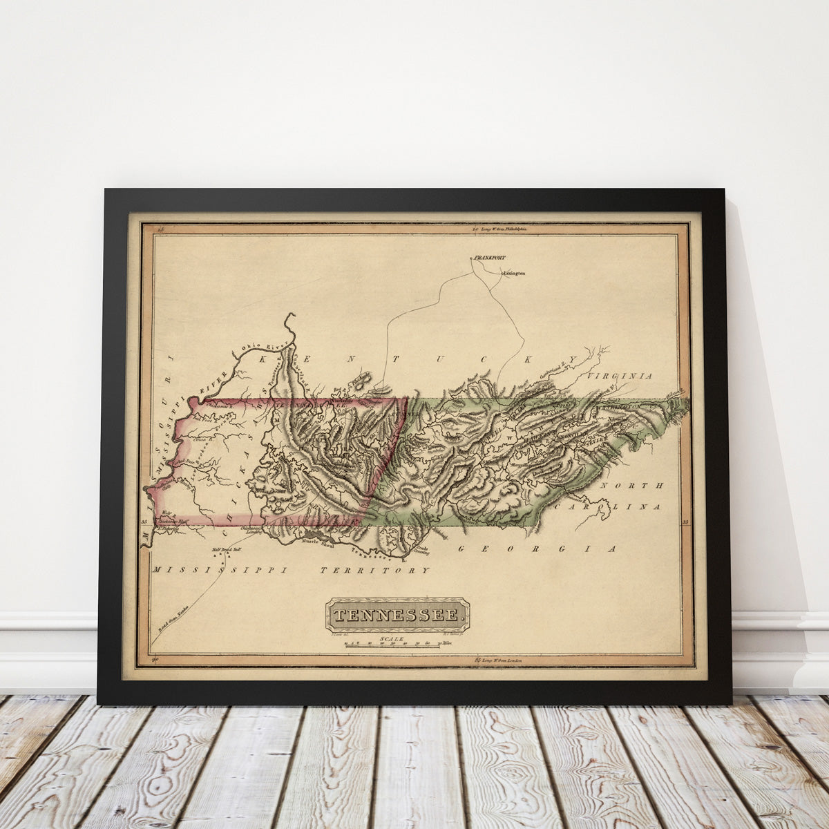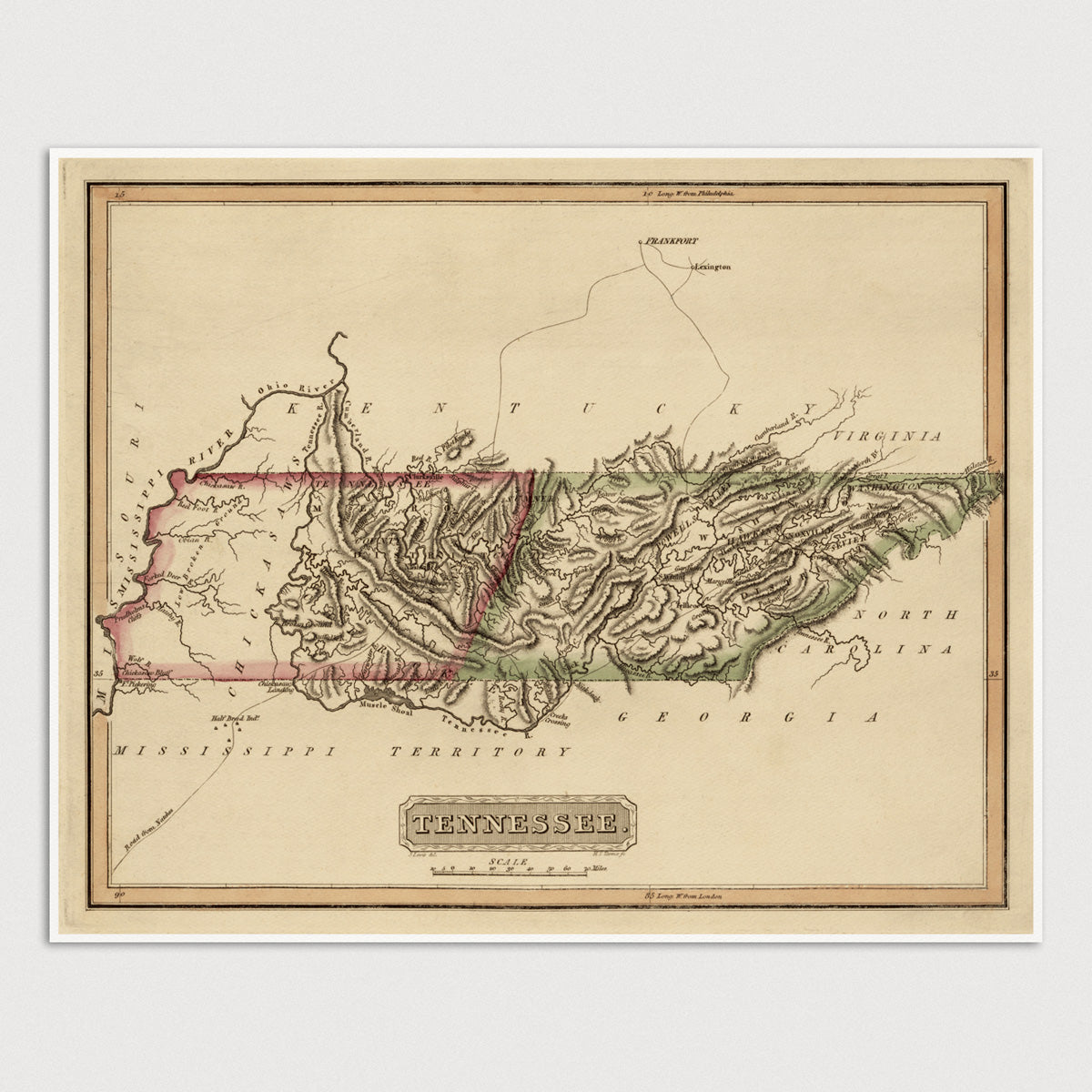 Archival print reproduction of an antique map of Tennessee from c1817 by Fielding Lucas.