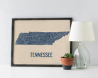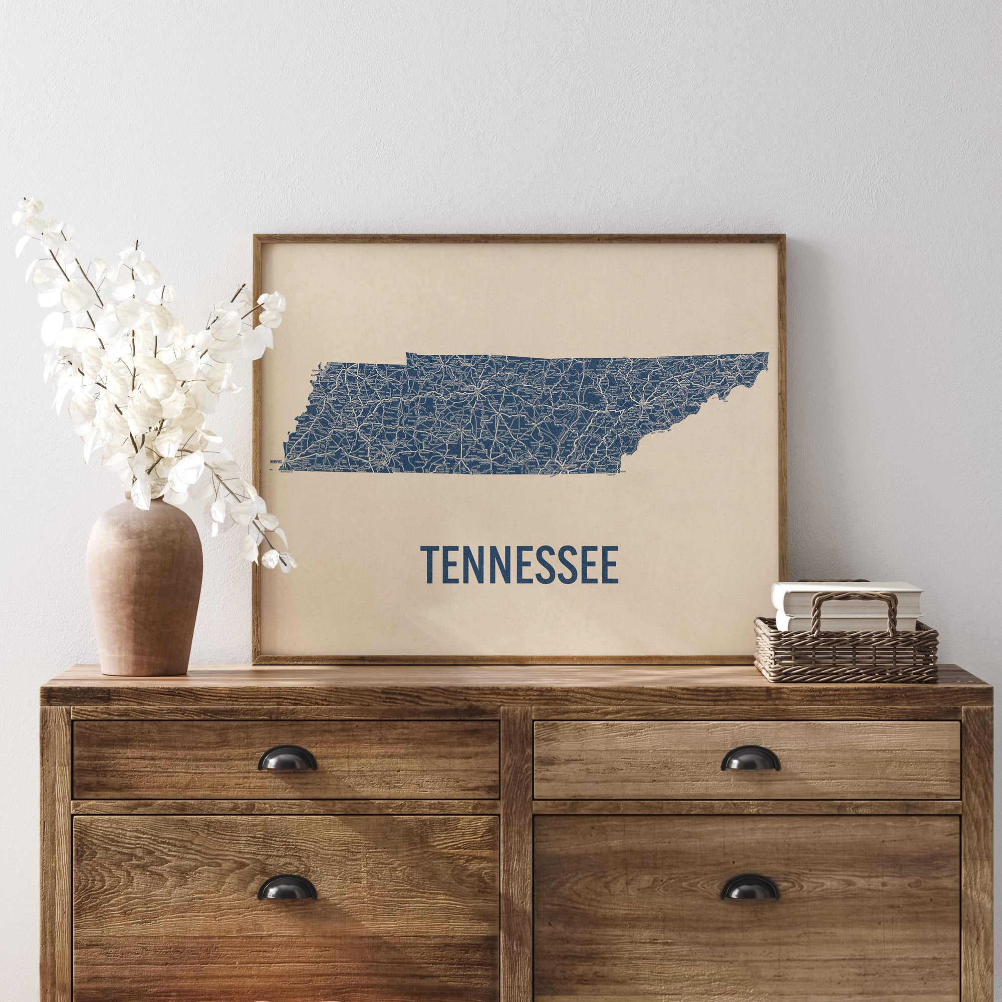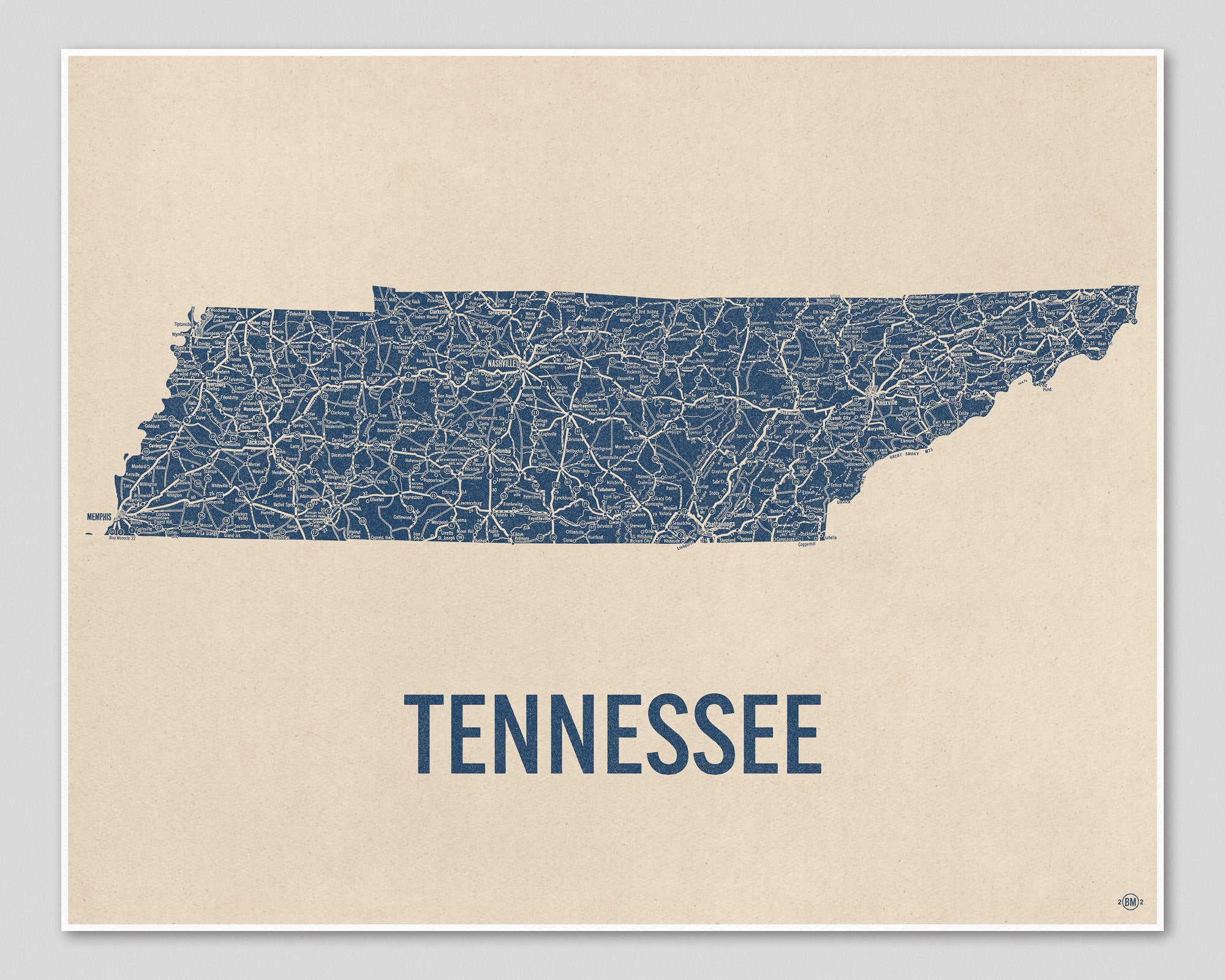 Archival art print based on a vintage 1930s highway map of Tennessee, blue on beige.