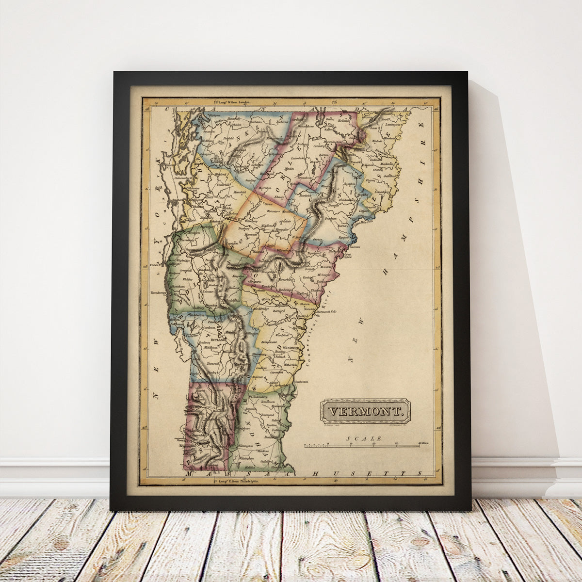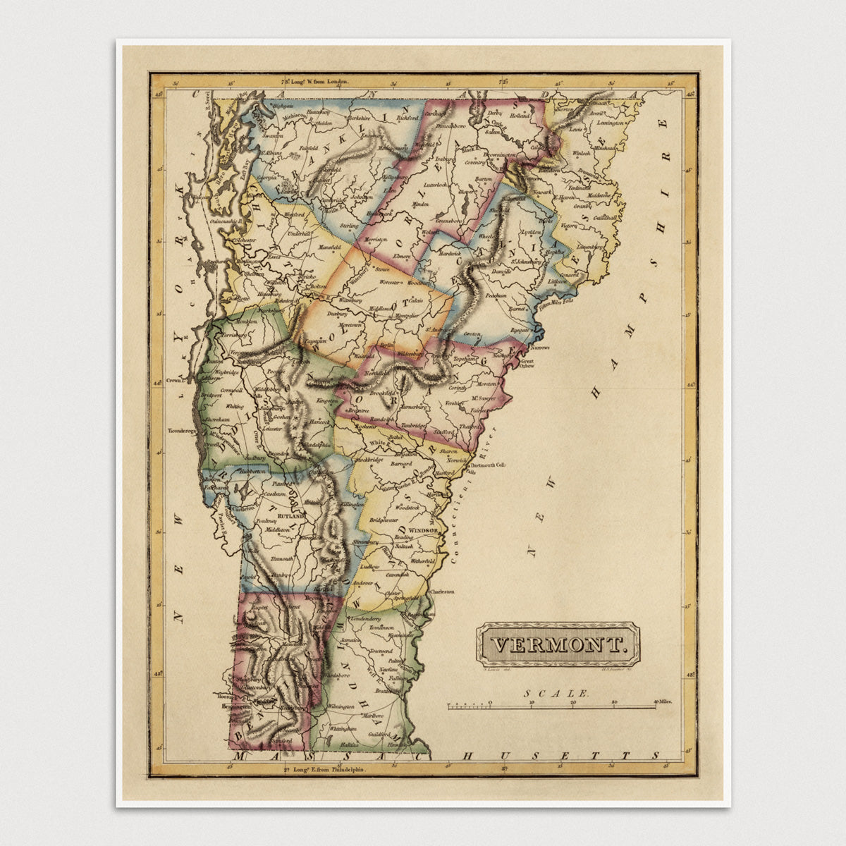 Archival print reproduction of an antique map of Vermont from c1817 by Fielding Lucas.