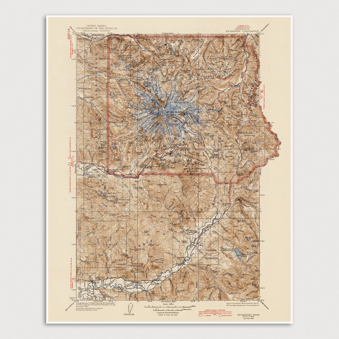 Archival print reproduction of an antique map of Mount Rainier National Park from 1928 by the US Geological Survey.