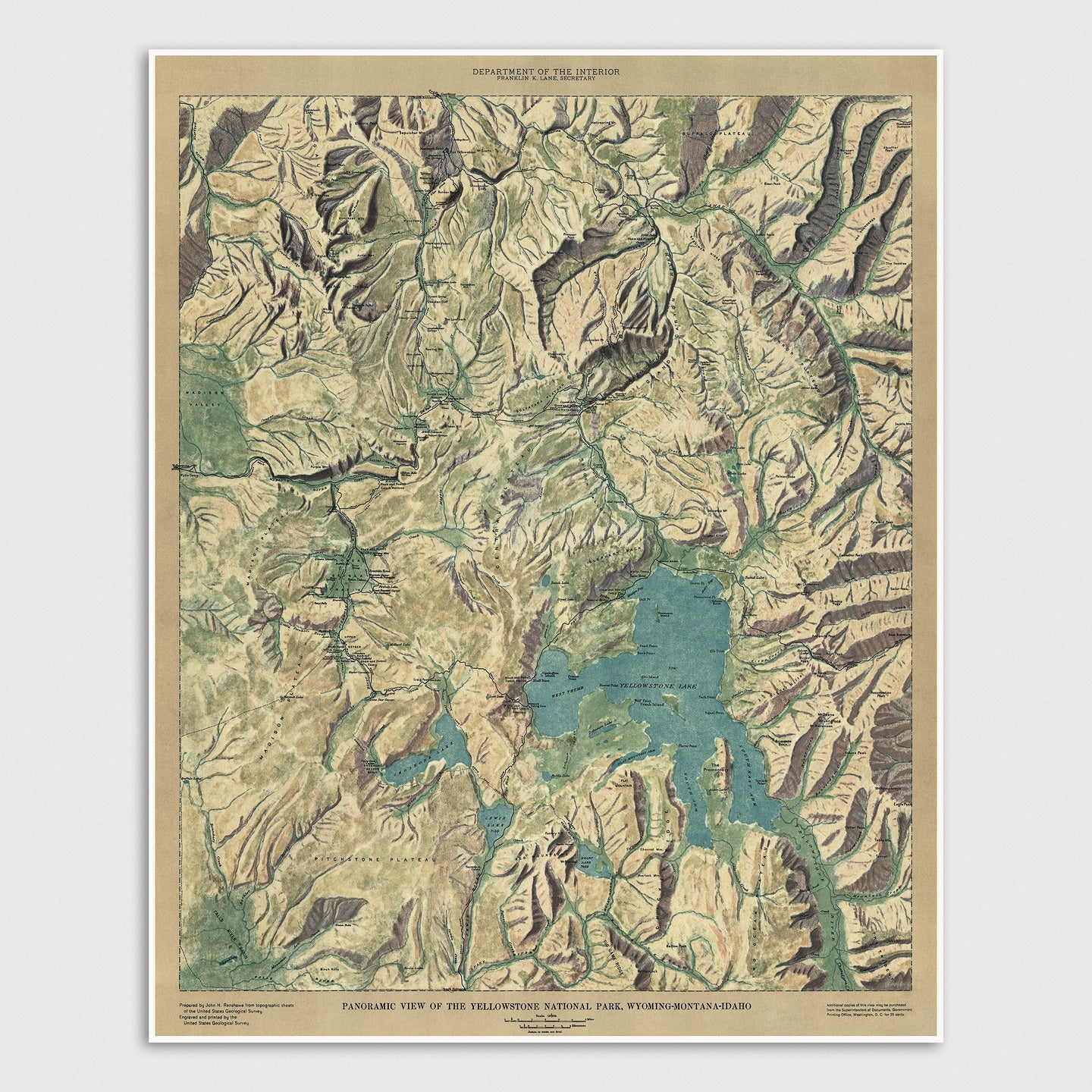 Archival print reproduction of an antique map of Yellowstone National Park, Wyoming from 1915 by the US Geological Survey. Shaded and colored relief map of Yellowstone National Park from the early 20th century. Shows numerous details, including roads, trails, lakes, springs, rivers, and mountain ranges.