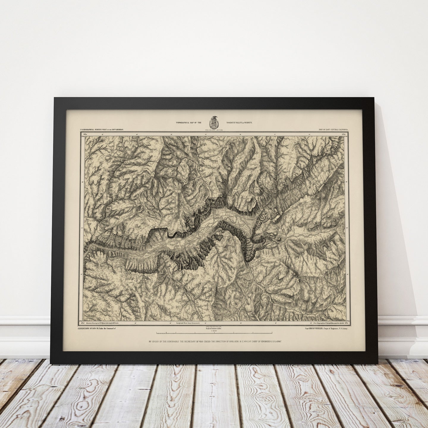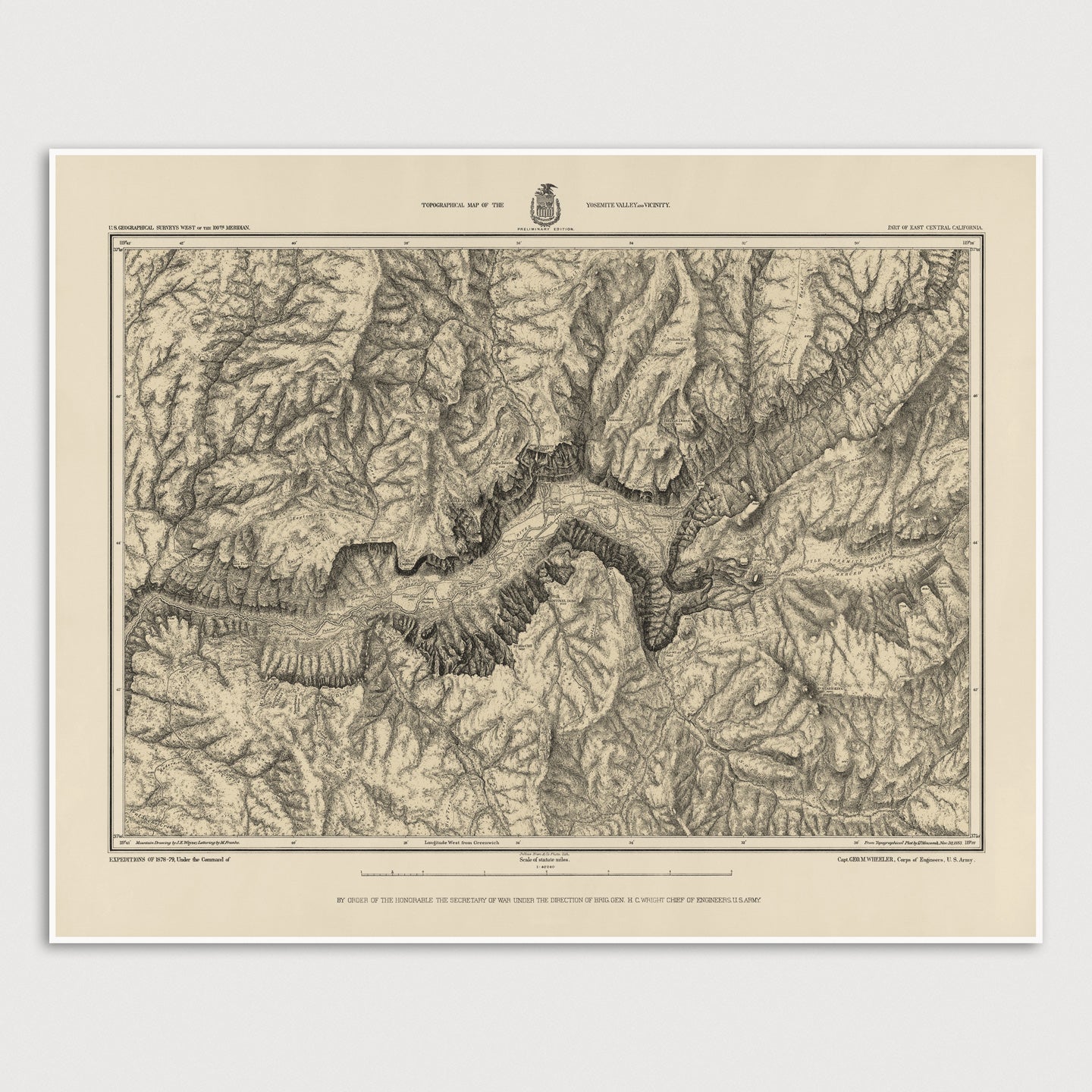 Archival print reproduction of an antique map of Yosemite National Park, California from c1884 by George M. Wheeler.