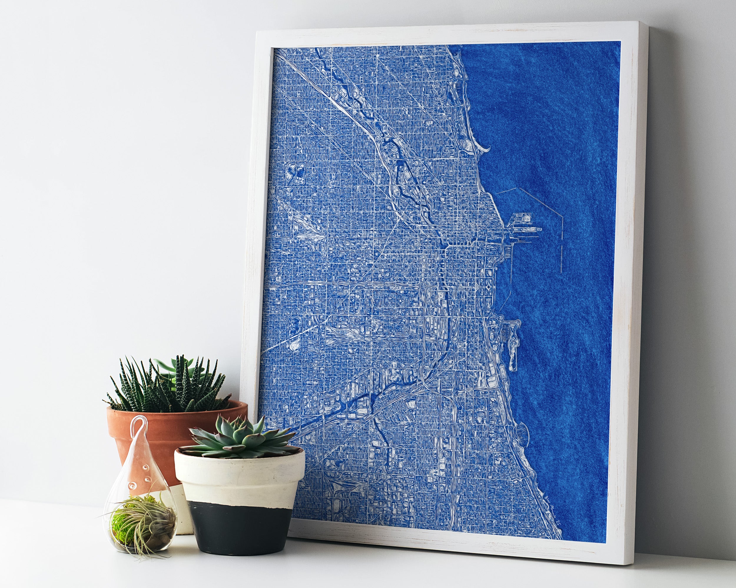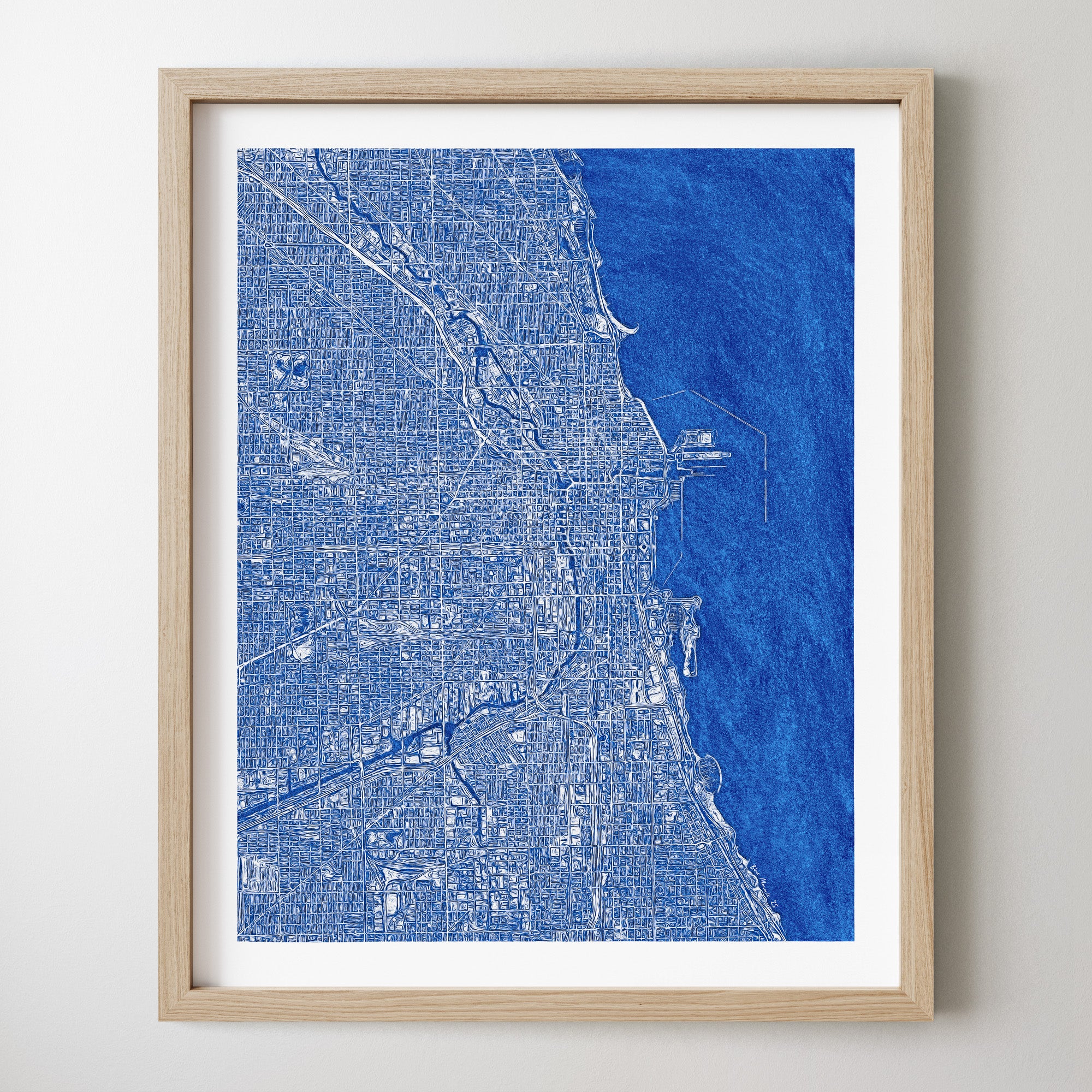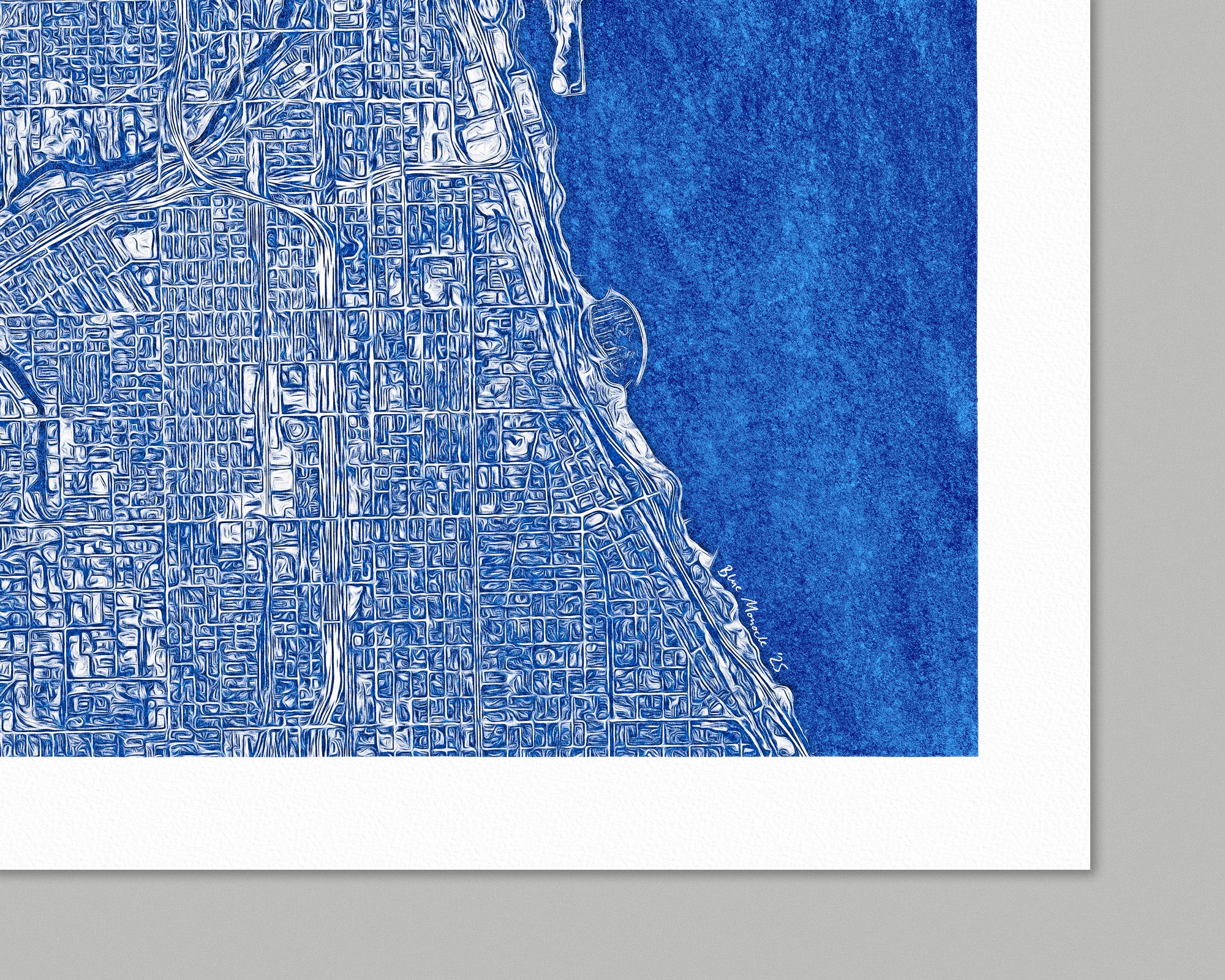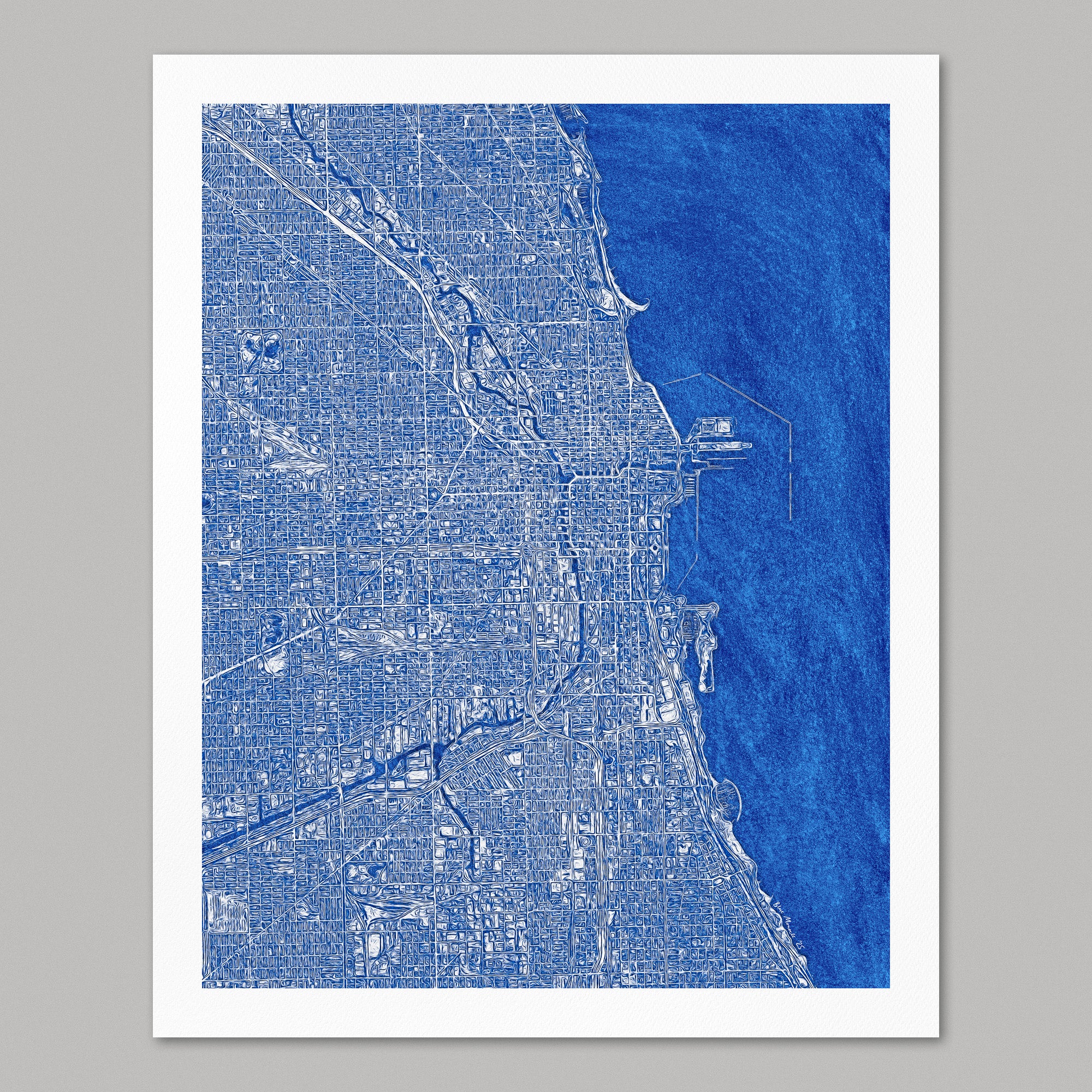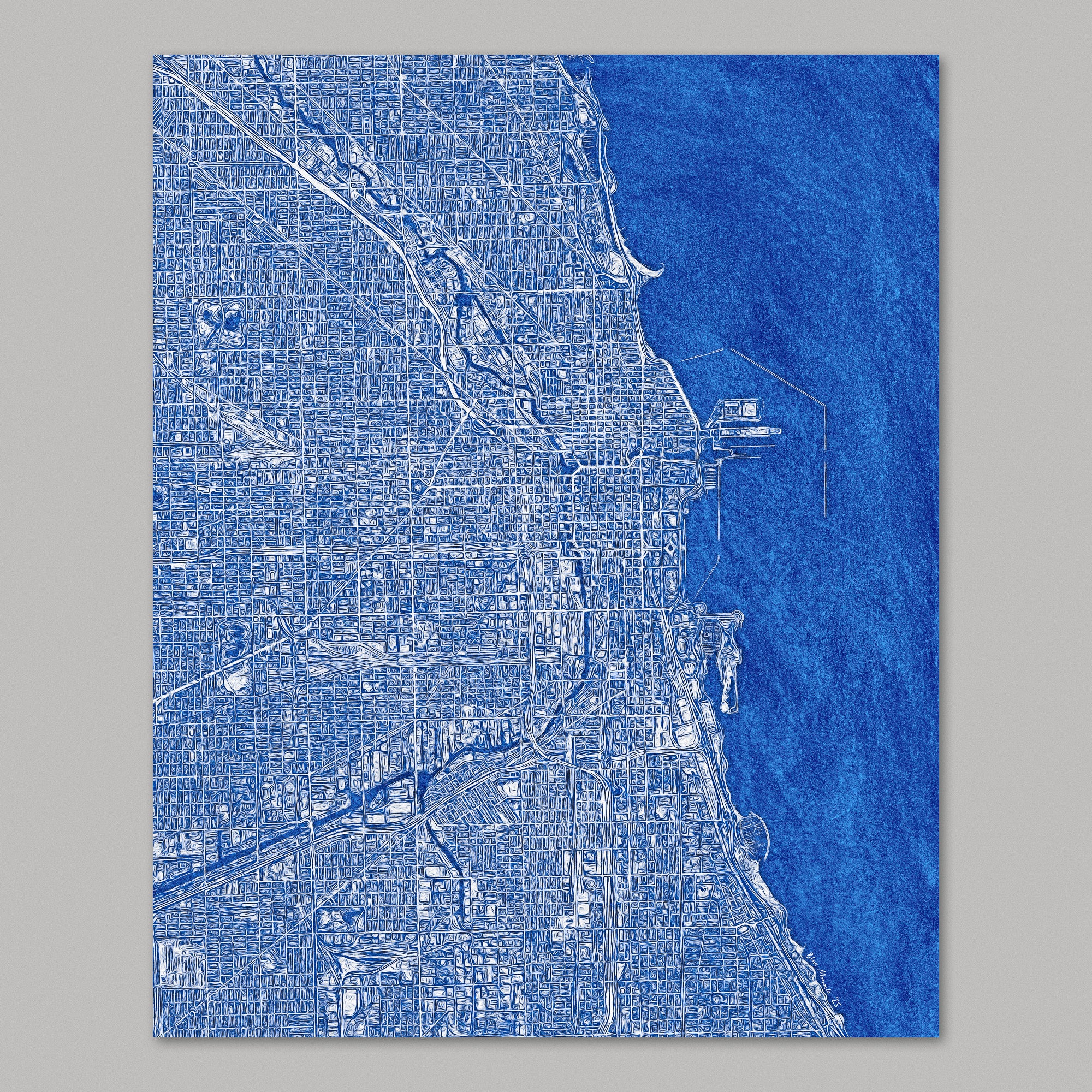 Archival art print of a street map of Chicago, in blue. The map is made in an impressionistic style with a kinetic, almost dreamlike quality that evokes the energy of the city.