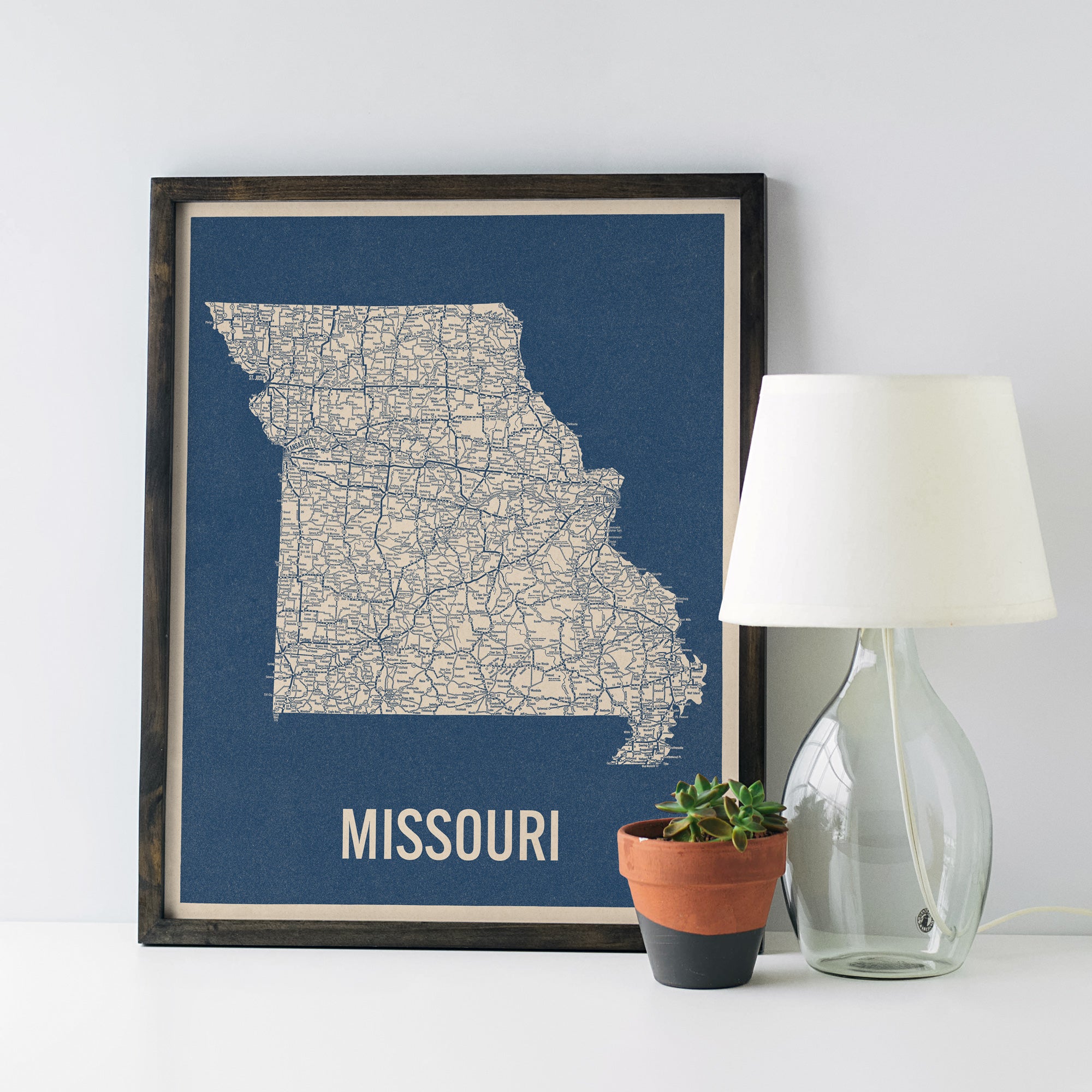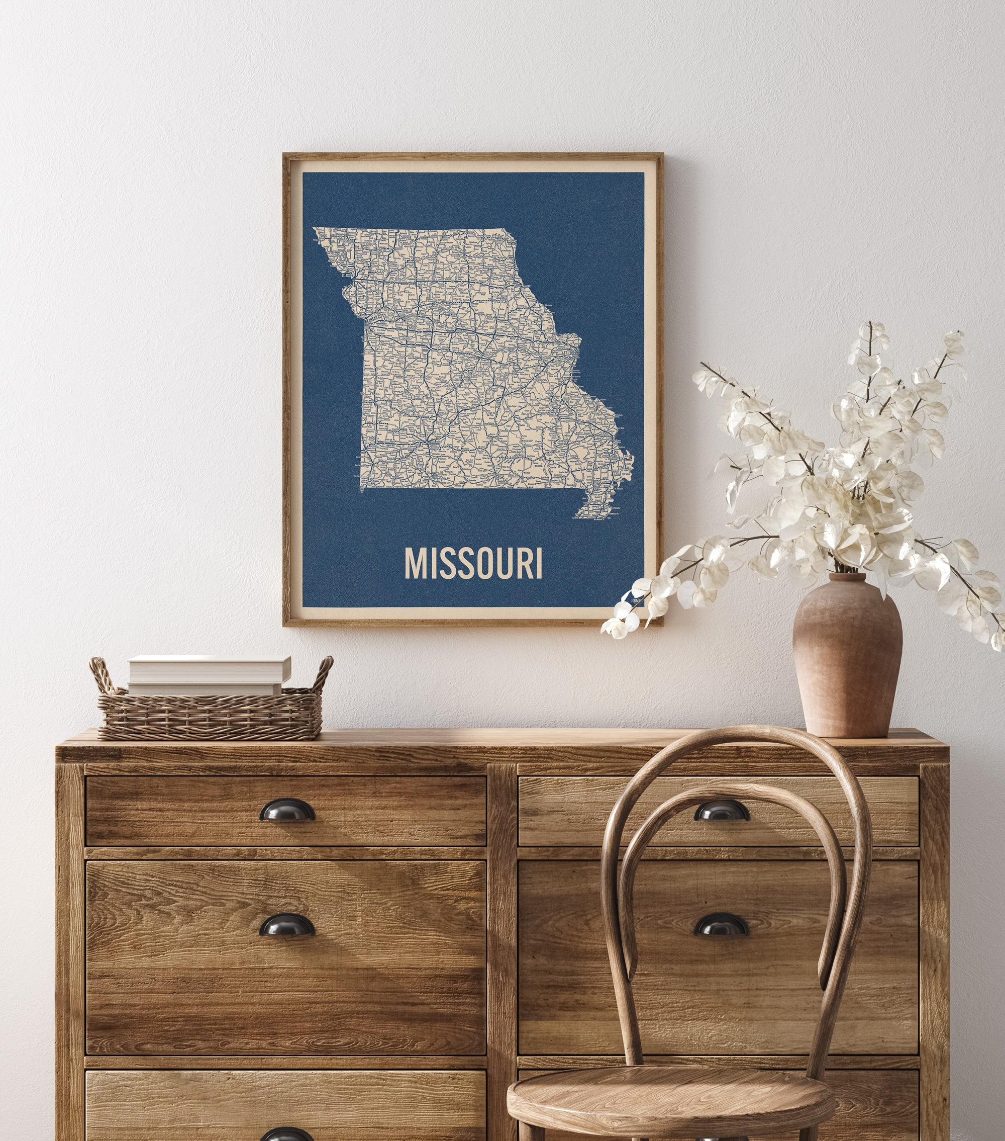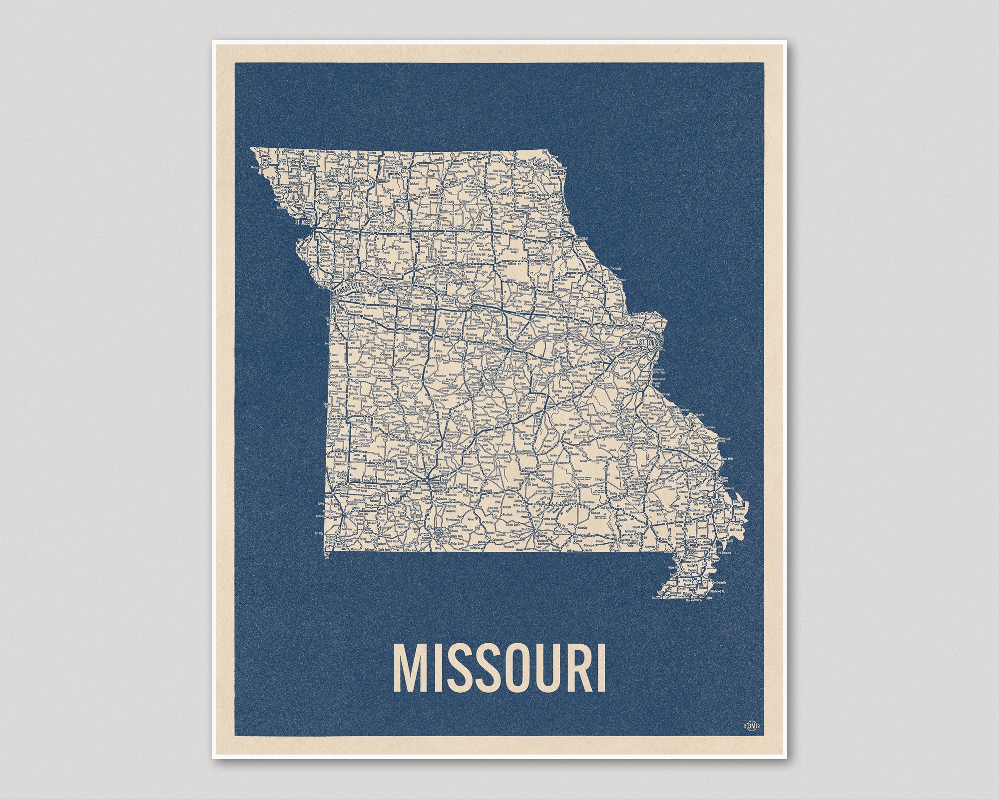 Archival art print based on a vintage 1930s highway map of Missouri, blue on beige.