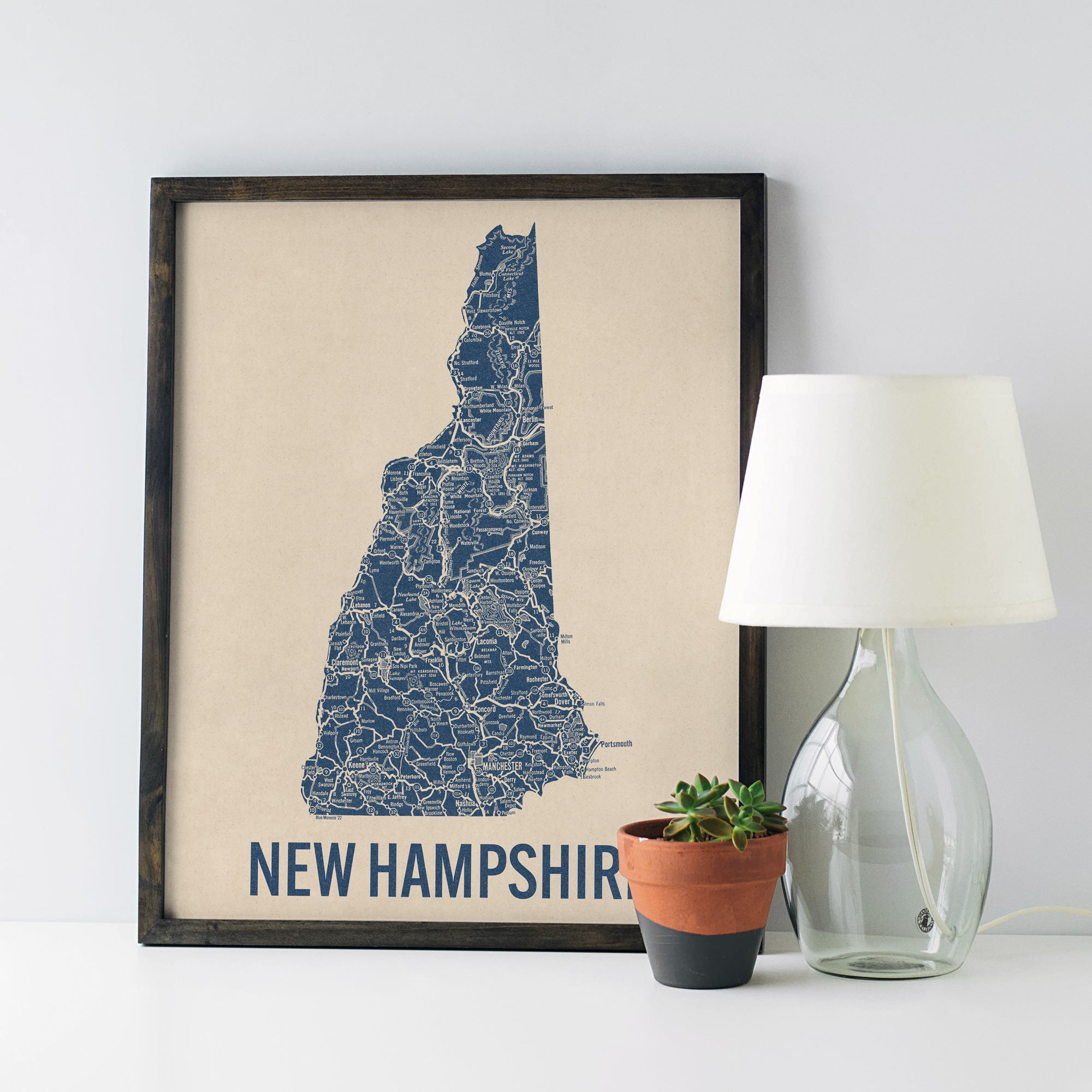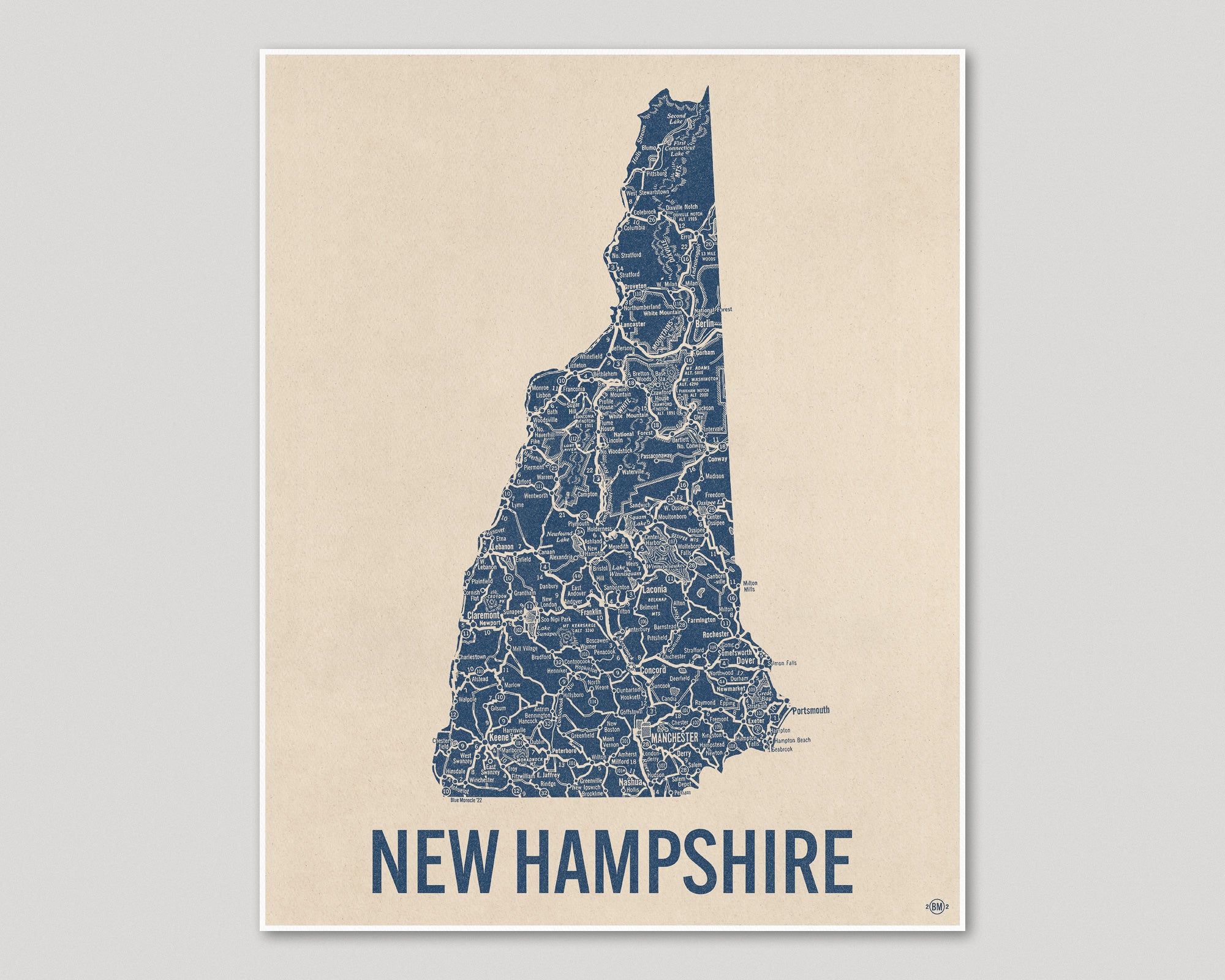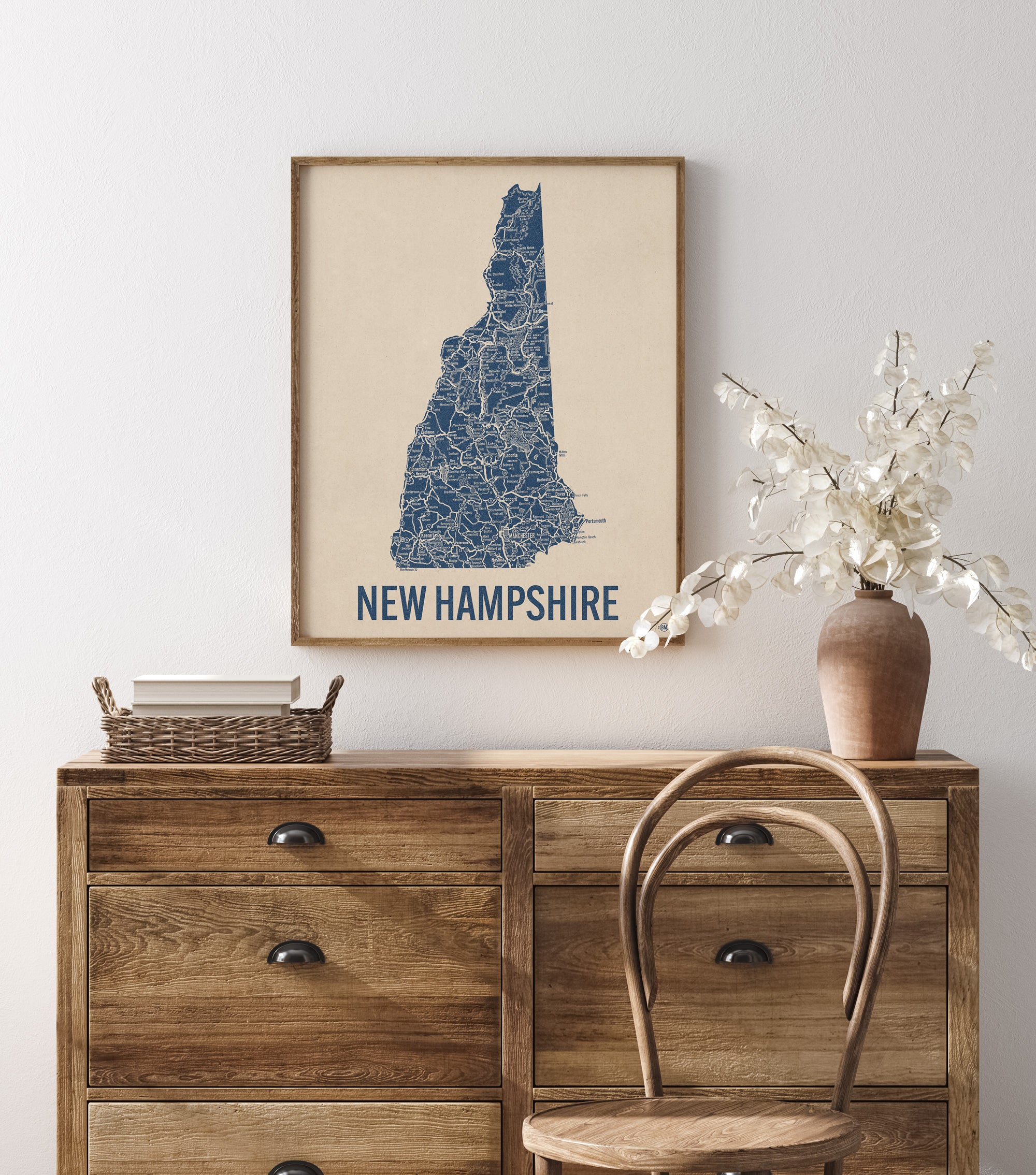 Archival art print based on a vintage 1930s highway map of New Hampshire, blue on beige.