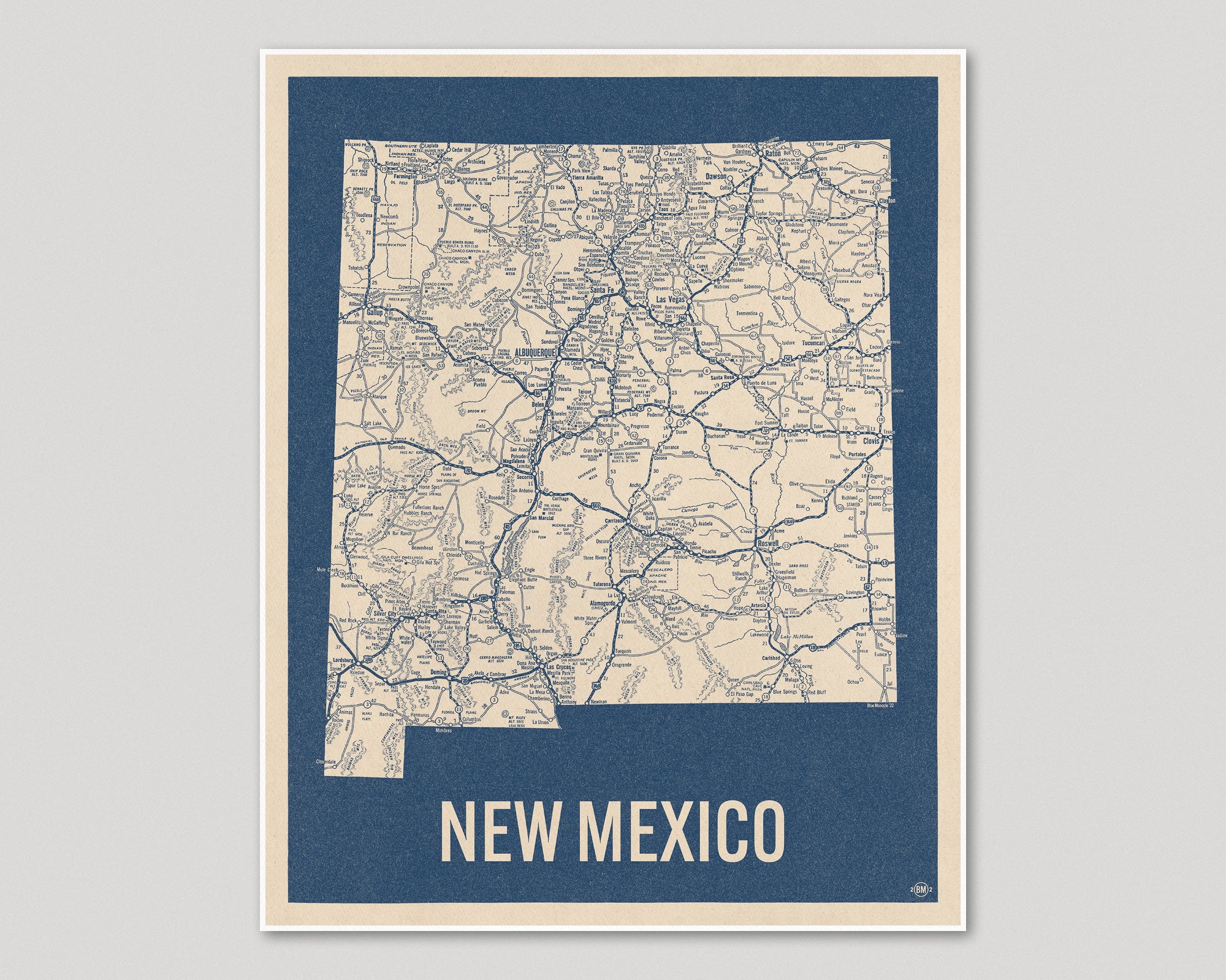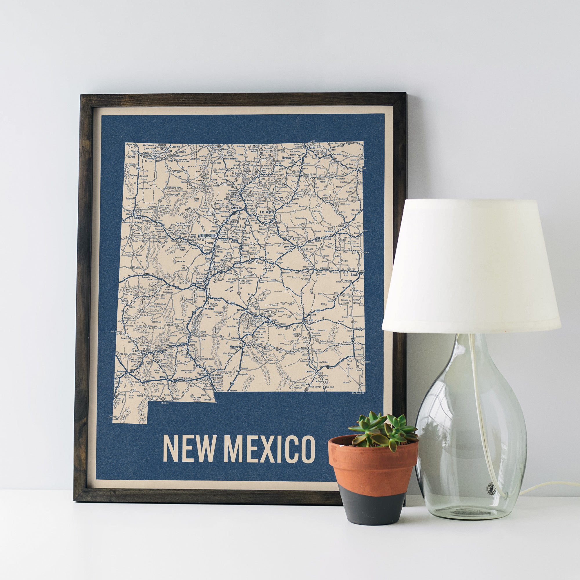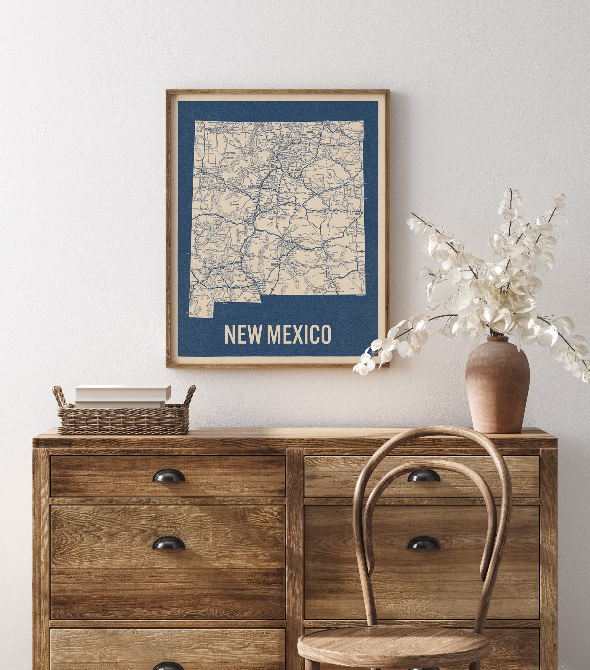 Archival art print based on a vintage 1930s highway map of New Mexico, blue on beige.