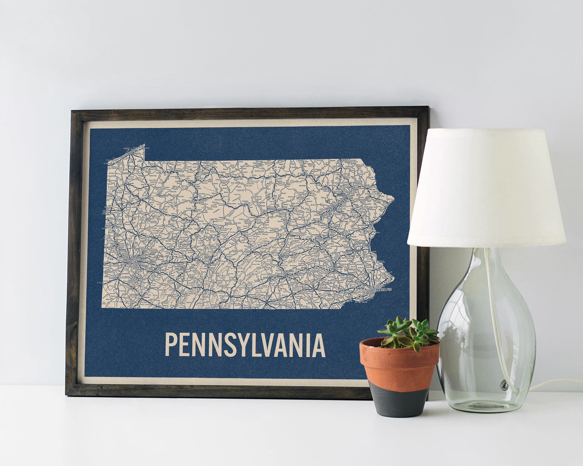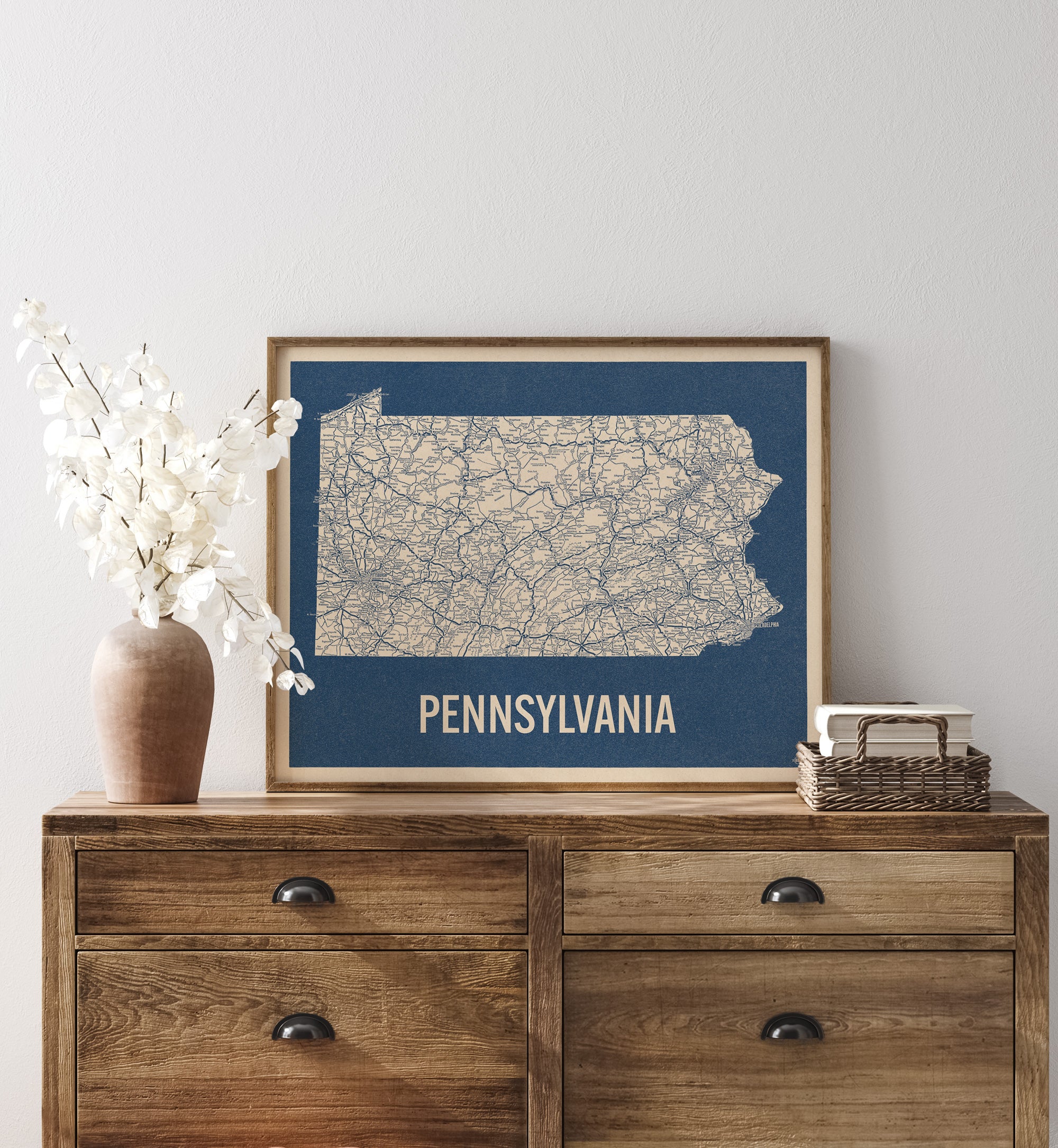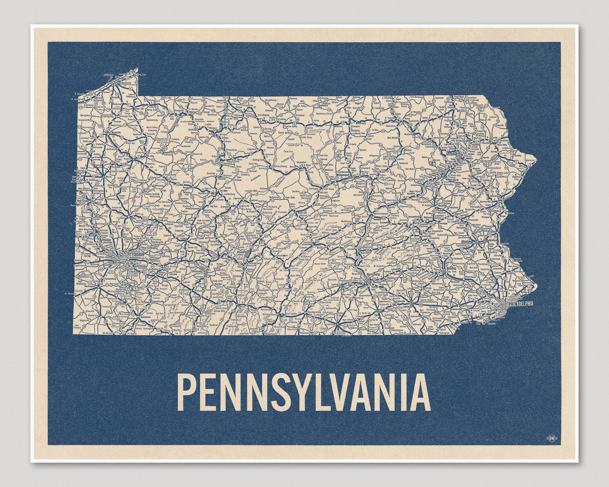 Archival art print based on a vintage 1930s highway map of Pennsylvania, blue on beige.