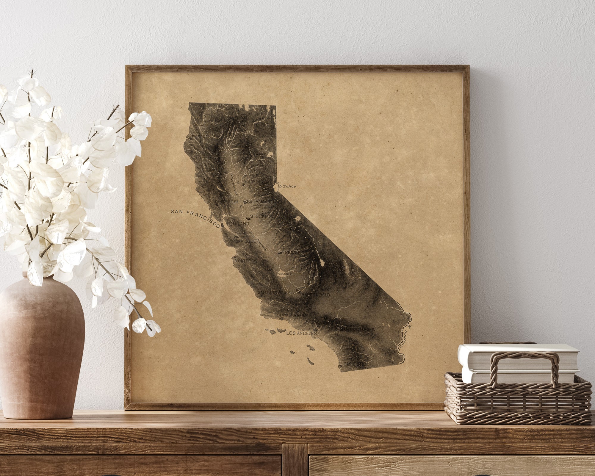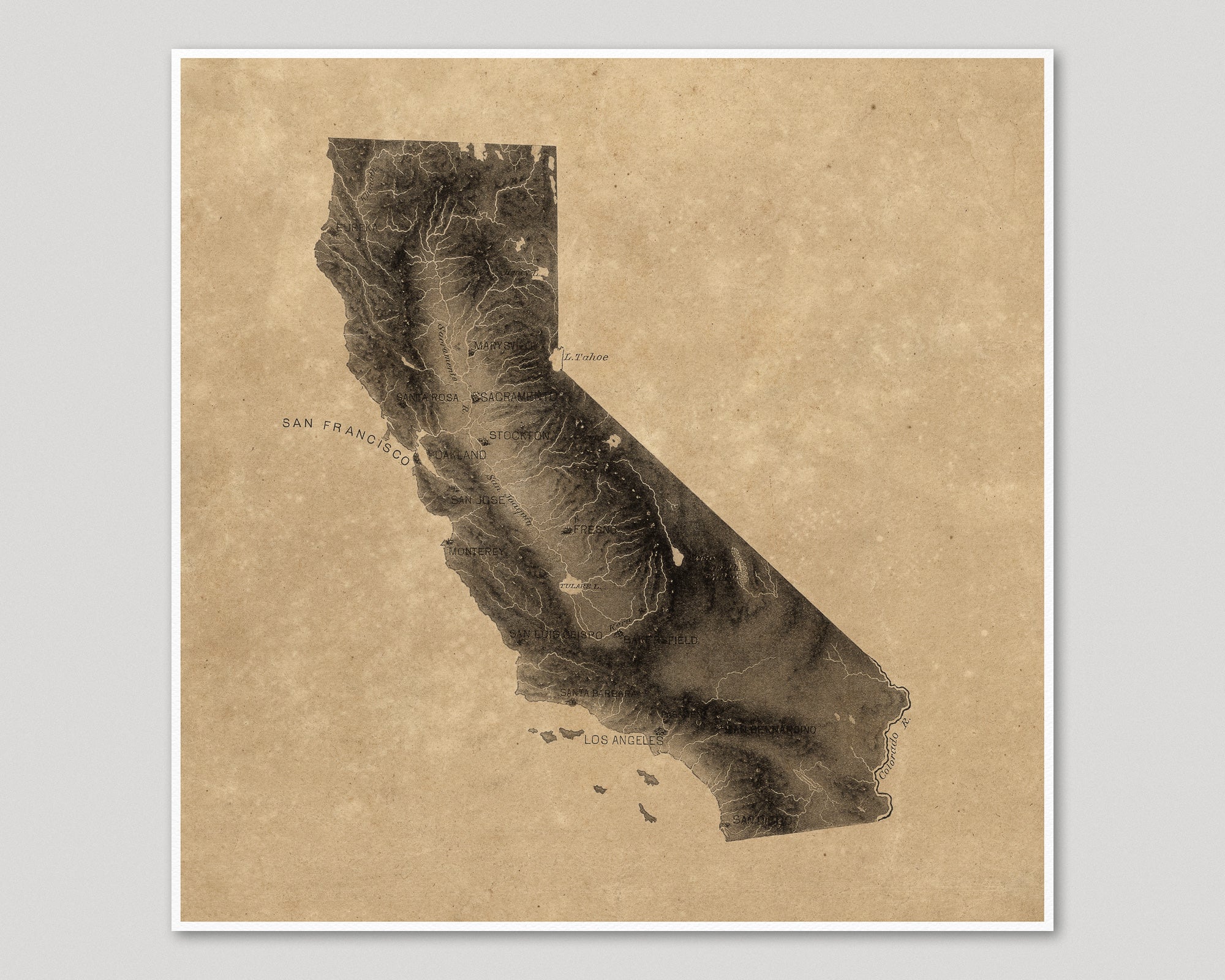 Archival art print based on a vintage early-20th century relief map of California.