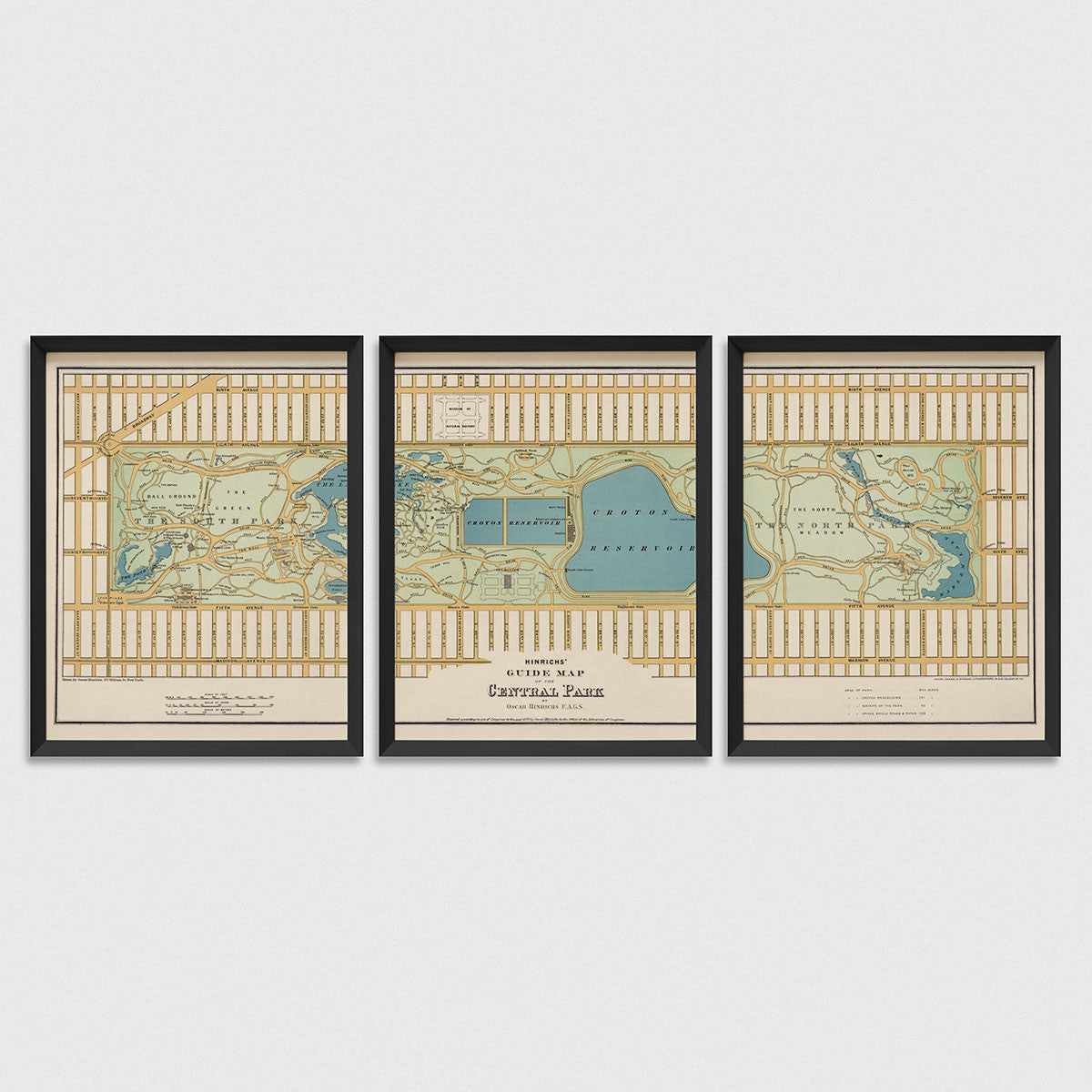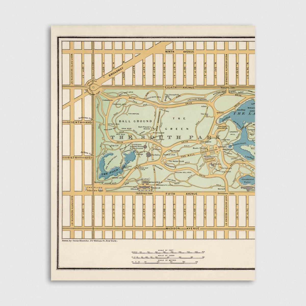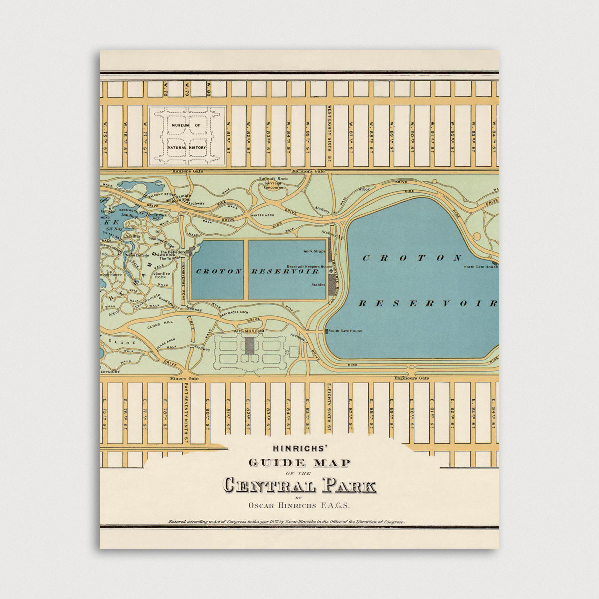 Archival print reproduction of an antique map of Central Park in New York City from 1875 by Oscar Hinrichs.