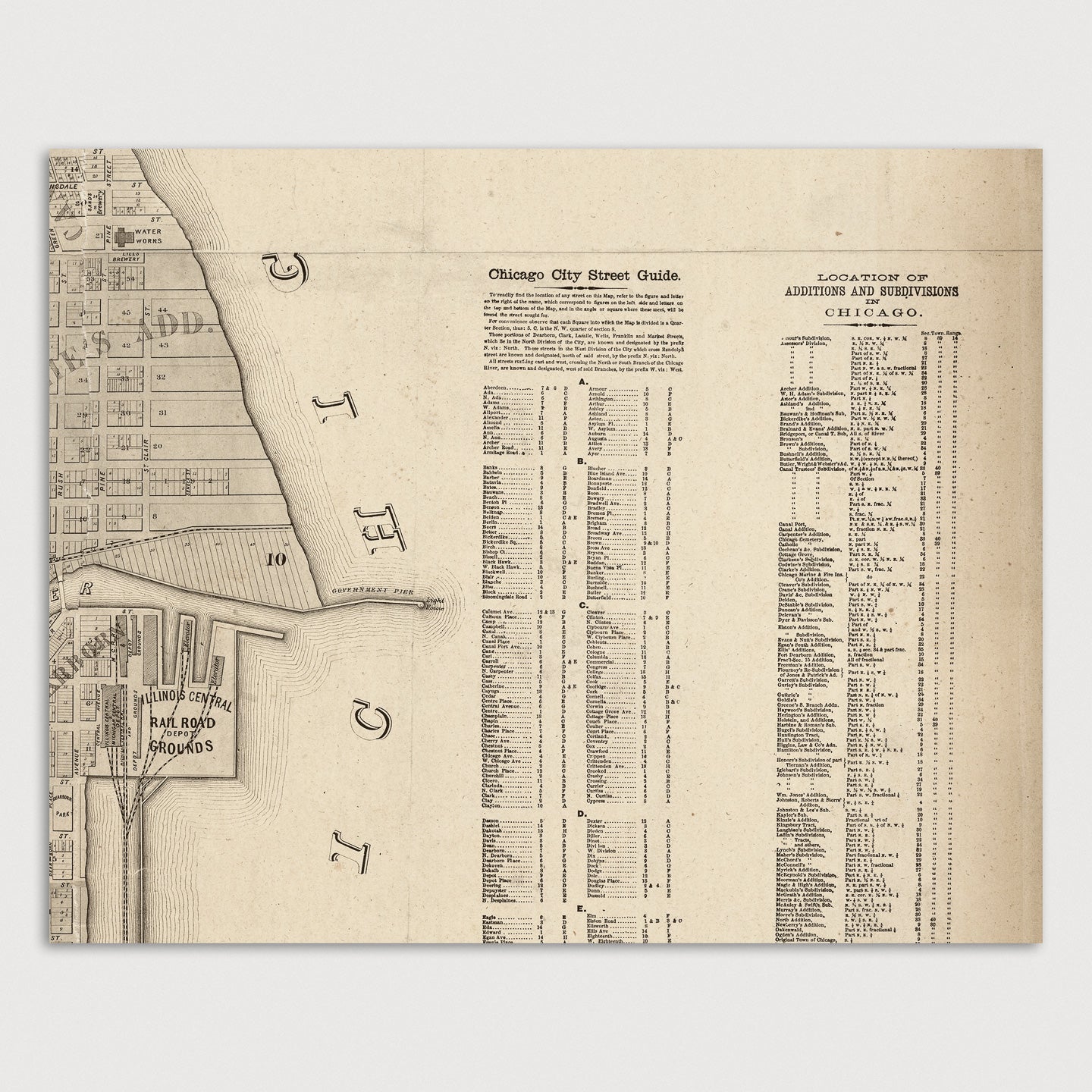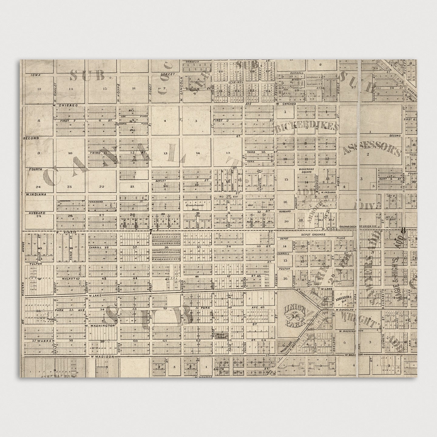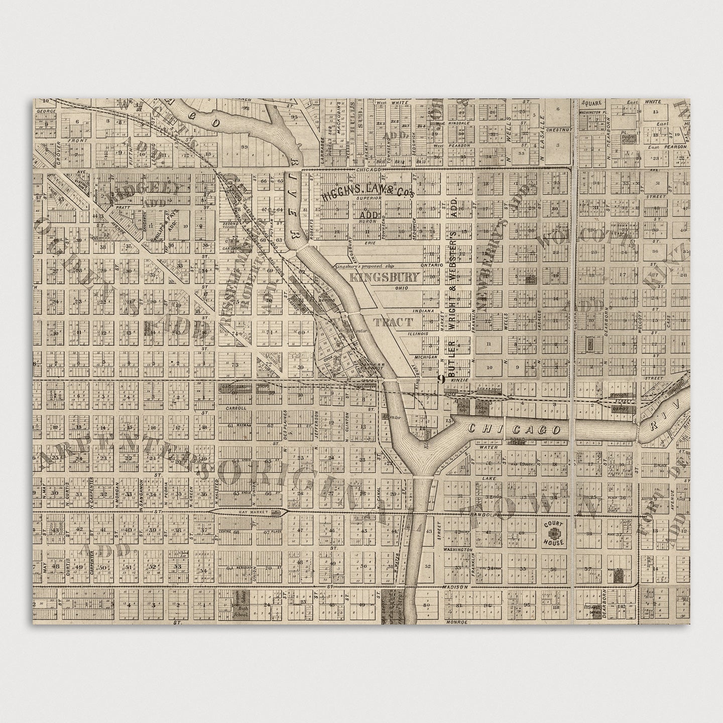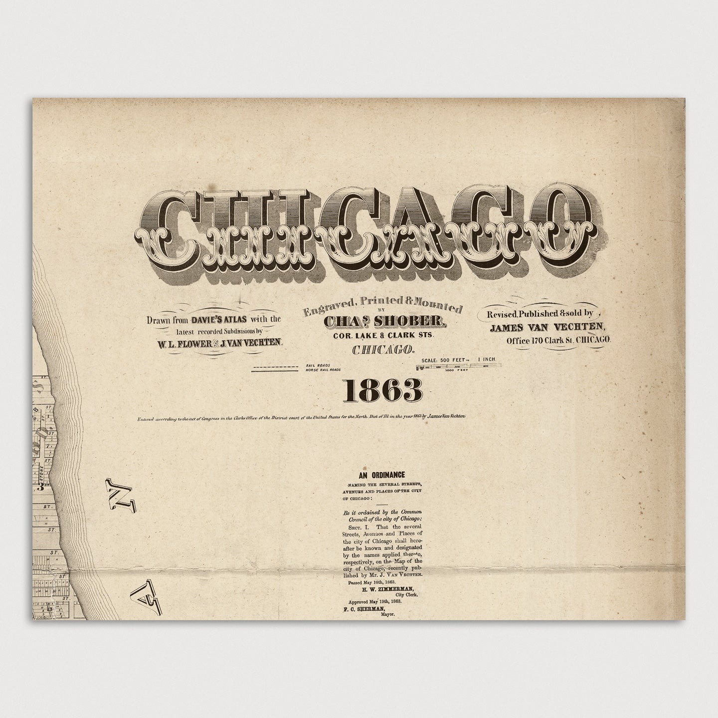 Archival print reproduction of an antique map of Chicago, Illinois from 1863 by Charles Shober. Covers central Chicago, from about 15th St. in the south to about Armitage Ave. in the north, and from the lake west to Western Ave.
