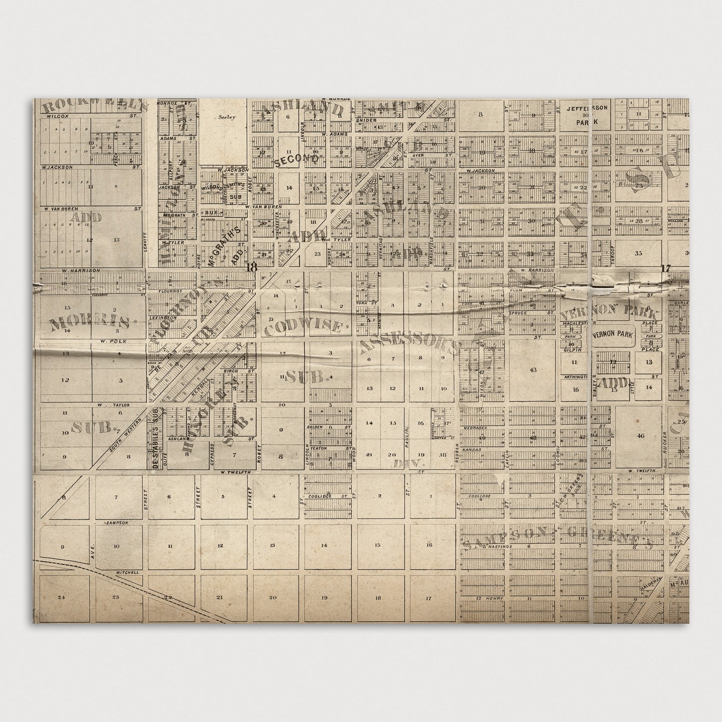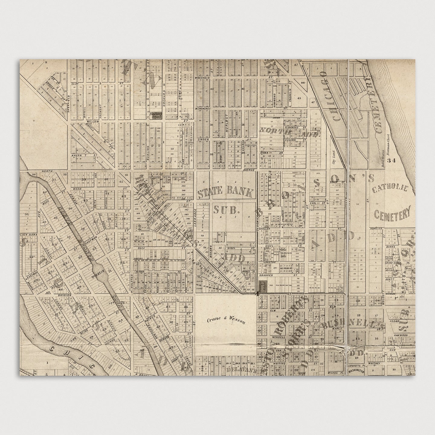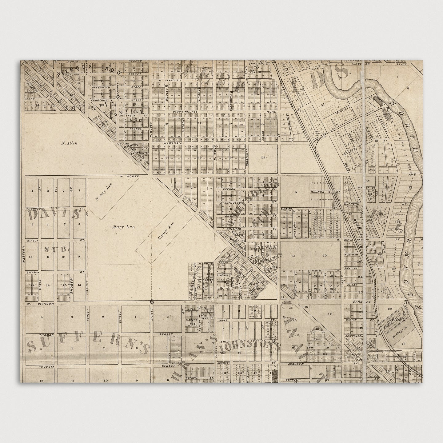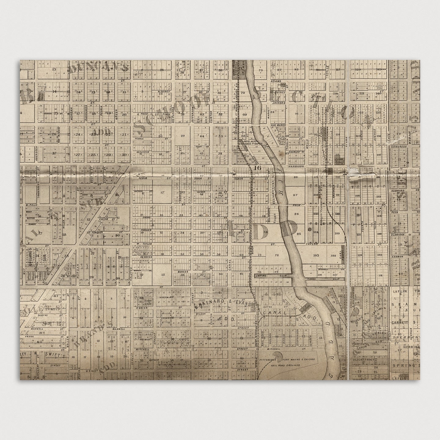 Archival print reproduction of an antique map of Chicago, Illinois from 1863 by Charles Shober. Covers central Chicago, from about 15th St. in the south to about Armitage Ave. in the north, and from the lake west to Western Ave.