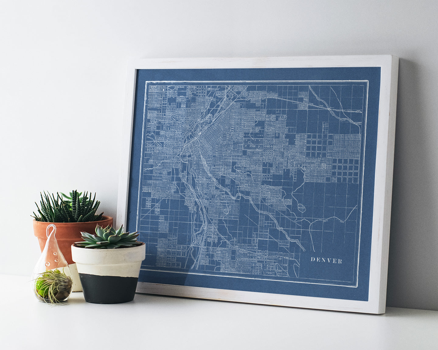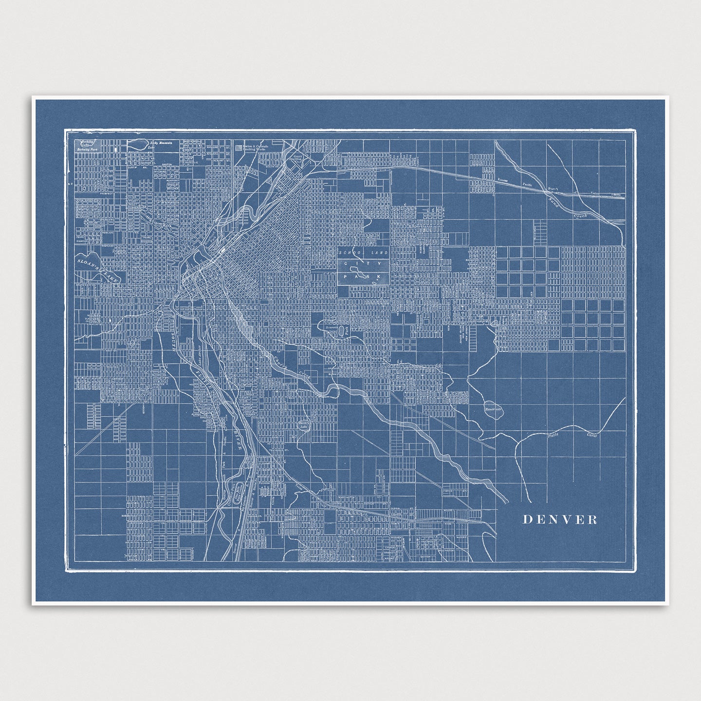 Archival art print in a blueprint style based on an antique map of Denver, Colorado from 1901 by George Franklin Cram. Covers an area from Yale Ave. in the south to about present-day I-70 in the north, and from Havana St. in the east to Sheridan Blvd. in the west.