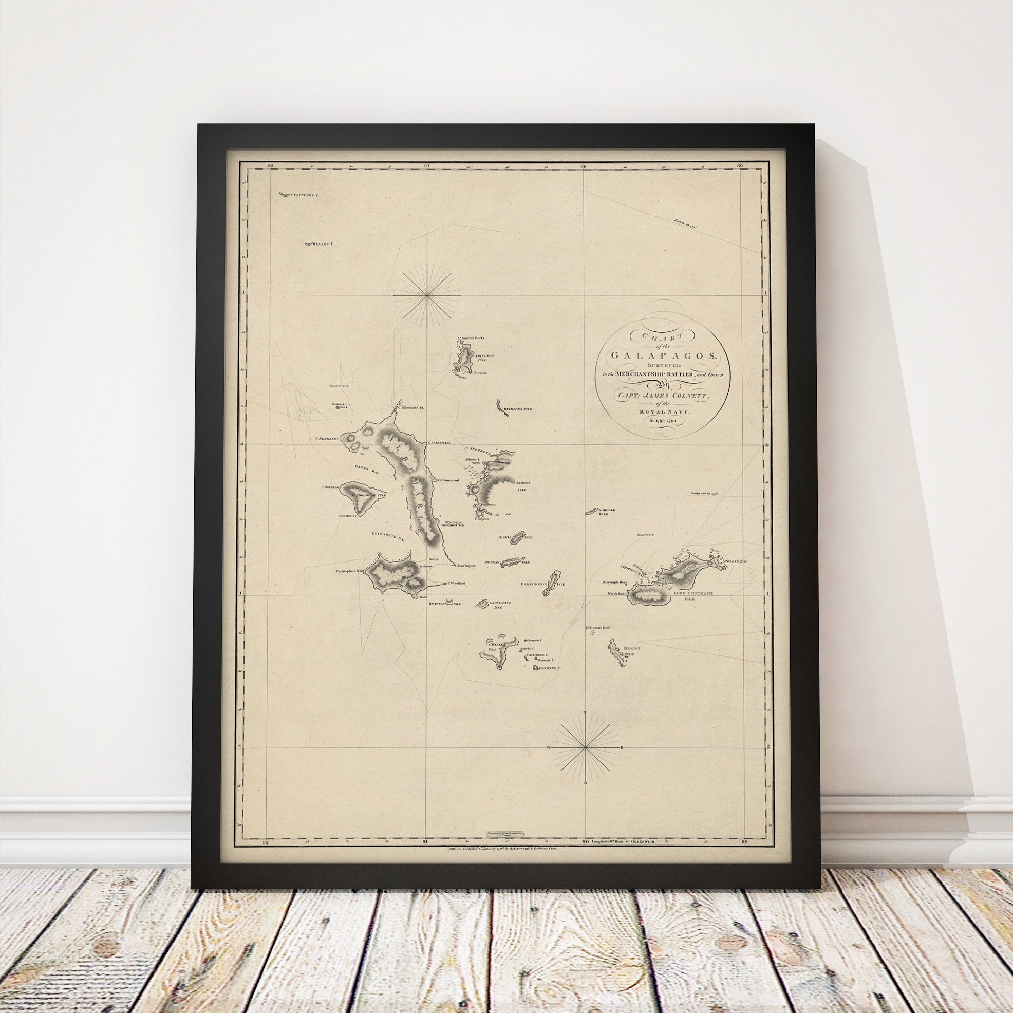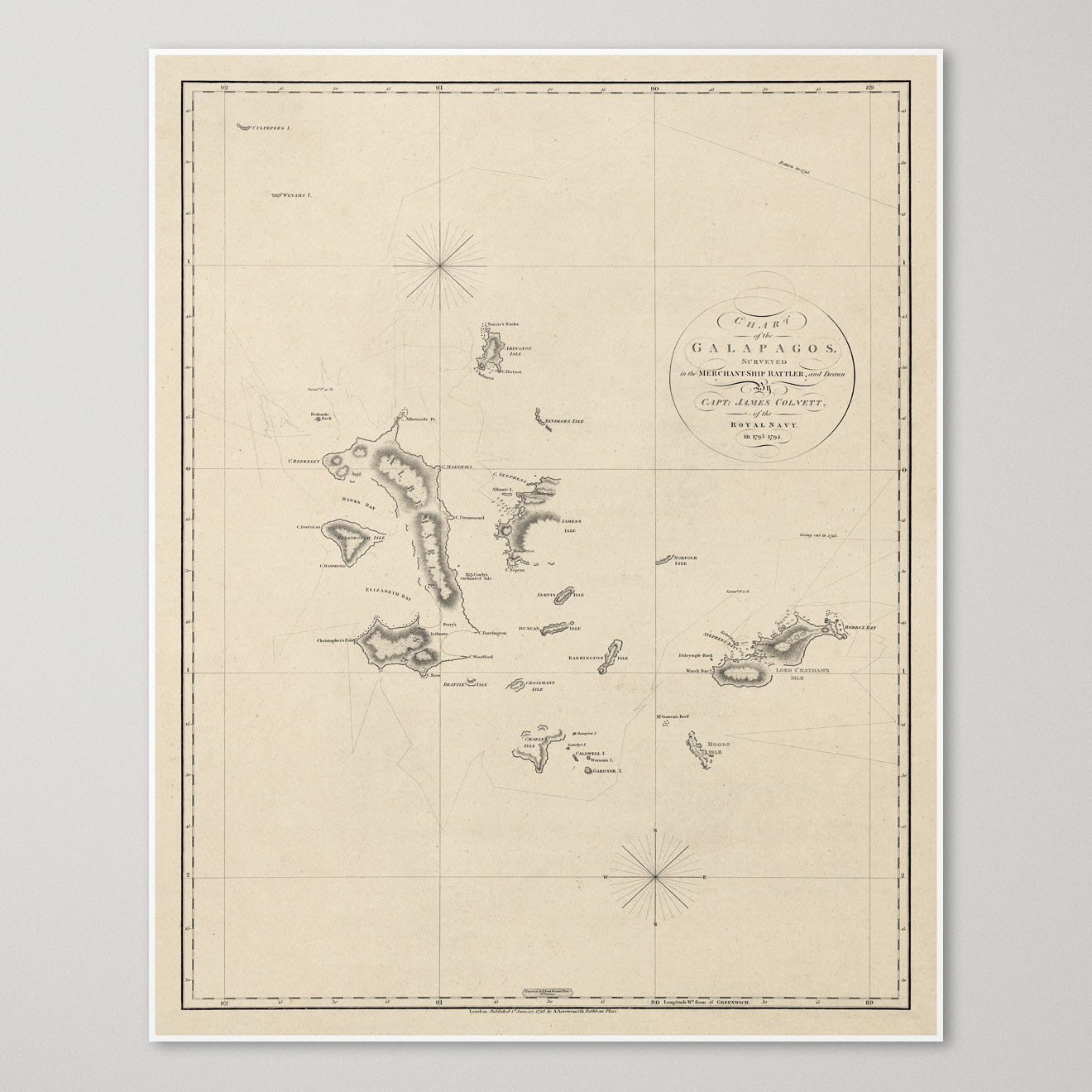 Archival print reproduction of an antique map of the Galapagos Islands from 1798 by James Colnett. Shows routes of expeditions.