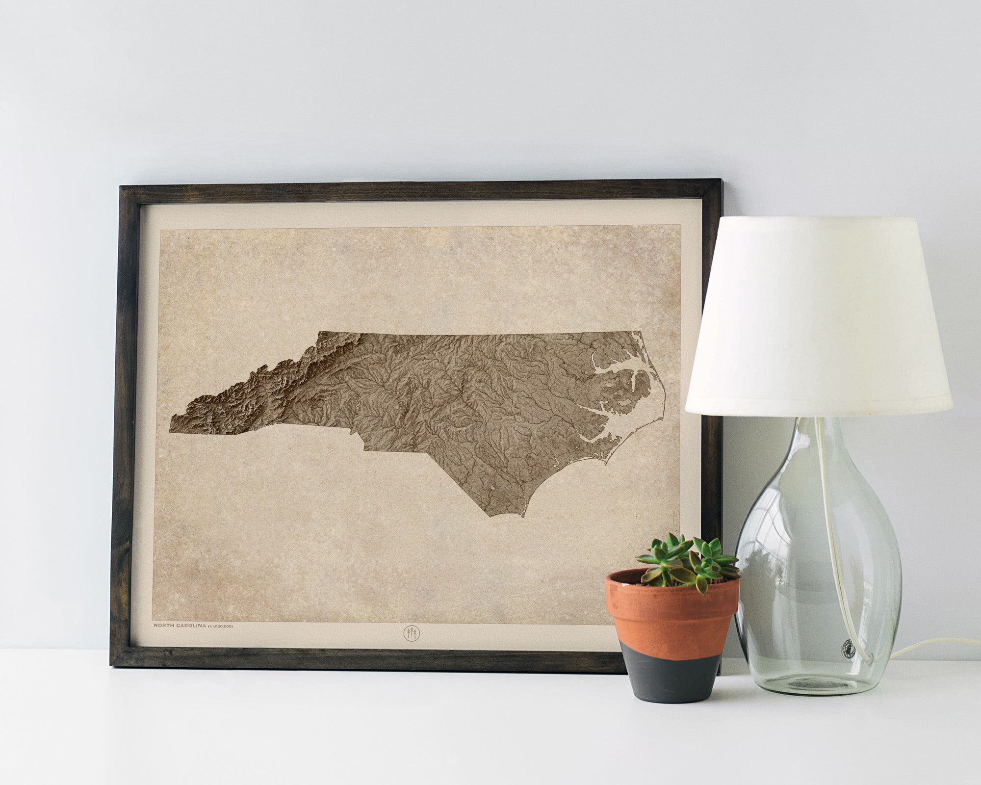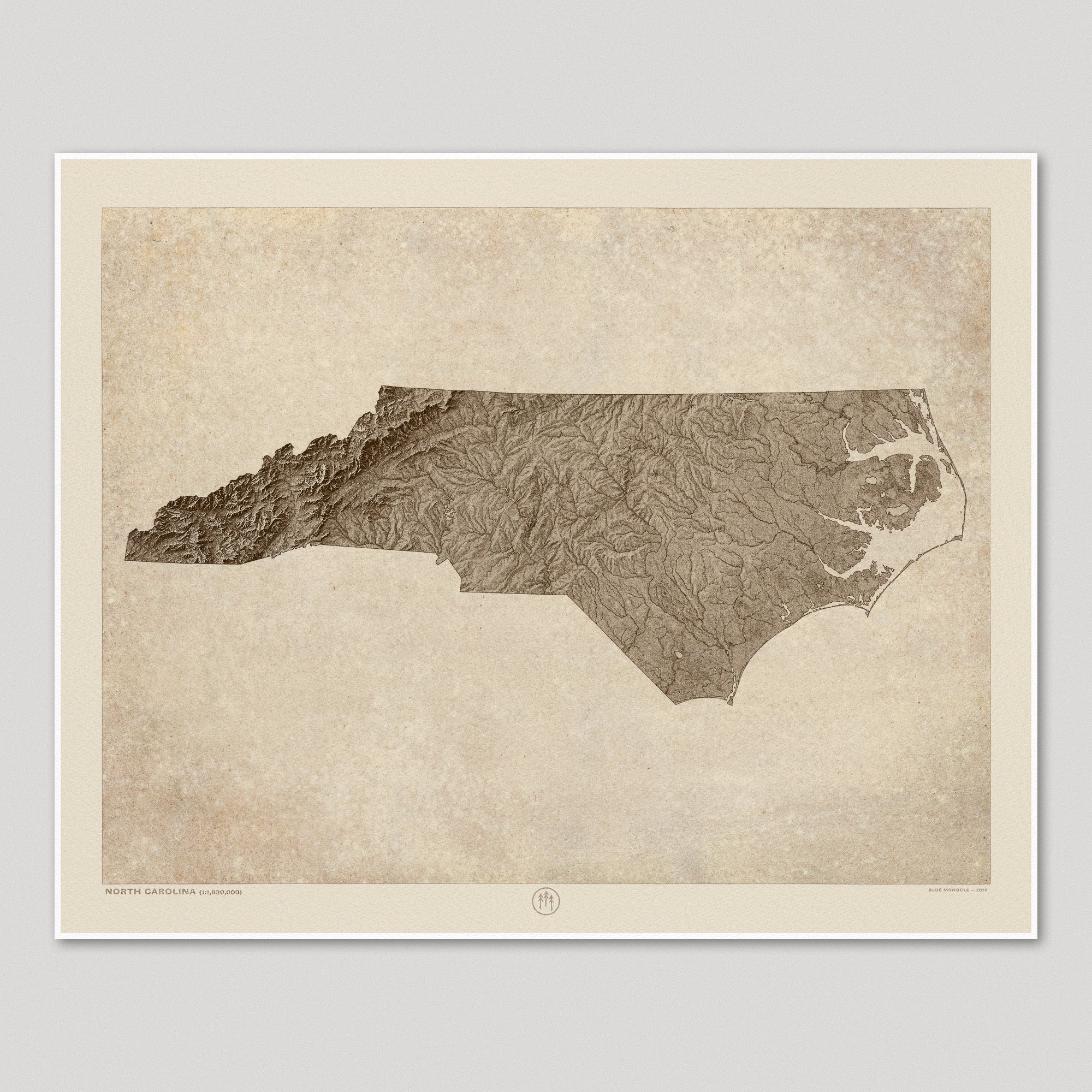 North Carolina Relief Map Art Print, Sepia, Vintage Style