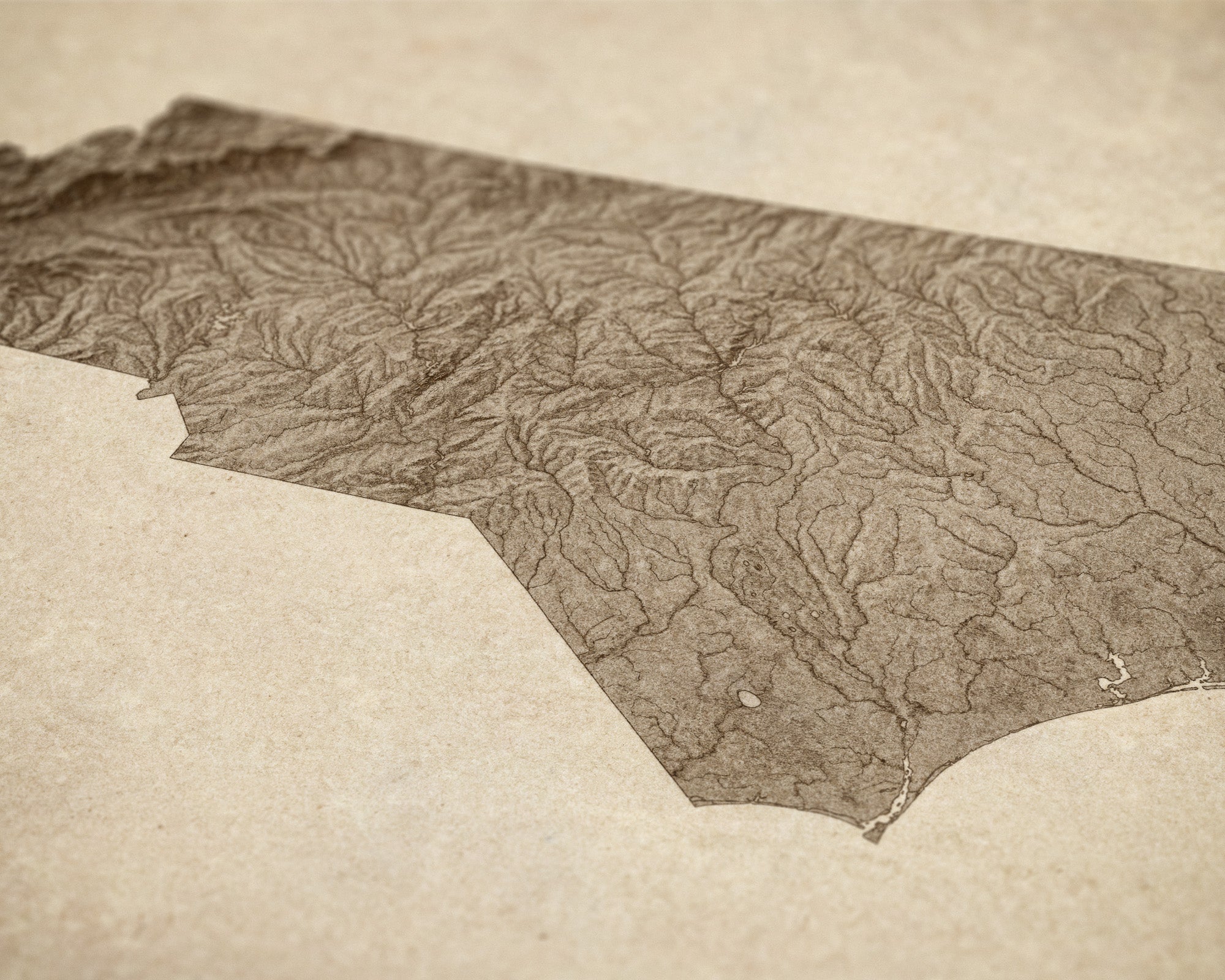 Archival art print of a modern shaded relief map of North Carolina in a rustic, vintage sepia style. The map focuses on landforms with highly-detailed depictions of mountains, valleys, and rivers.