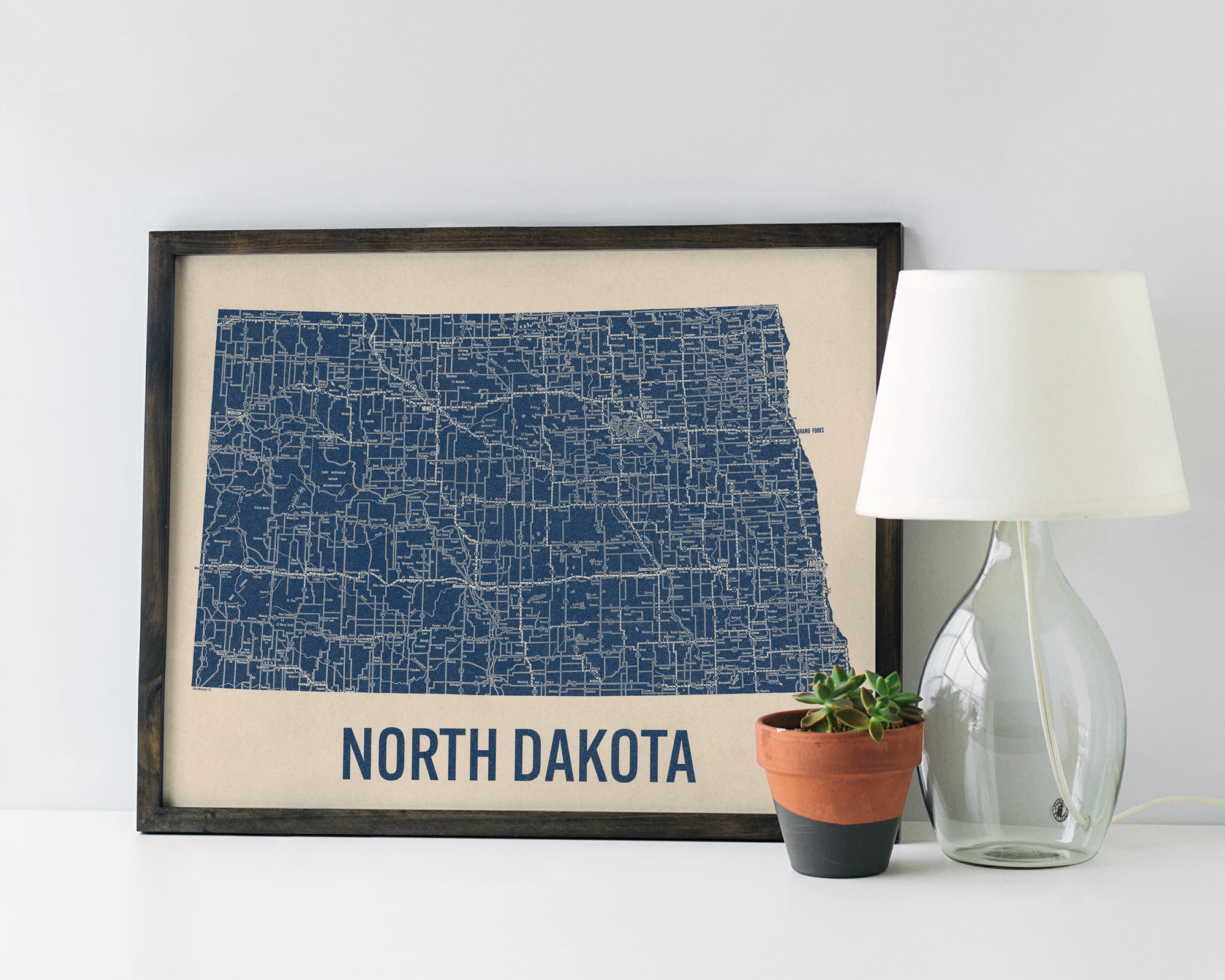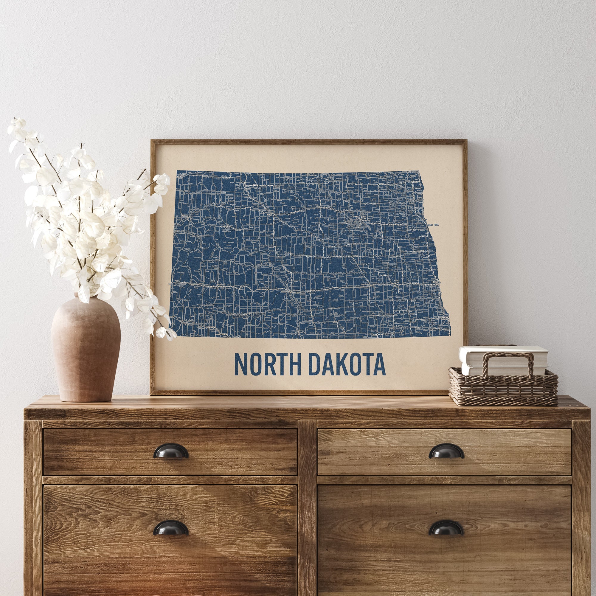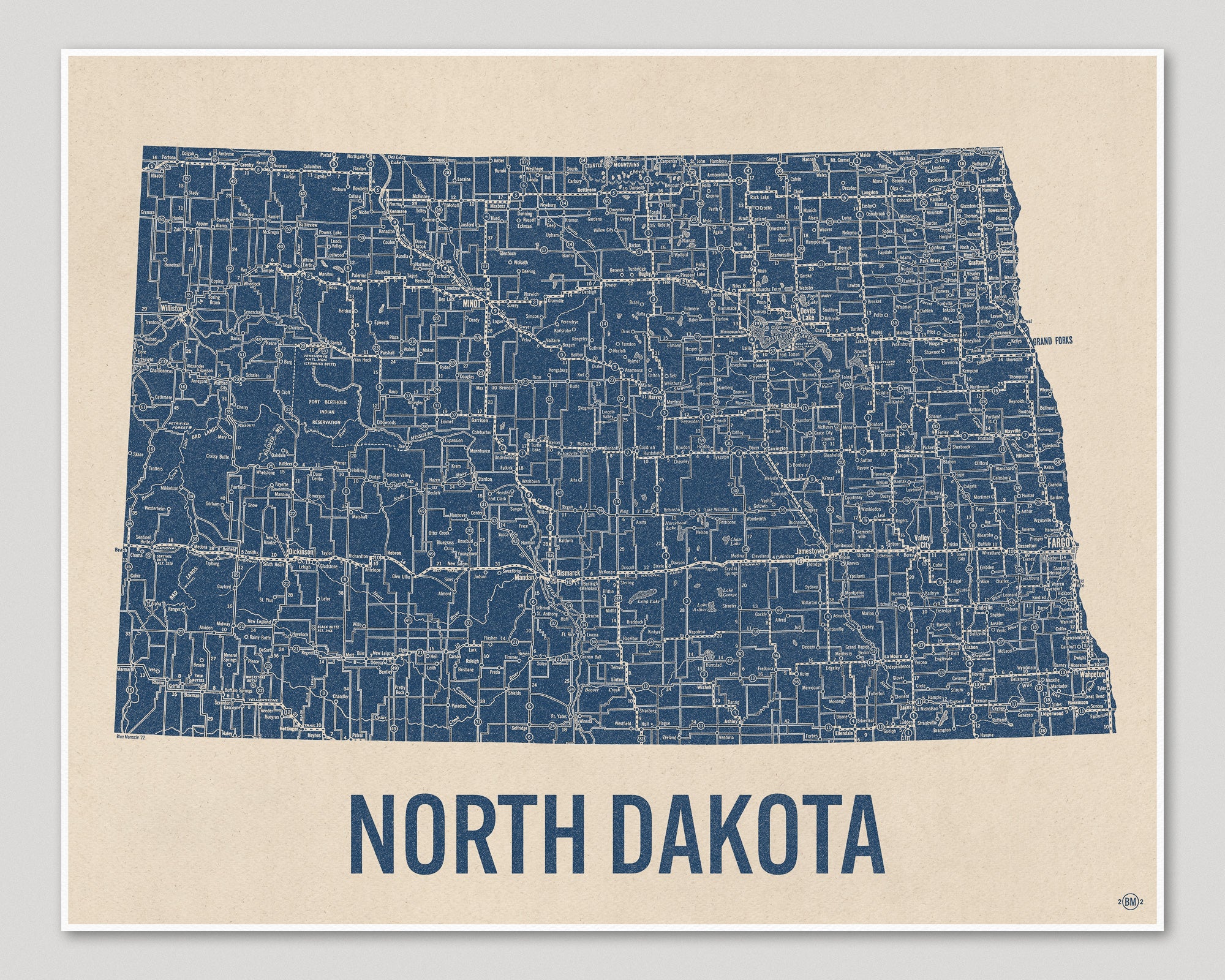 Archival art print based on a vintage 1930s highway map of North Dakota, blue on beige.