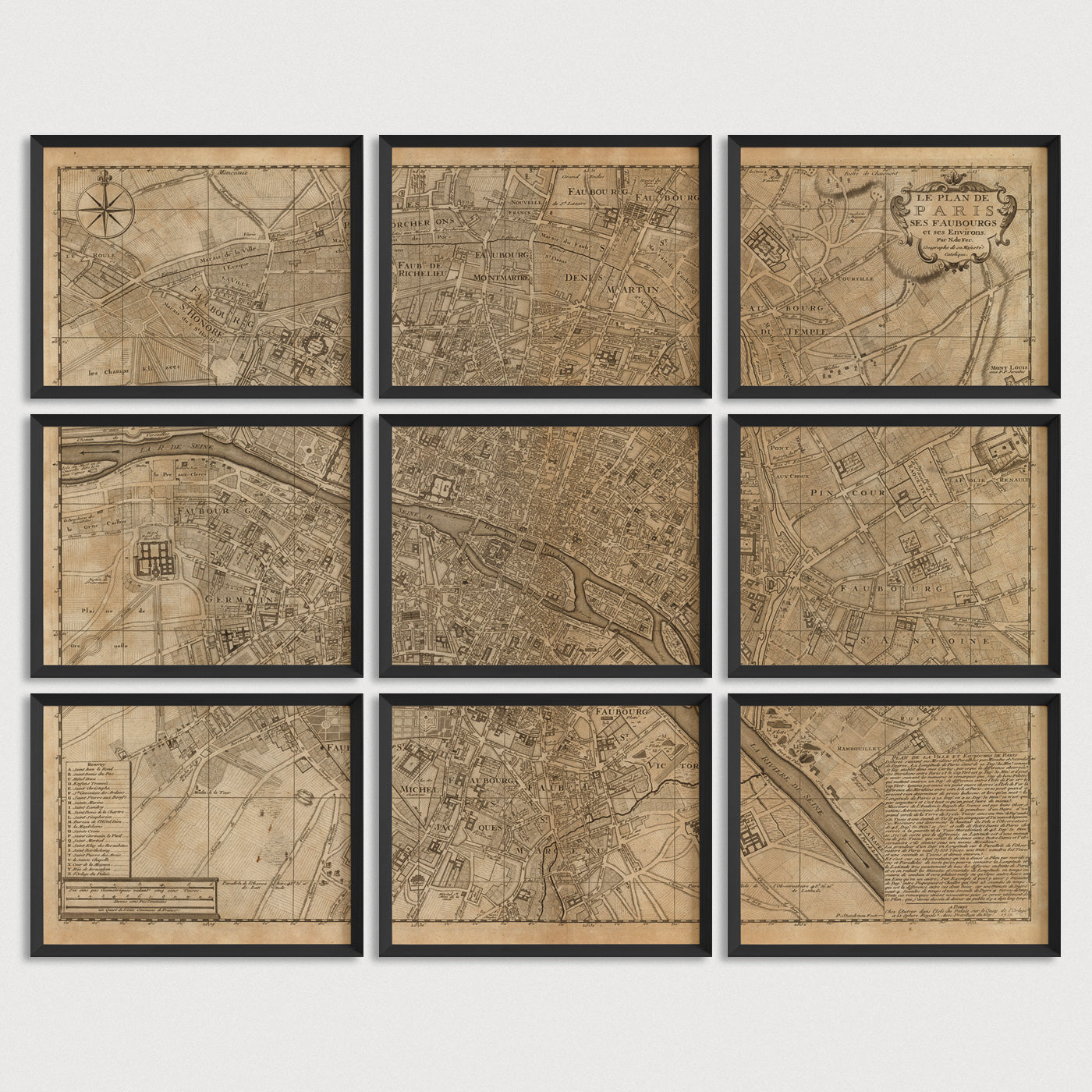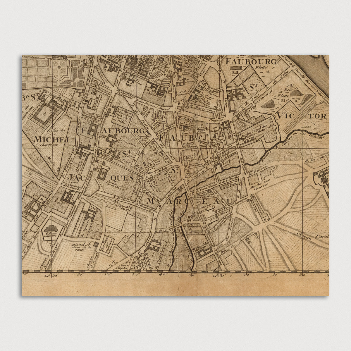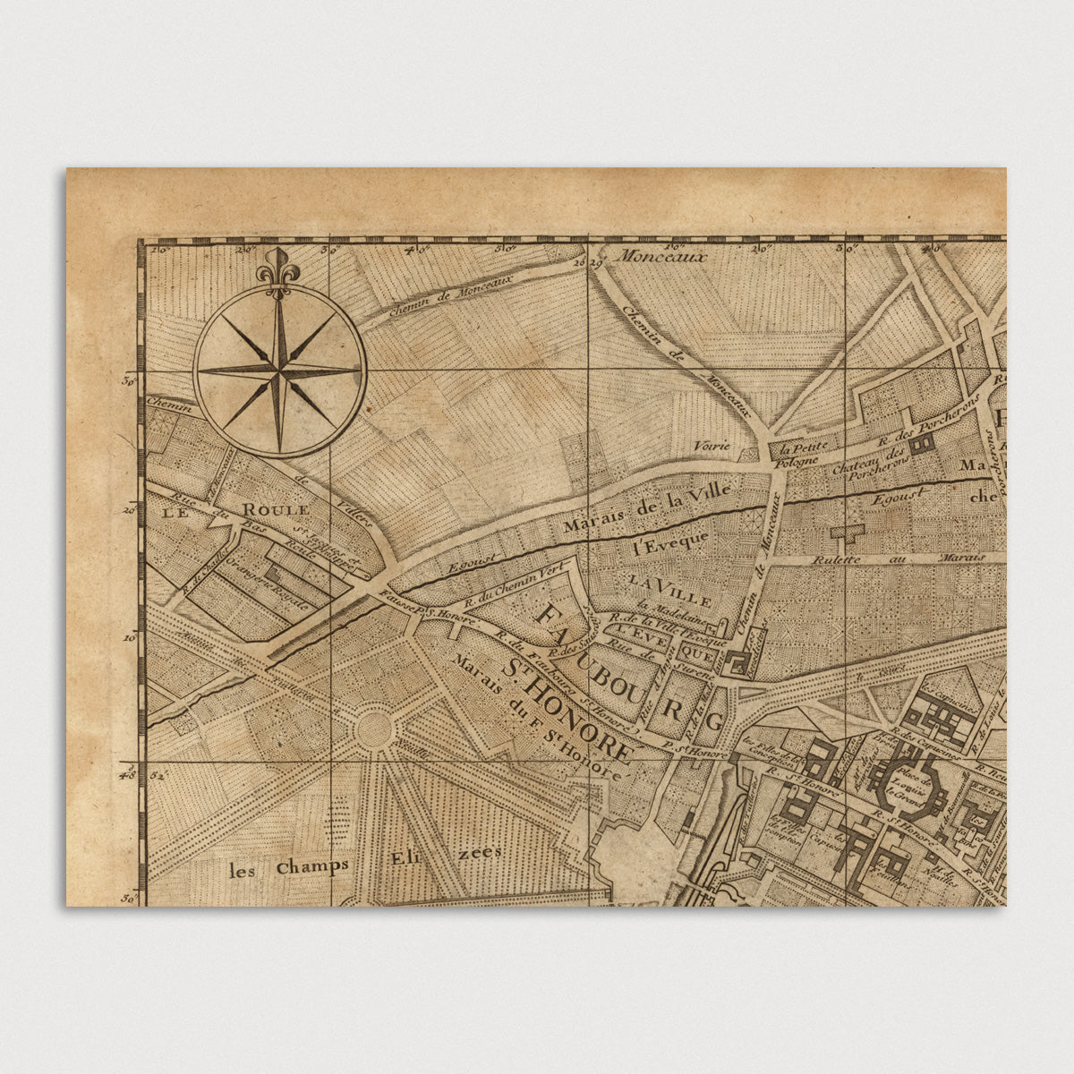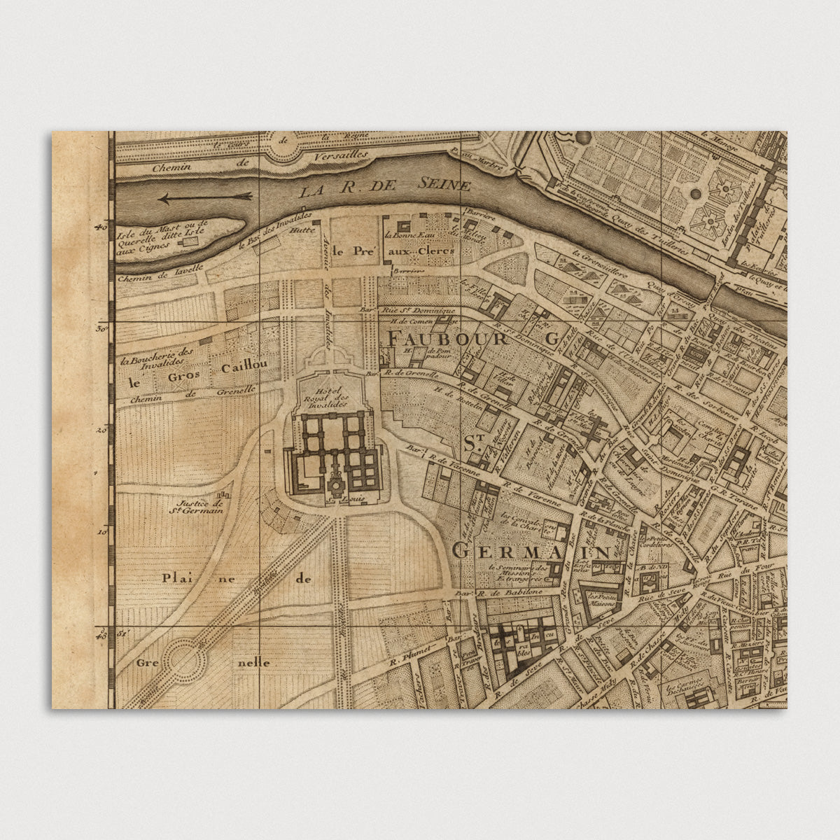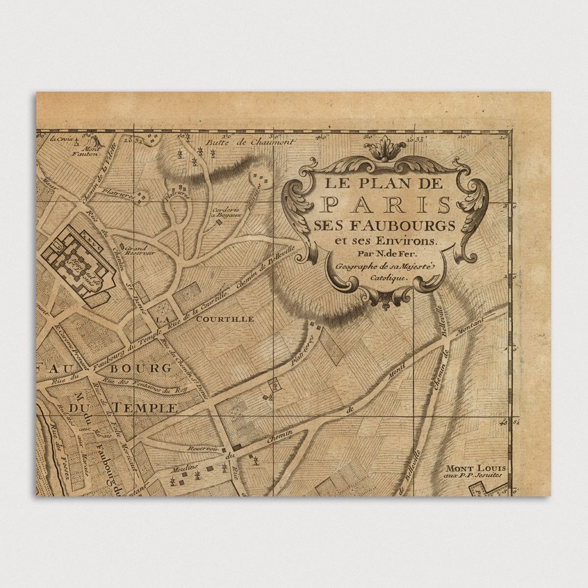 Archival print reproduction of an antique map of Paris, France from 1717 by Nicolas de Fer. The map is full of many details, including numerous buildings, churches, parks, labels for most streets, and the names of the surrounding faubourgs (or suburbs), all of which are now neighborhoods within the present-day city. A list of places of interest is shown in the lower left.