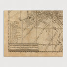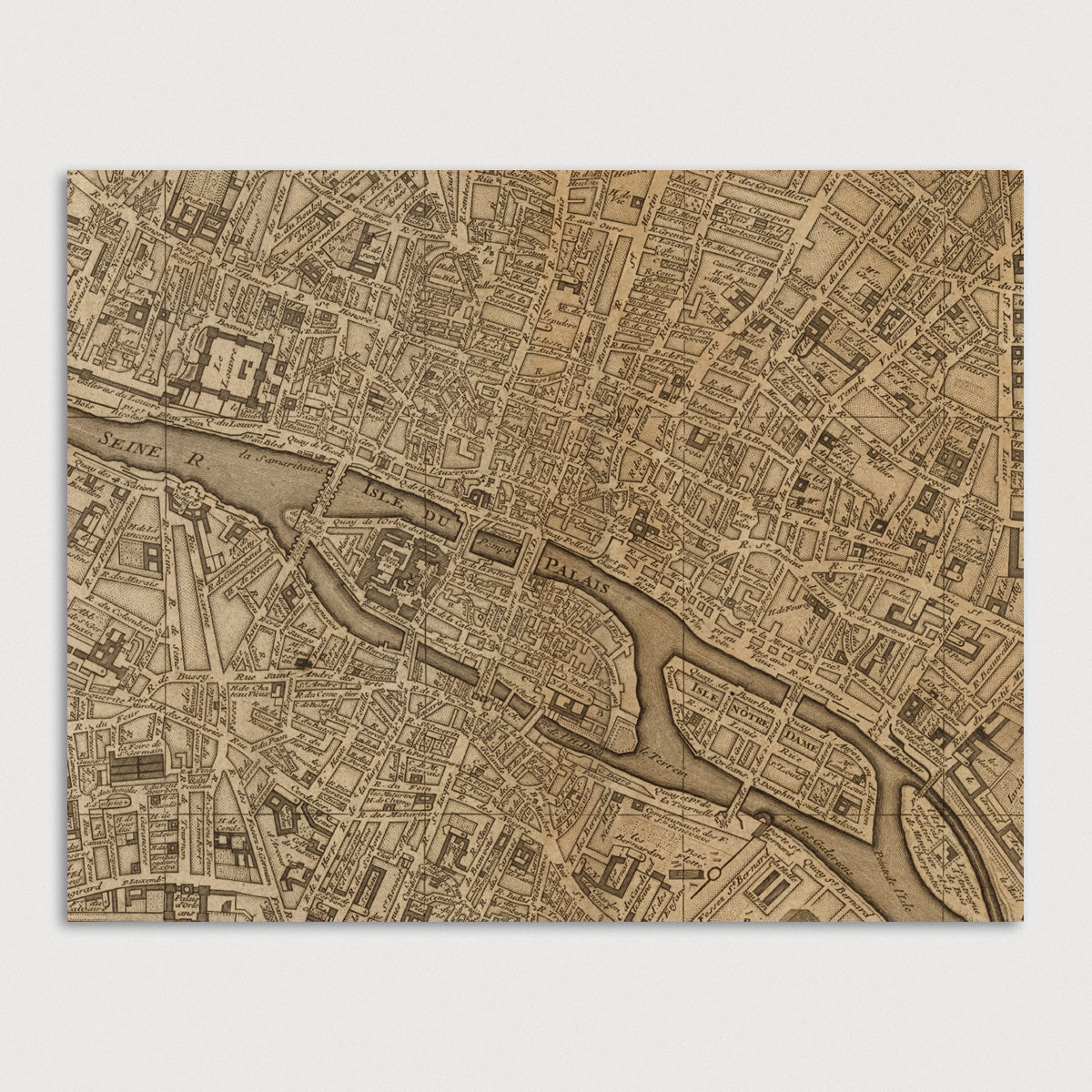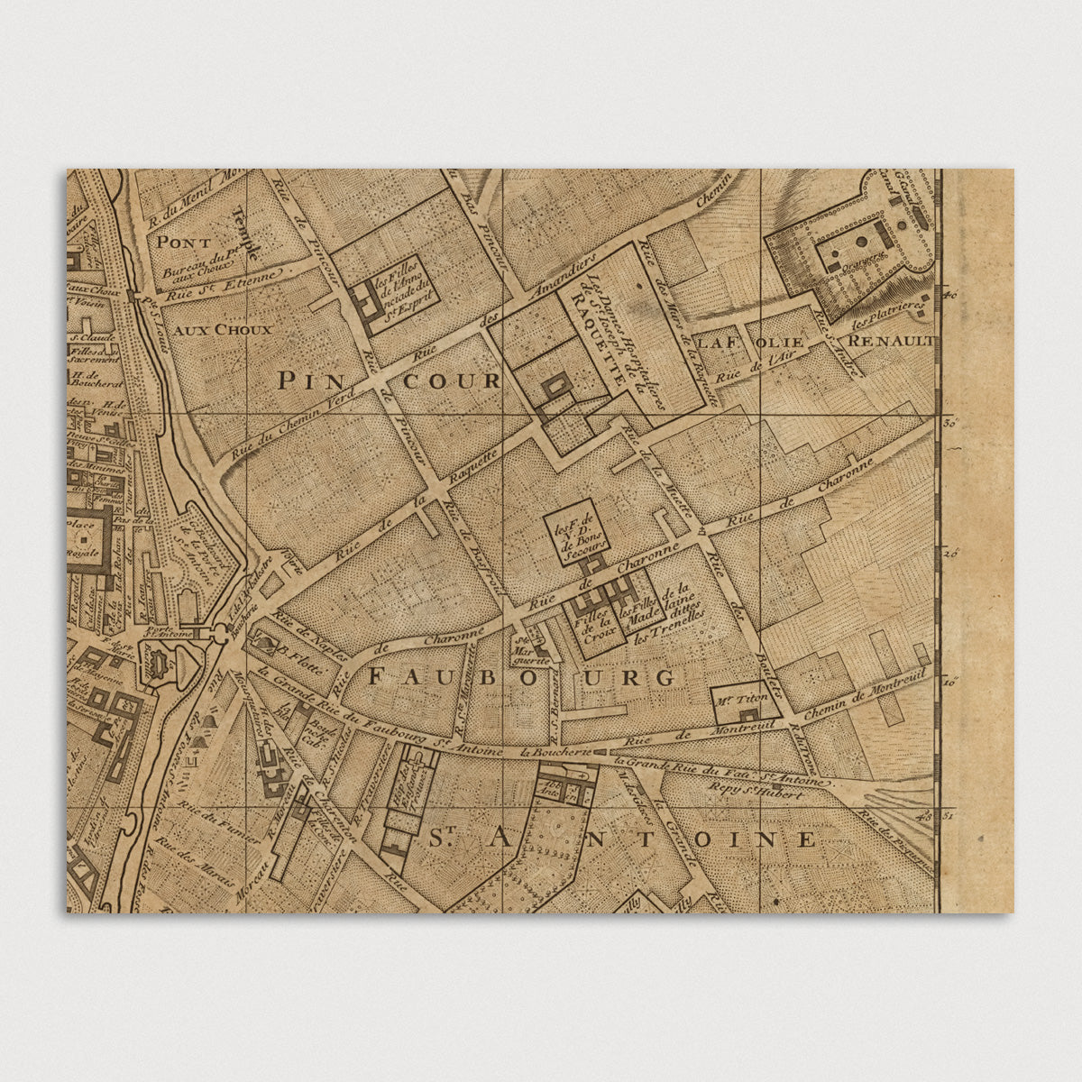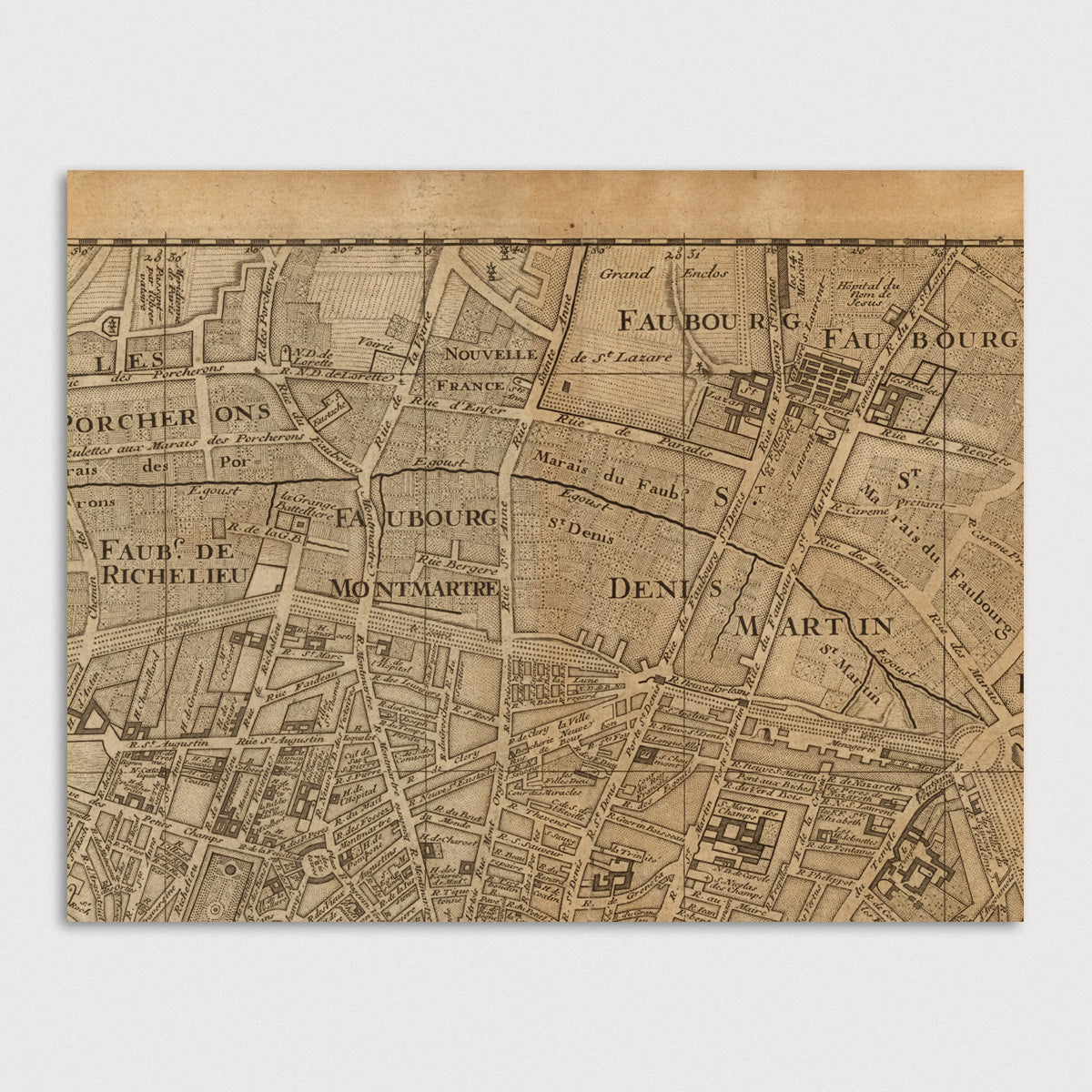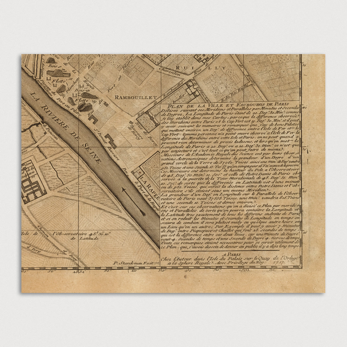 Archival print reproduction of an antique map of Paris, France from 1717 by Nicolas de Fer. The map is full of many details, including numerous buildings, churches, parks, labels for most streets, and the names of the surrounding faubourgs (or suburbs), all of which are now neighborhoods within the present-day city. A list of places of interest is shown in the lower left.