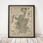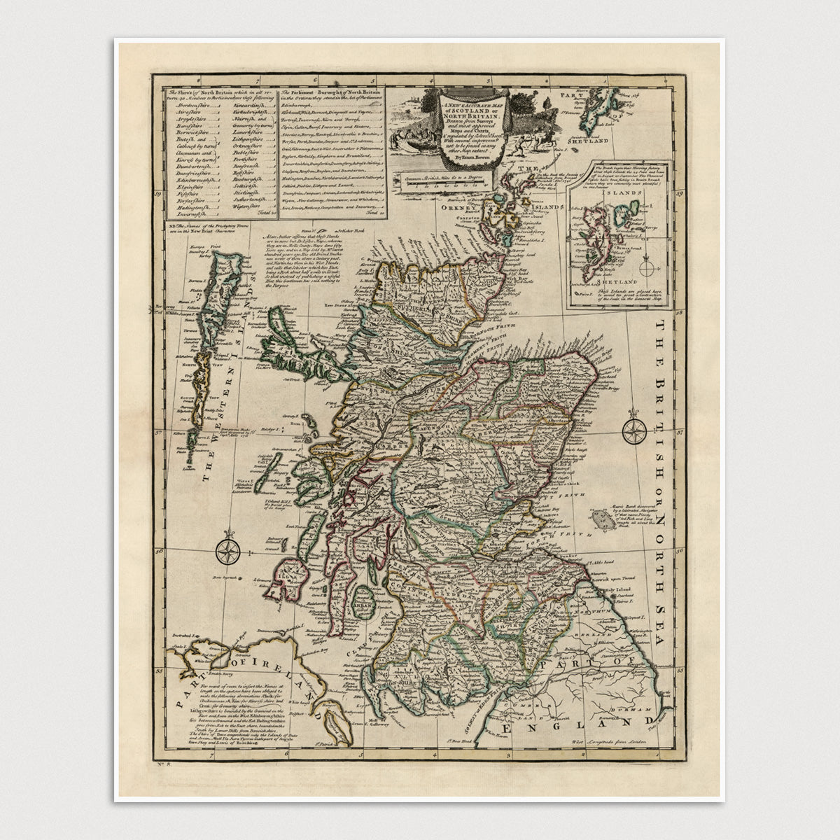 Archival print reproduction of an antique map of Scotland from 1752 by Emanuel Bowen. Includes numerous details, showing the names and locations of cities, towns, roads, bays, rivers, islands, and shires. An inset chart in the upper left lists the names of 30 shires and 15 Parliament boroughs, and an inset map at upper right shows the Shetland Islands.