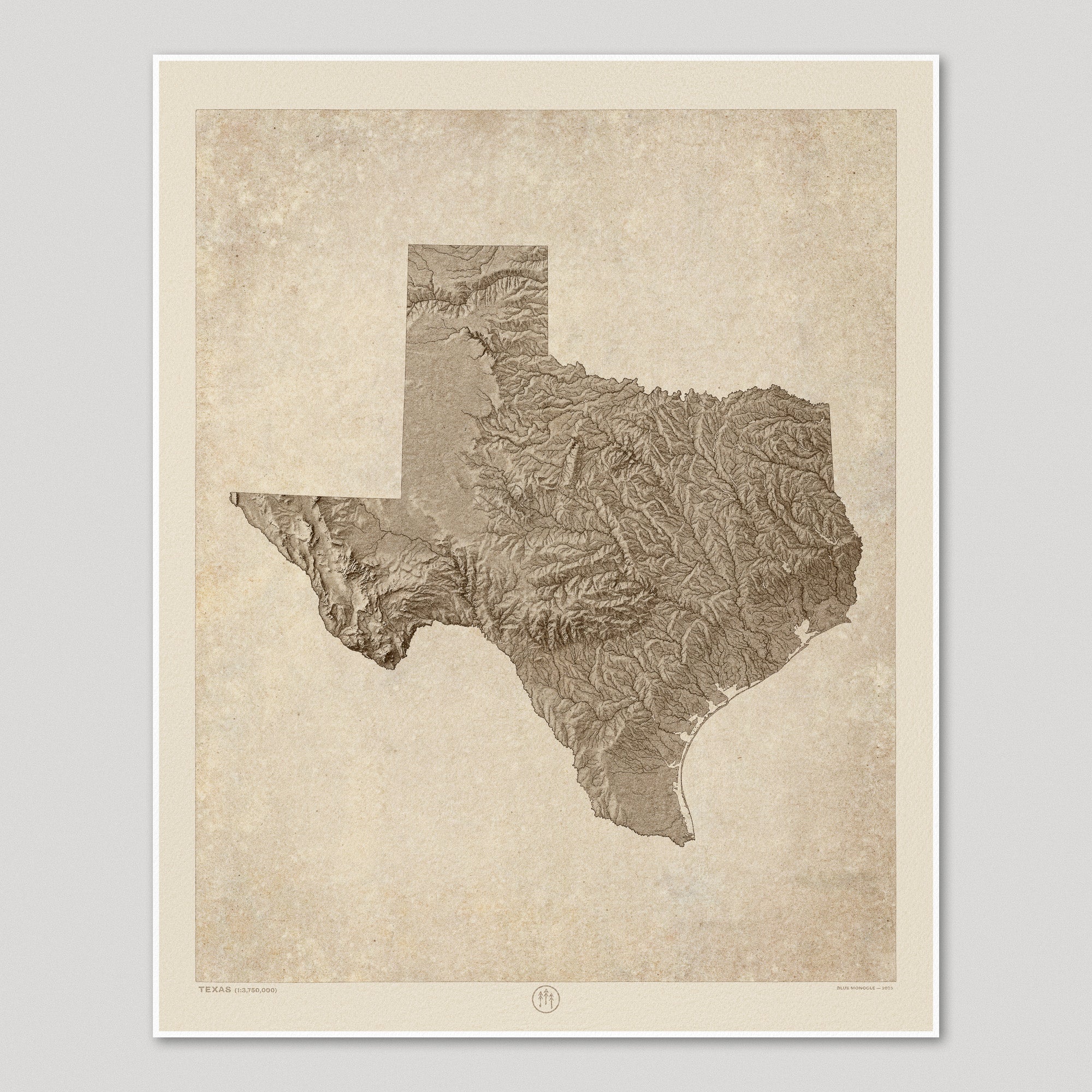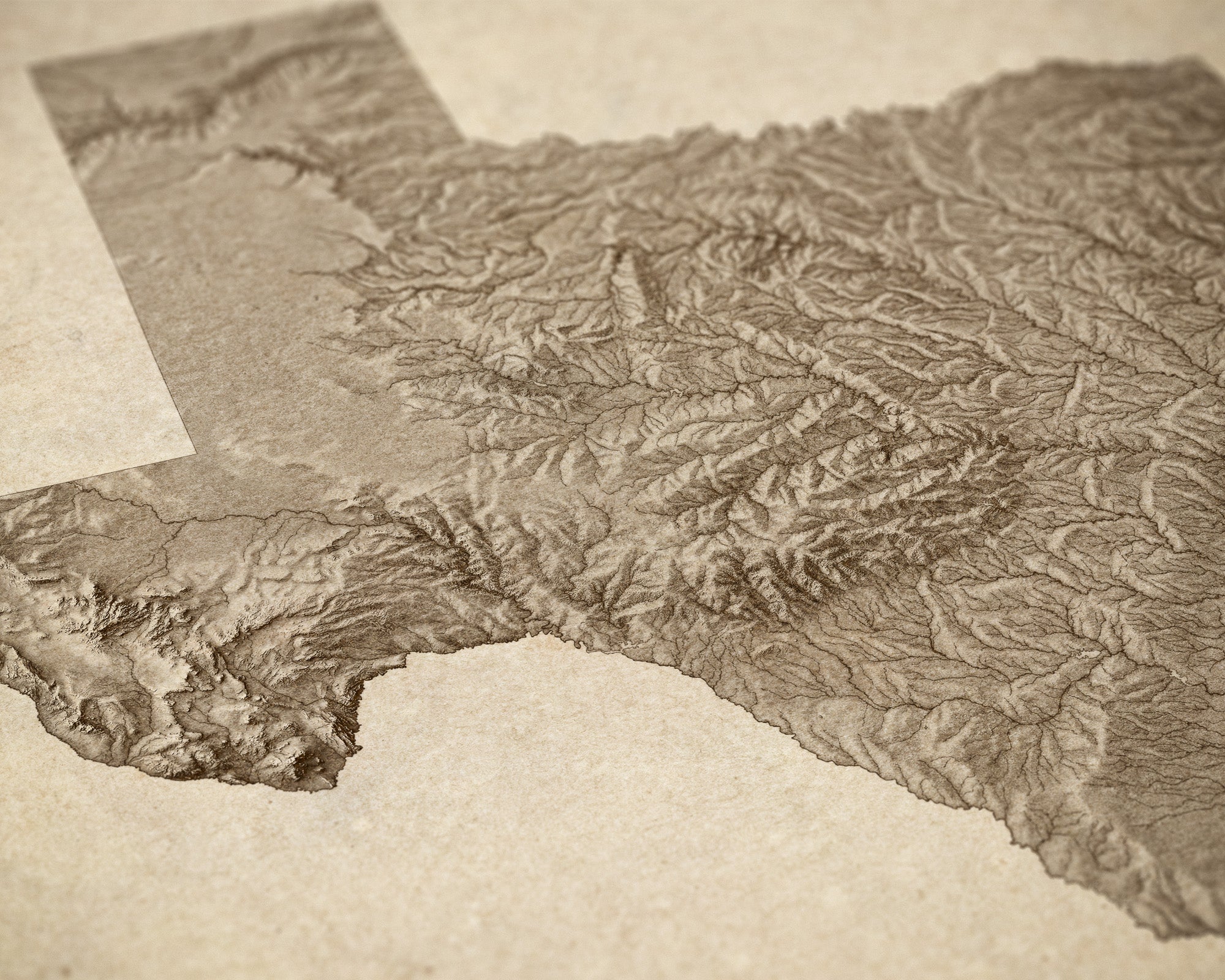 Archival art print of a modern shaded relief map of Texas in a rustic, vintage sepia style. The map focuses on landforms with highly-detailed depictions of mountains, valleys, canyons, lakes and rivers.