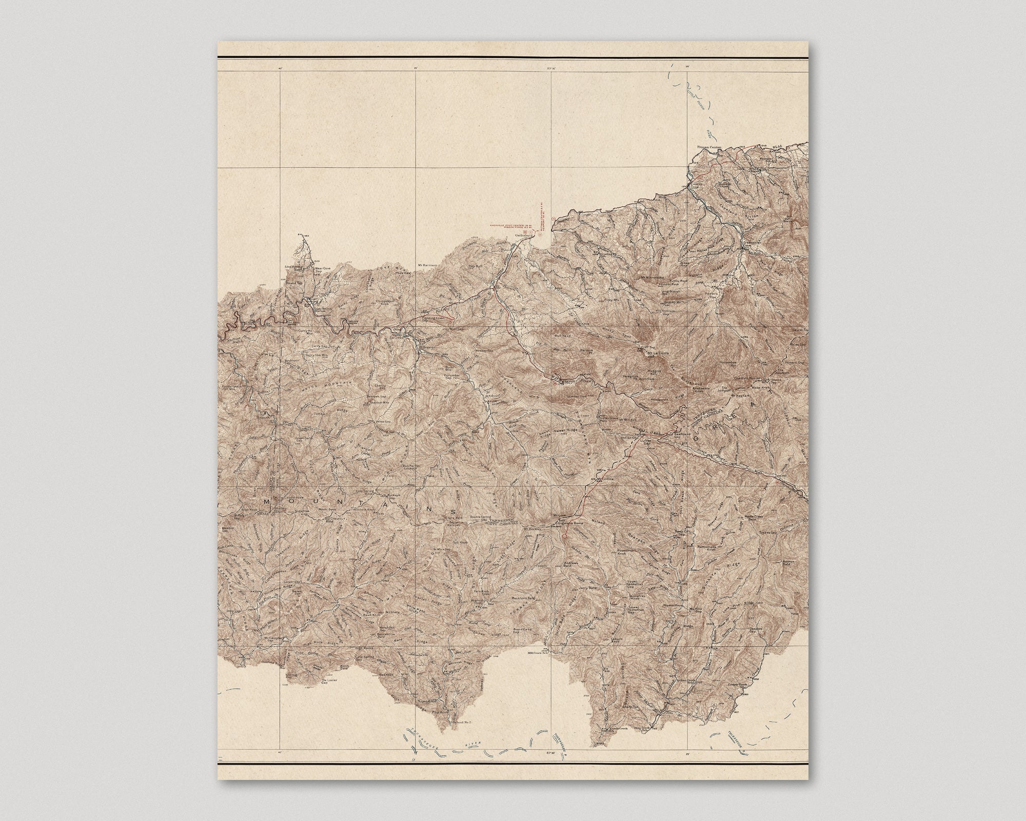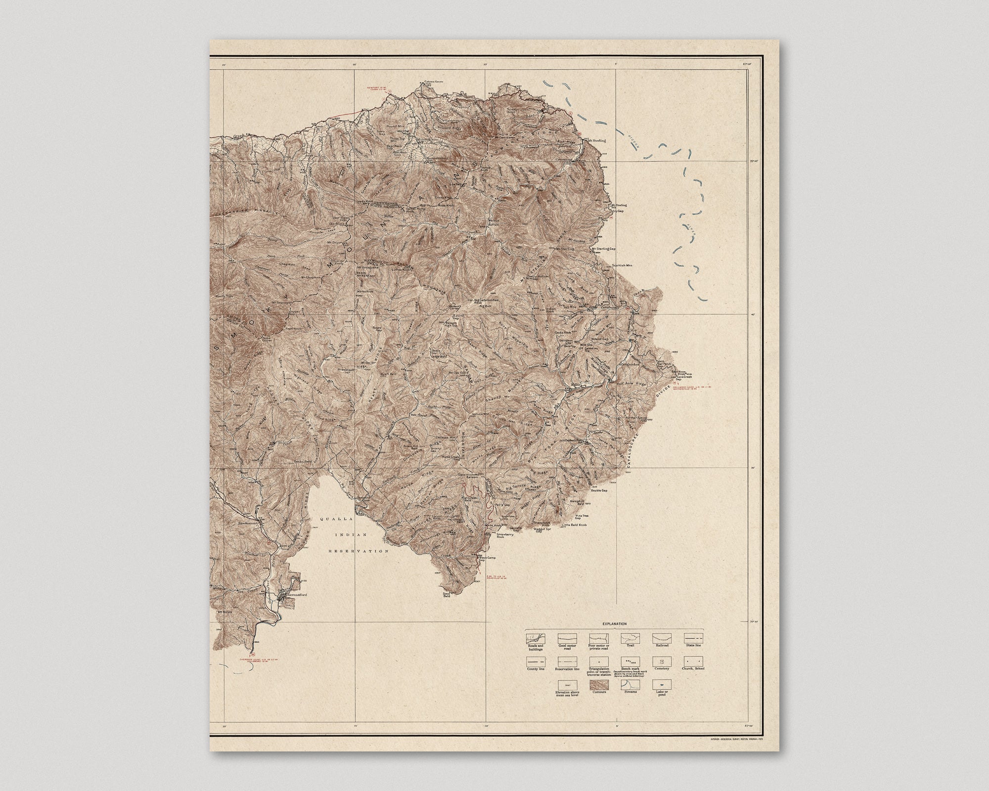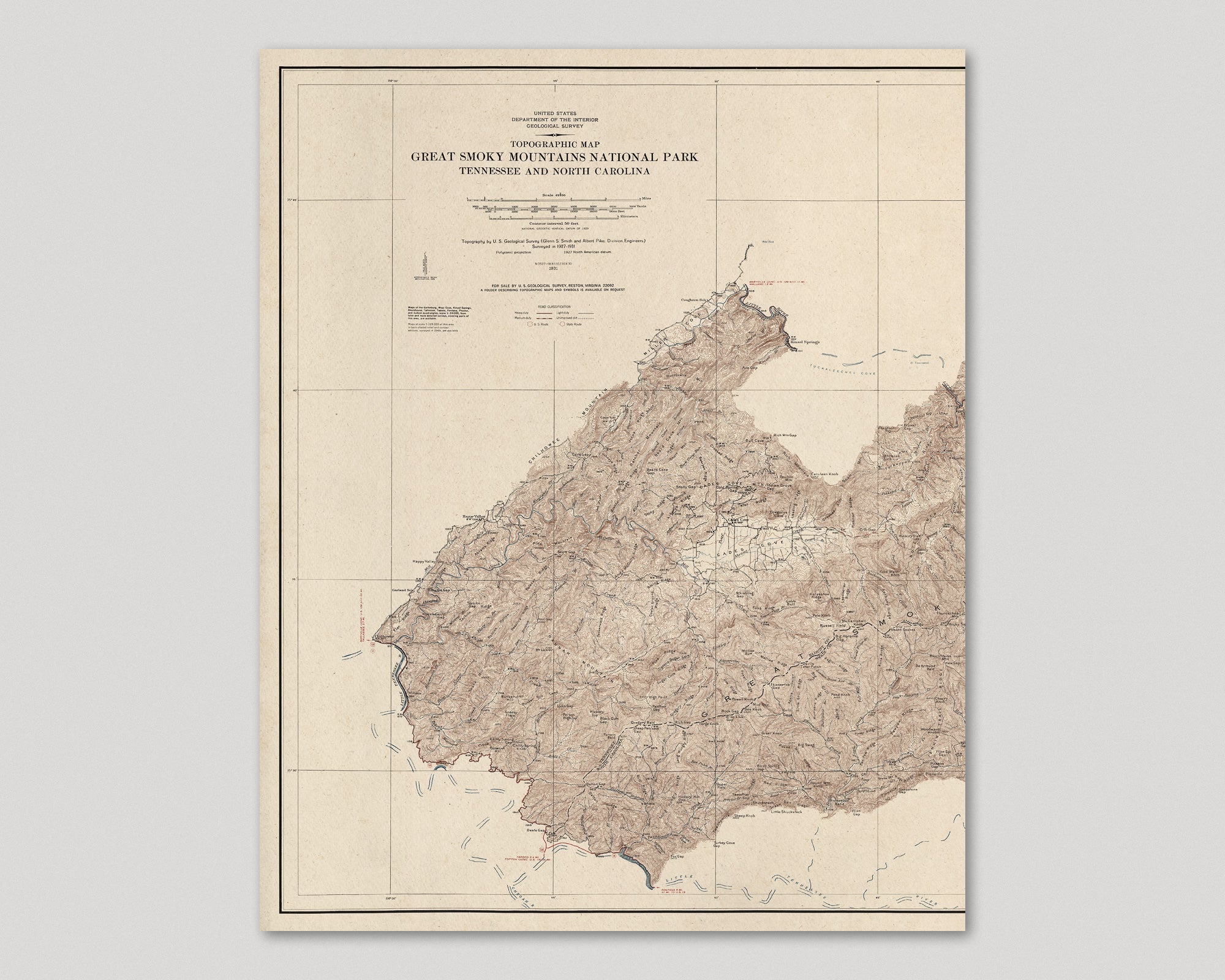 Archival print reproduction of an antique map of Great Smoky Mountains National Park from 1931 by the US Geological Survey.