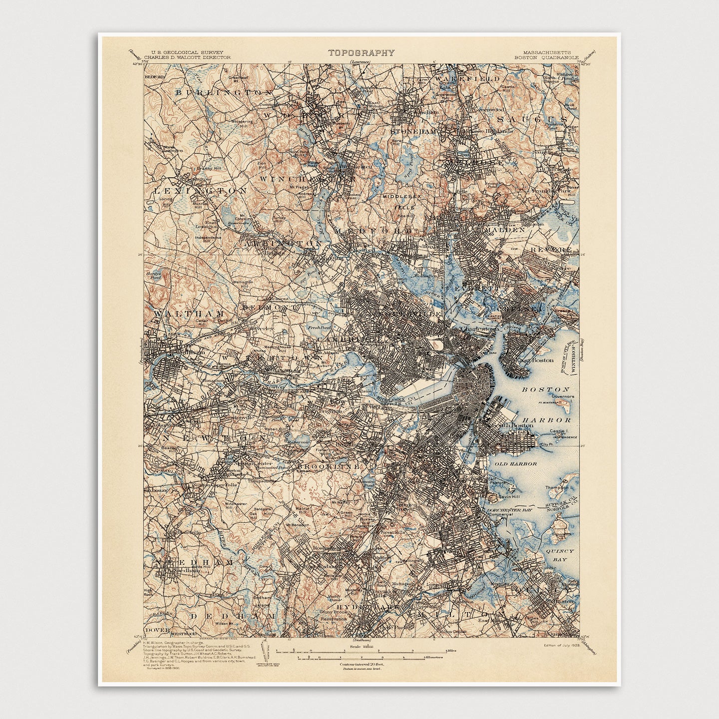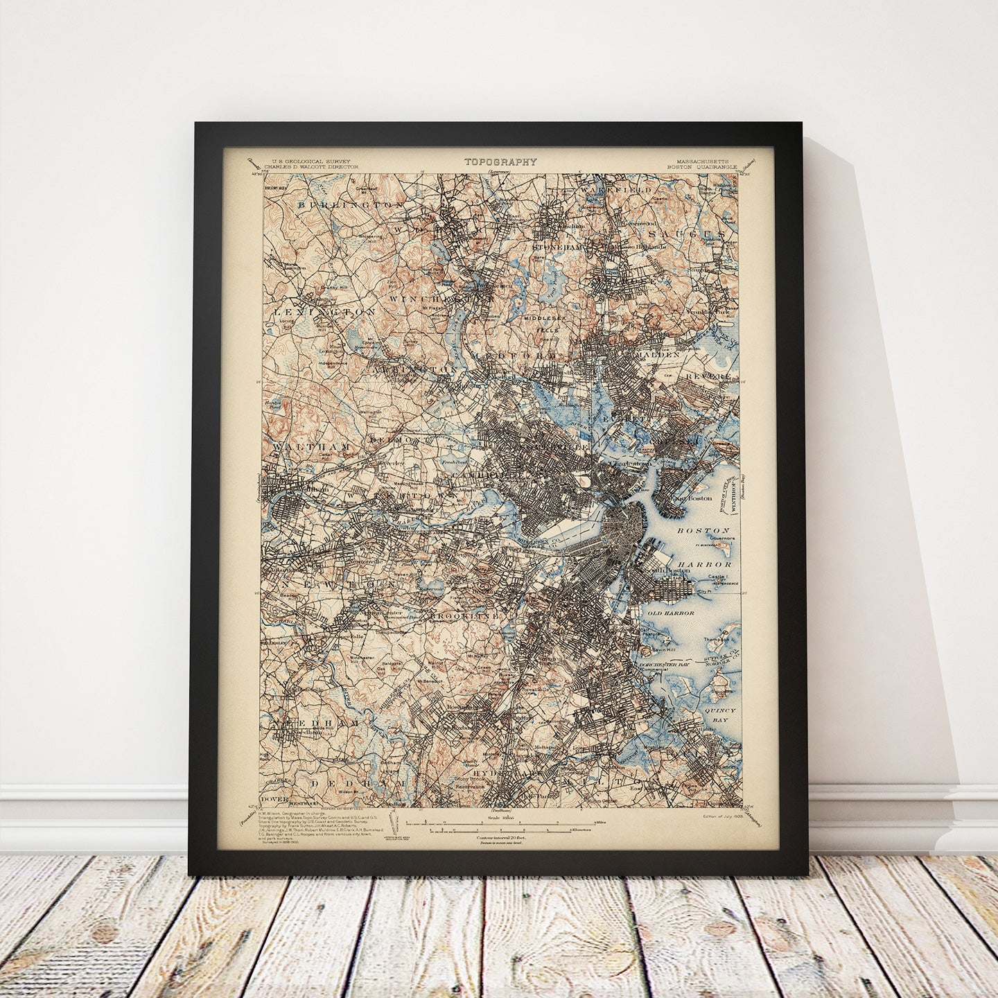 Archival print reproduction of an antique map of Boston, Massachusetts from 1903 by the US Geological Survey.