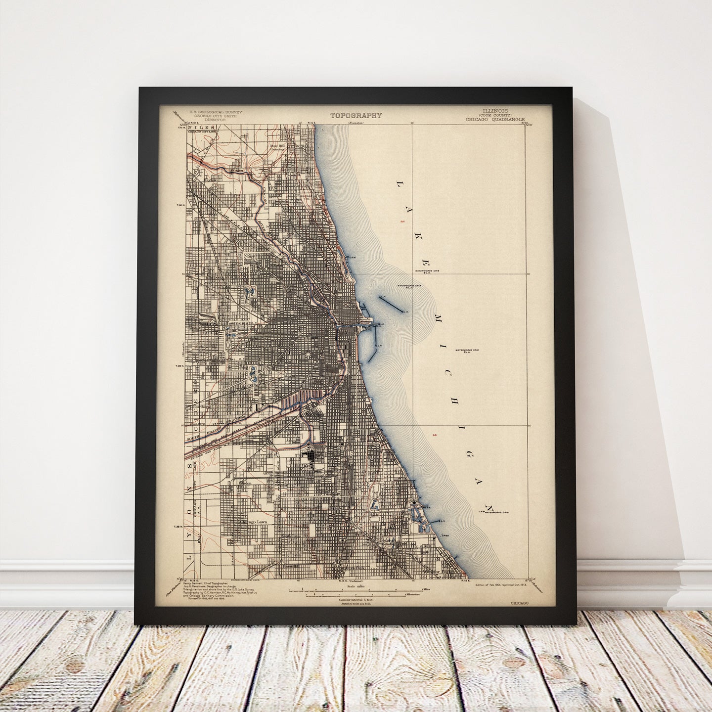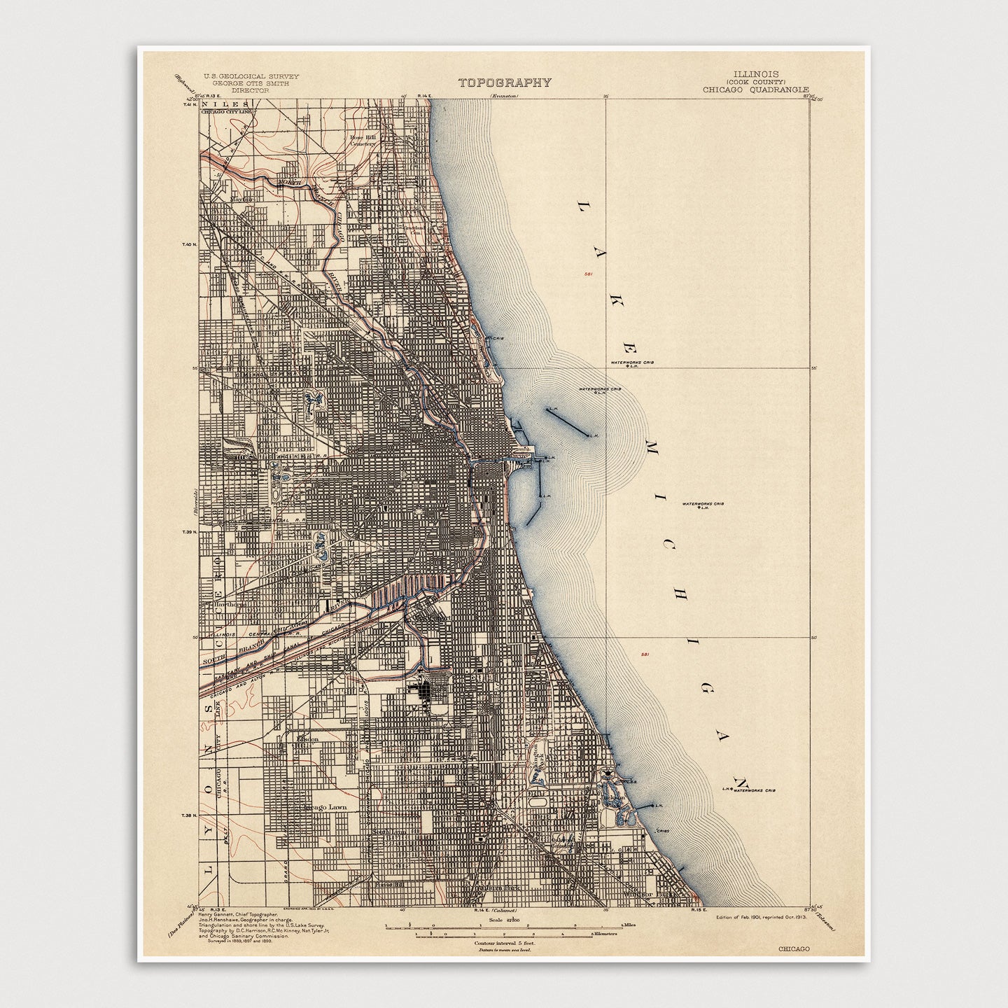 Archival print reproduction of an antique map of Chicago, Illinois from 1901 by the US Geological Survey.