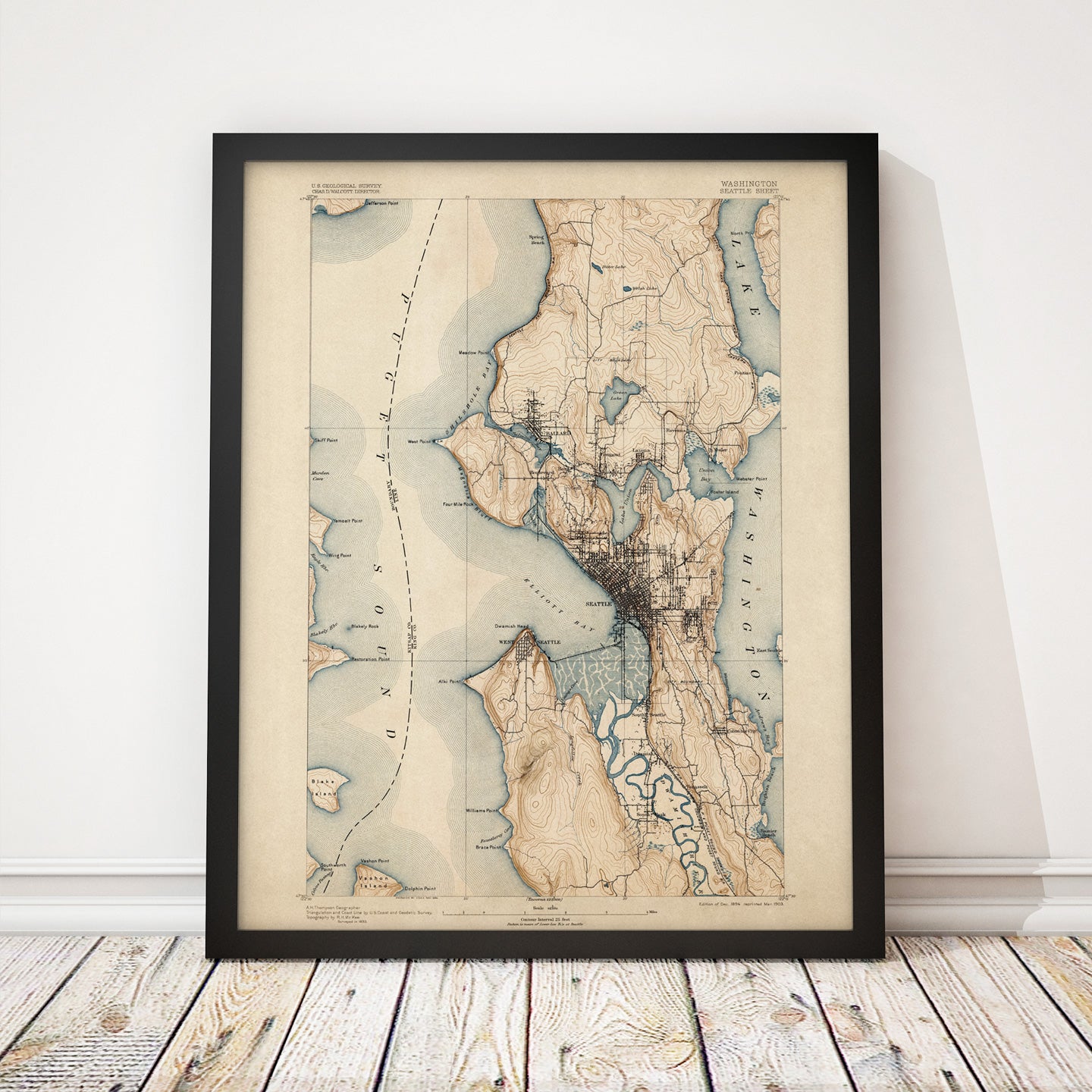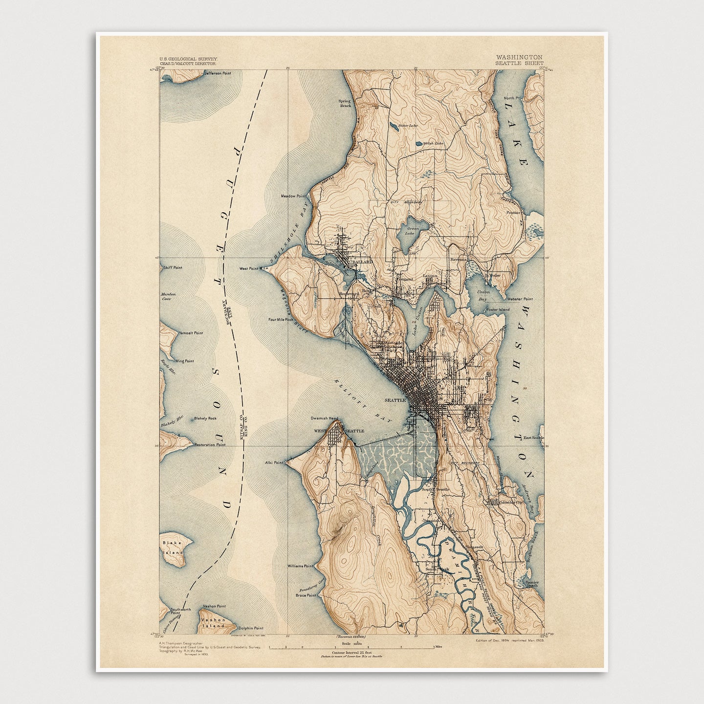 Archival print reproduction of an antique map of Seattle, Washington from 1894 by the US Geological Survey.