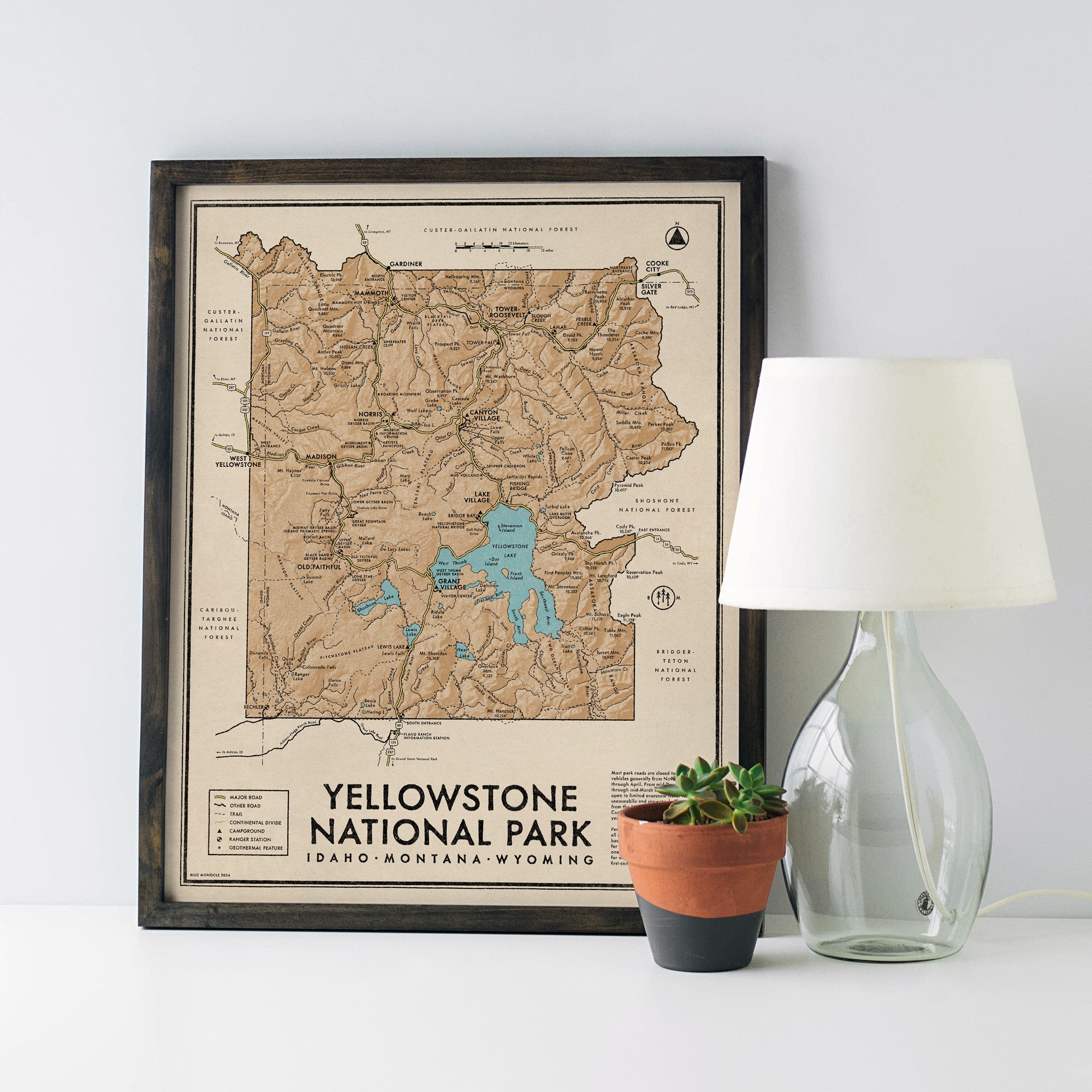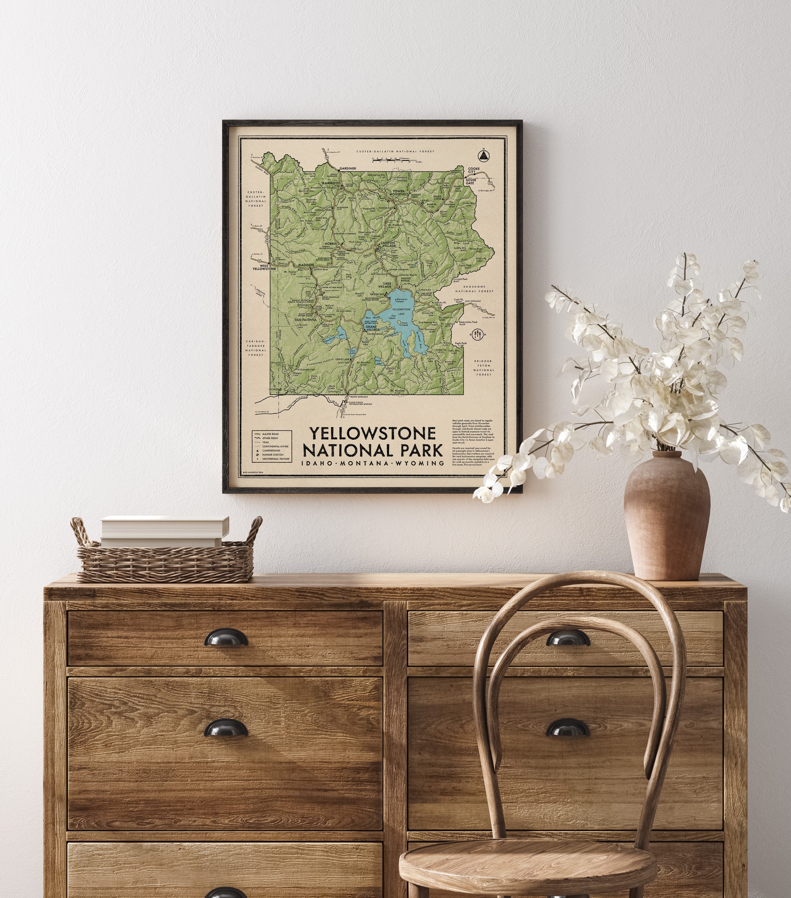 Yellowstone National Park Map Art Print, Green or Brown, Vintage Style
