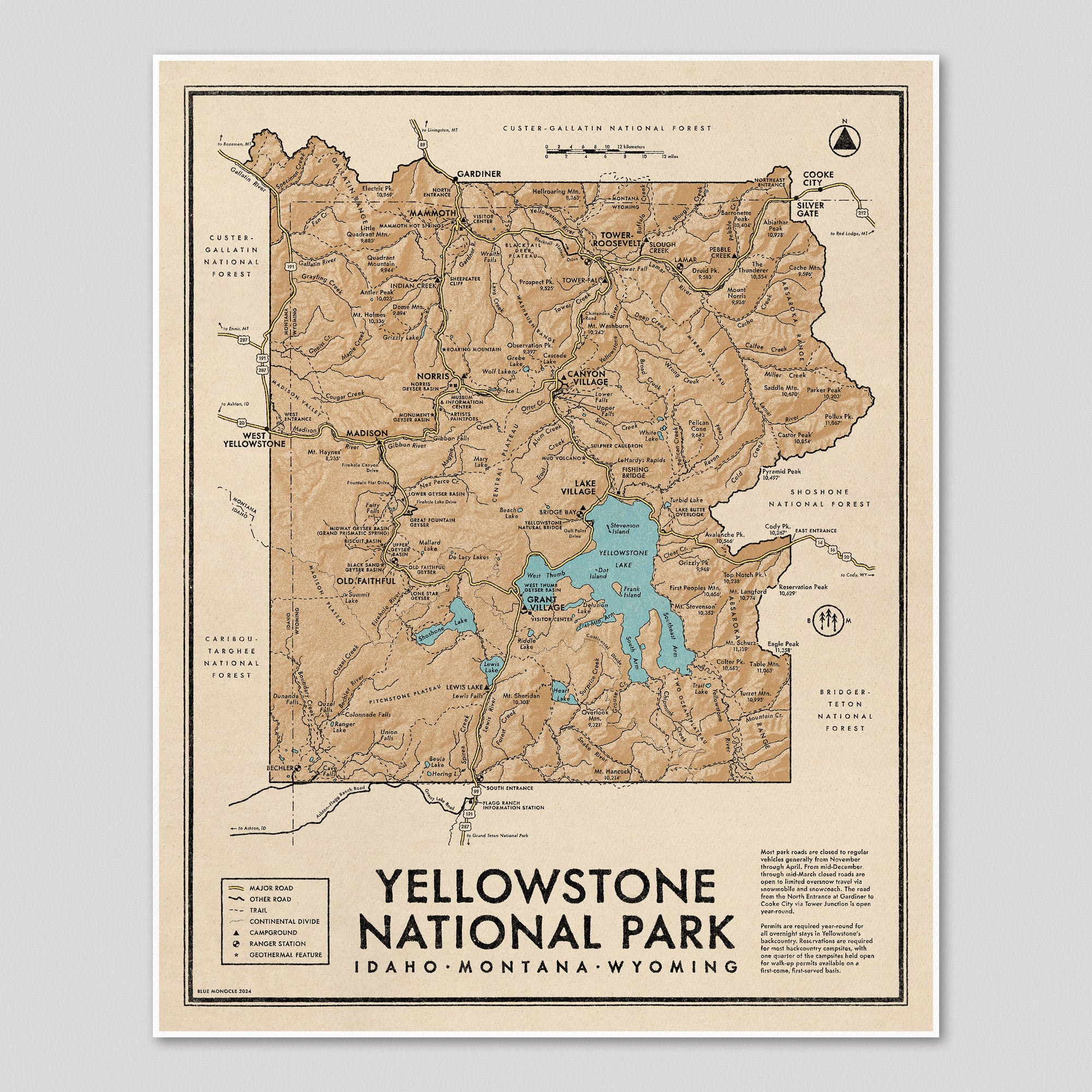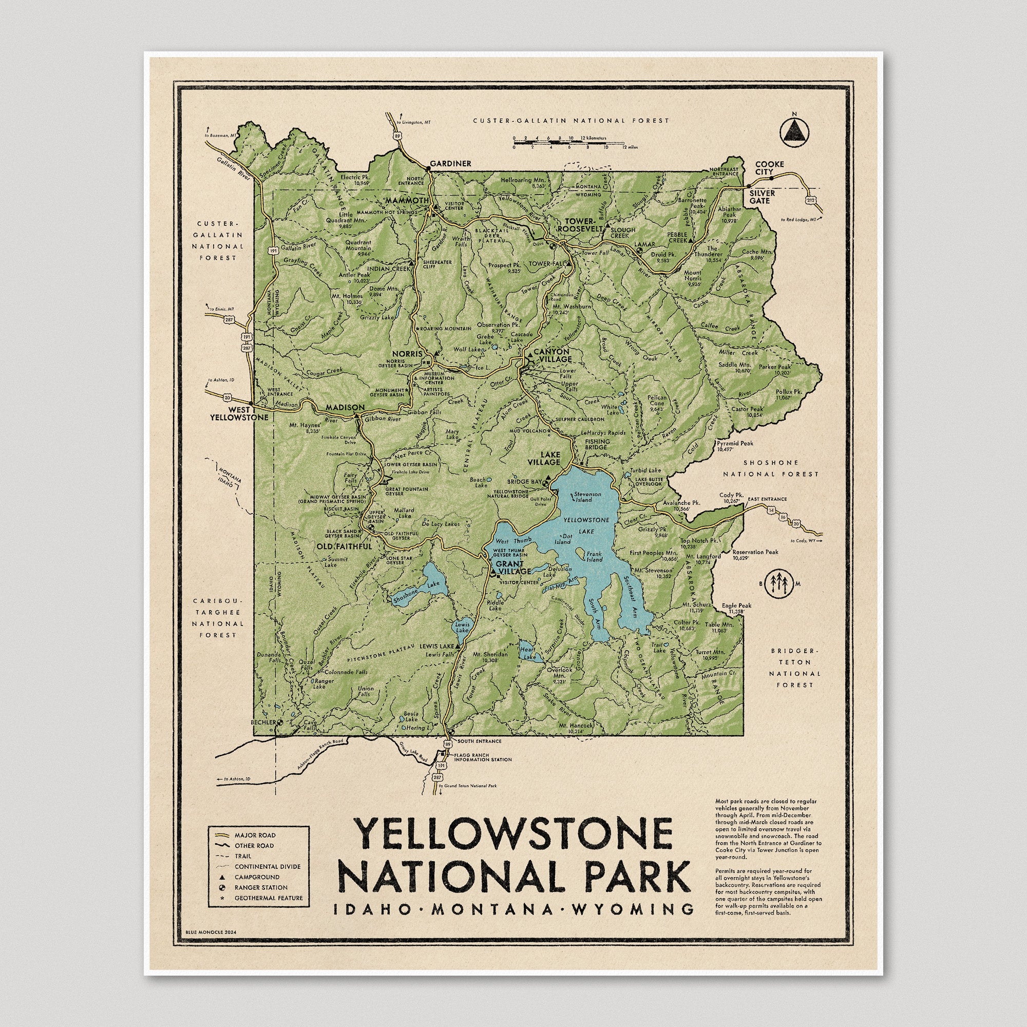 Archival art print of a modern map of Yellowstone National Park made in a vintage style, available in green or brown. Shows many details, including campgrounds, ranger stations, roads, trails, peaks, lakes, and rivers.